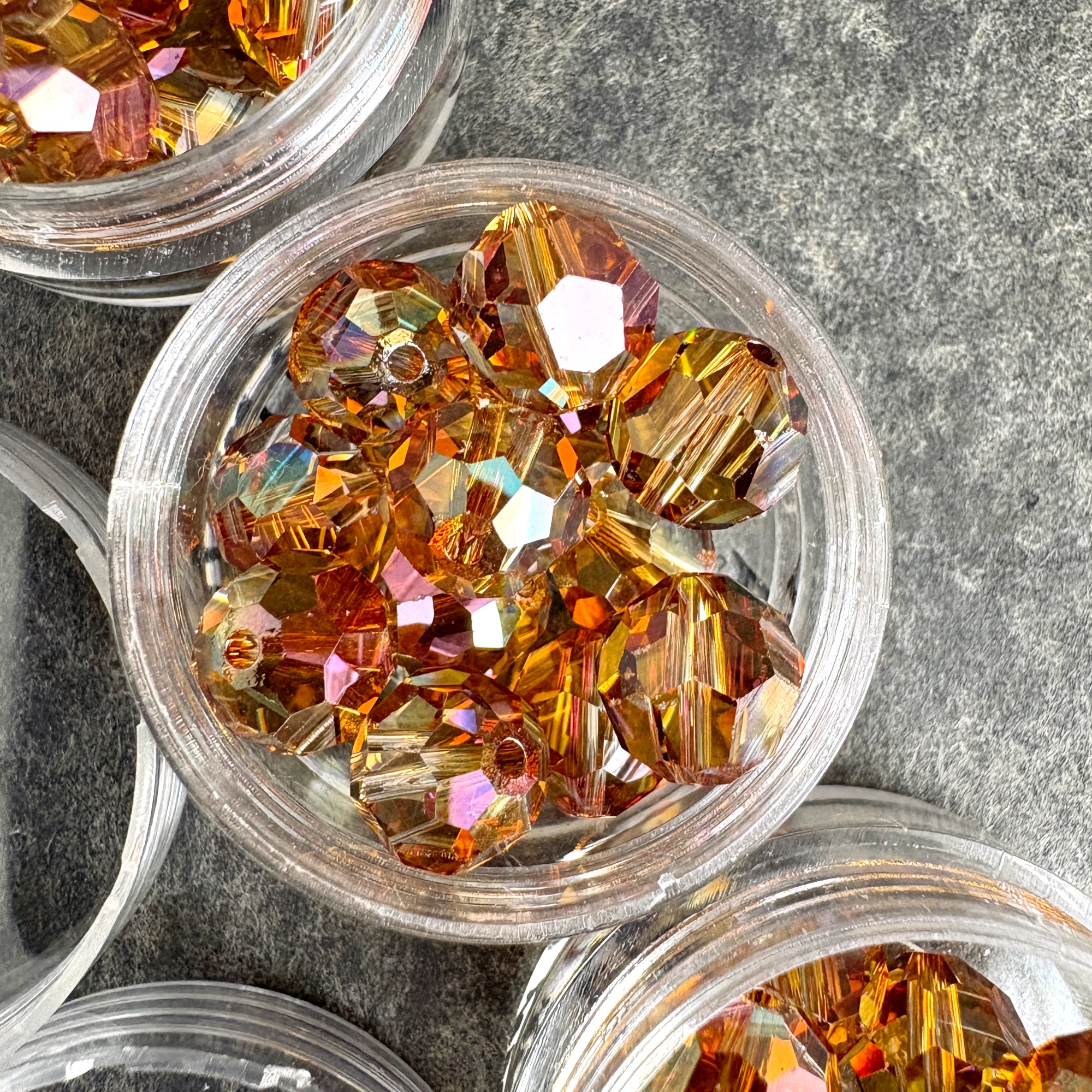 36 faceted 10mm round crystal beads in crystal copper. The beads are packaged in three 1.5" x 0.75" clear round screw lid containers, each with 12 beads. A great opportunity to add to your bead stash.