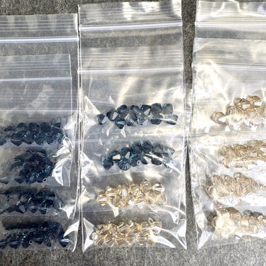 12 bags with 12 beads/bag of 6mm bicone crystal beads for a total of 144 beads.