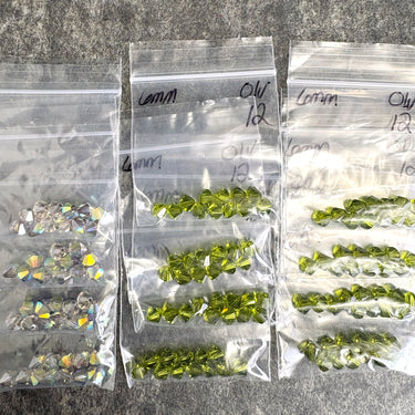 12 bags with 12 beads/bag of 6mm bicone crystal beads for a total of 144 beads.