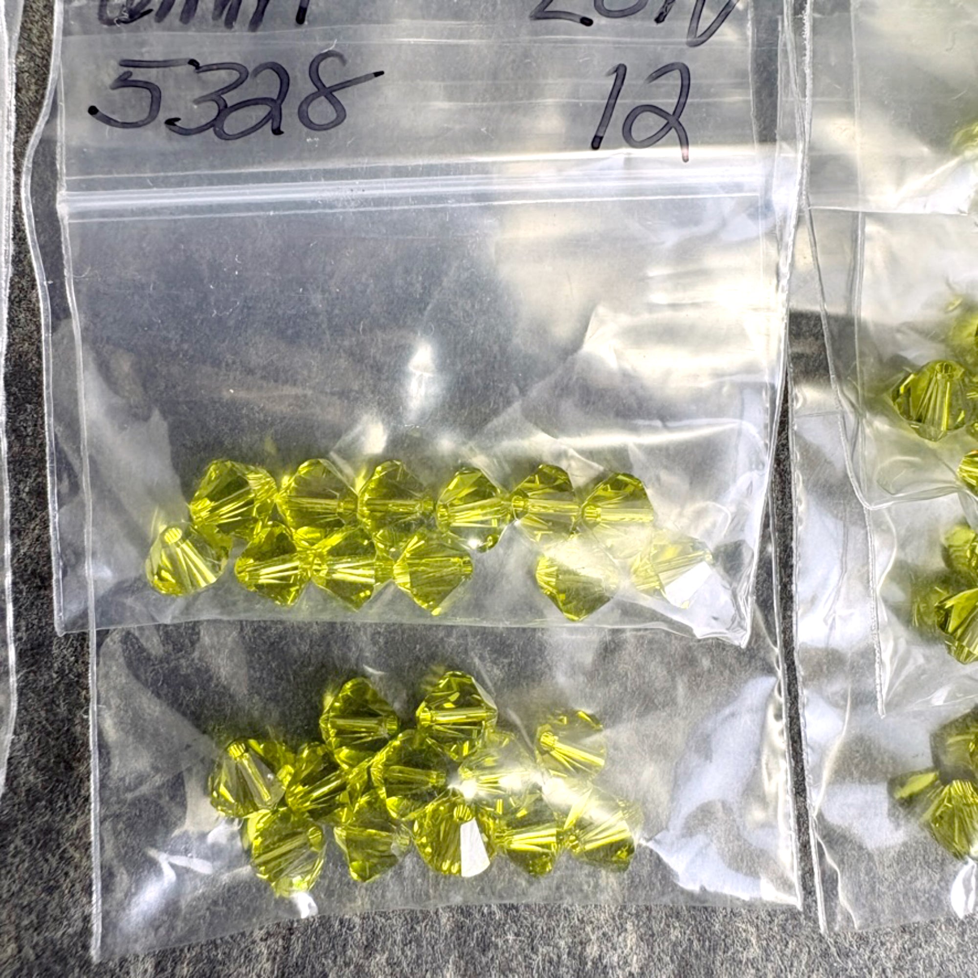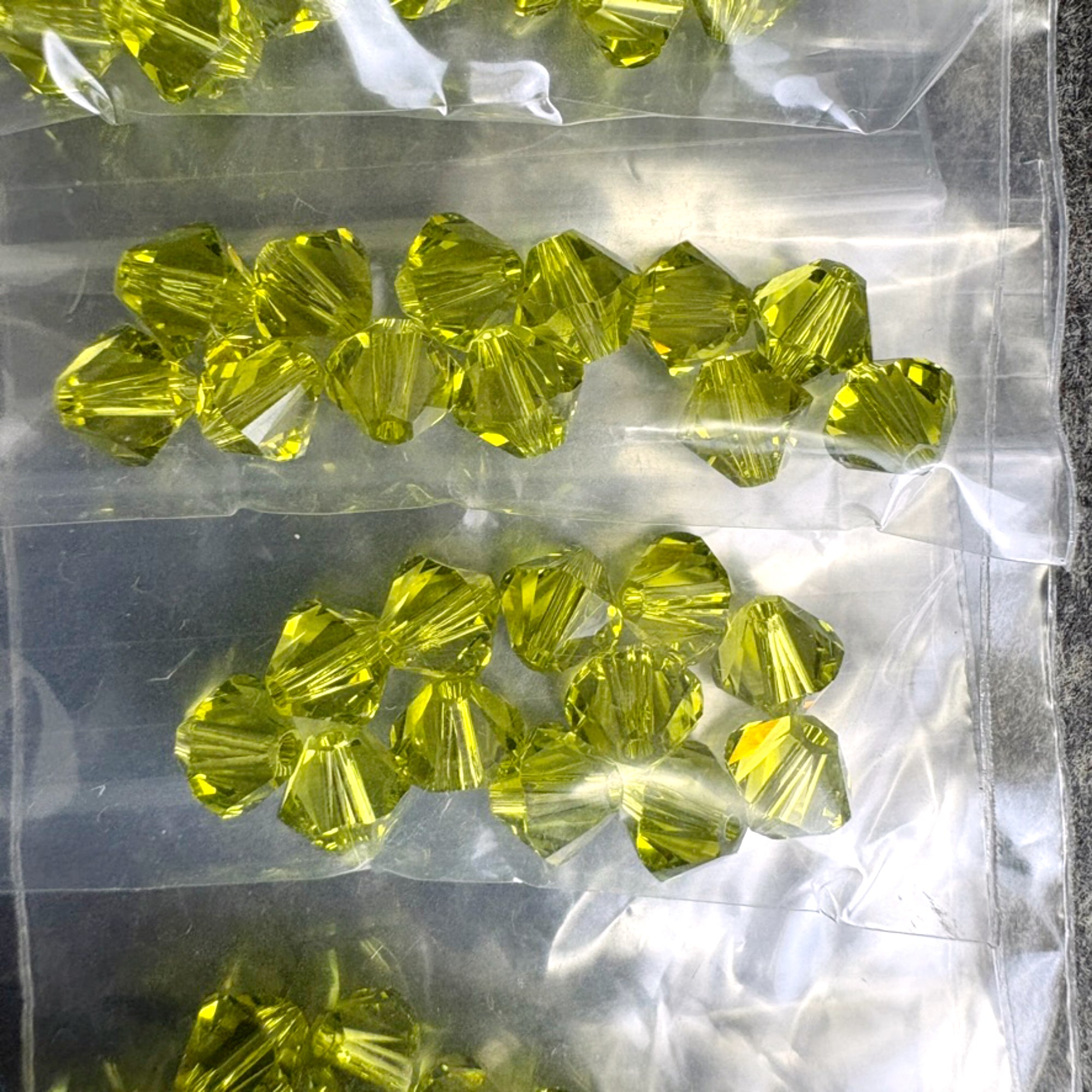 192 bicone crystal beads 6mm - lt olivine, topaz - Swarovski? - destash lot