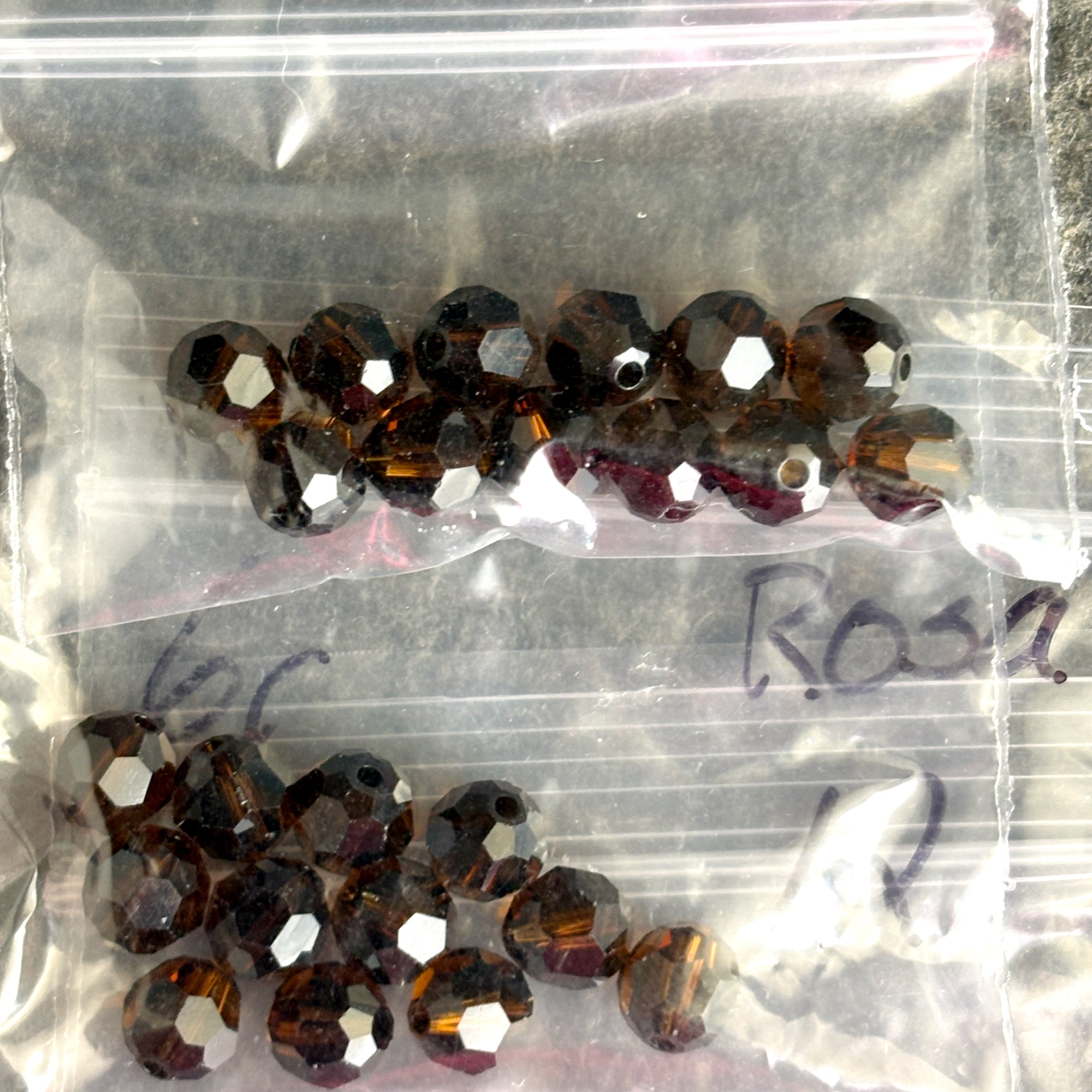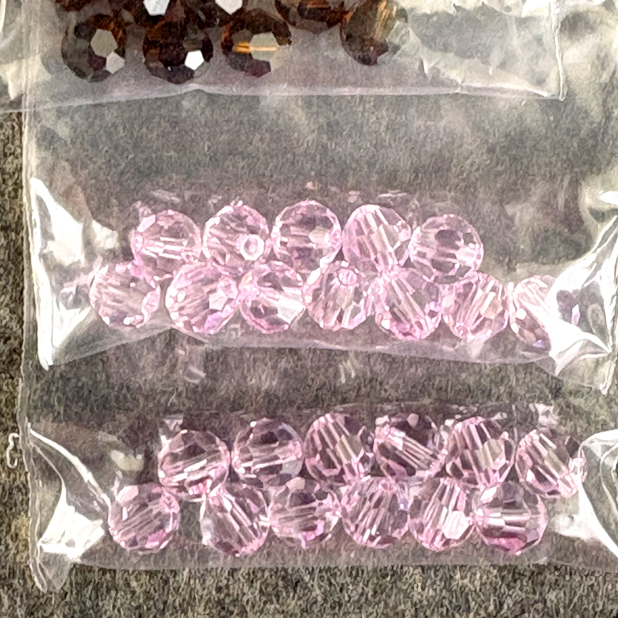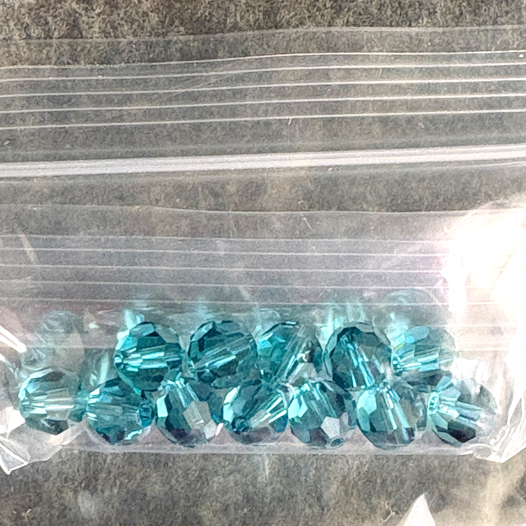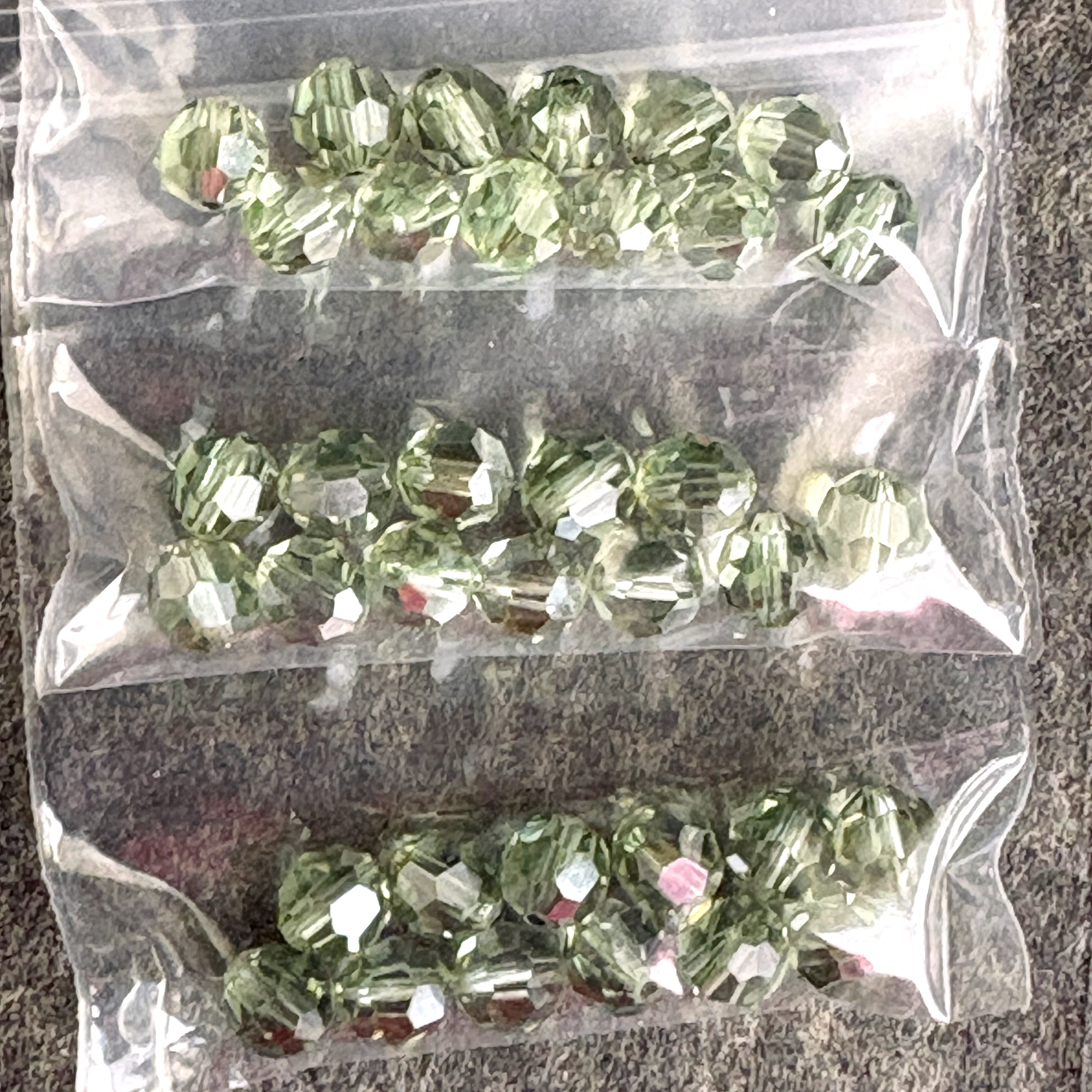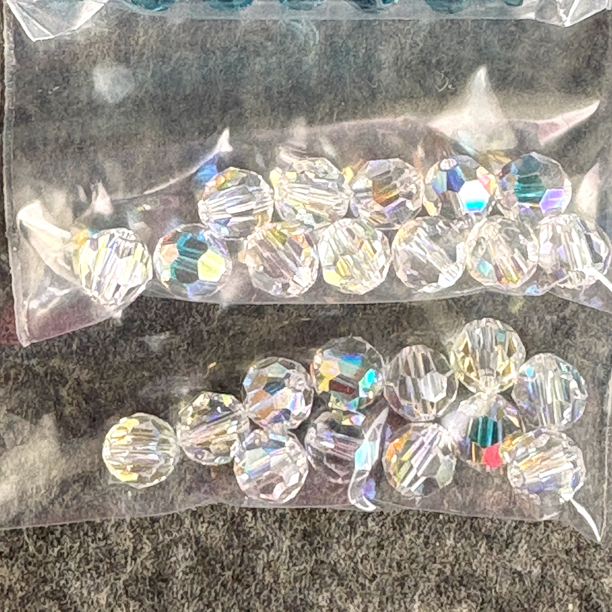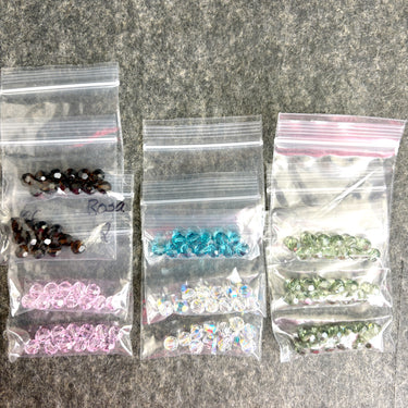 10 bags of 12/bag of 6mm round crystal beads for a total of 120 beads. Colors include: 2 bags of an iridescent clear, 1 bag of indicolite, 2 bags of rosaline, 2 bags of mocca, and 3 bags of chrysolite.