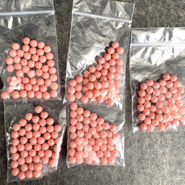 Five bags with 50/bag of 6mm round crystal pearls in pink coral (a pinkish-peachy color) for a total of 250 beads. These beautiful crystal pearls are full-drilled and ready for your next jewelry or craft project.