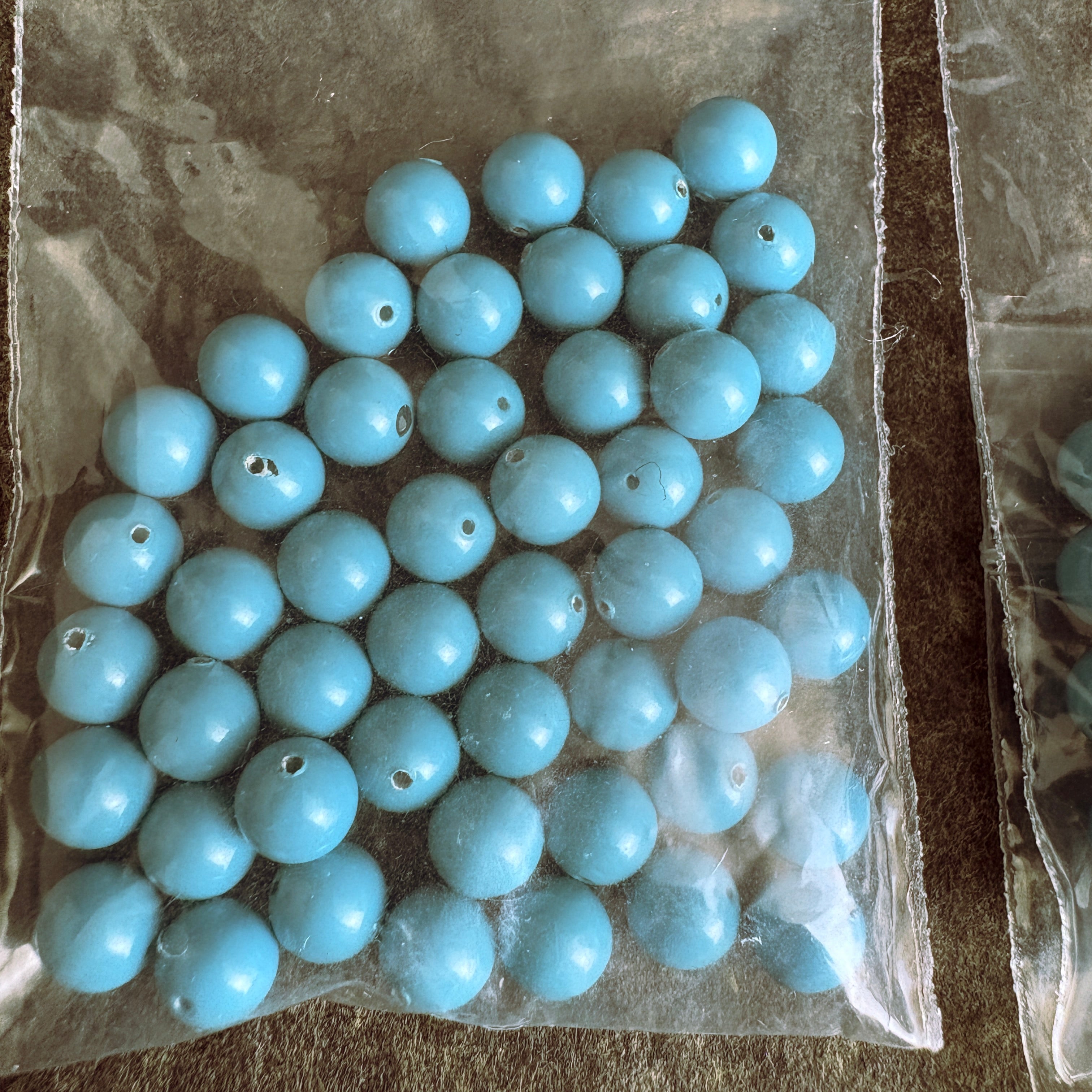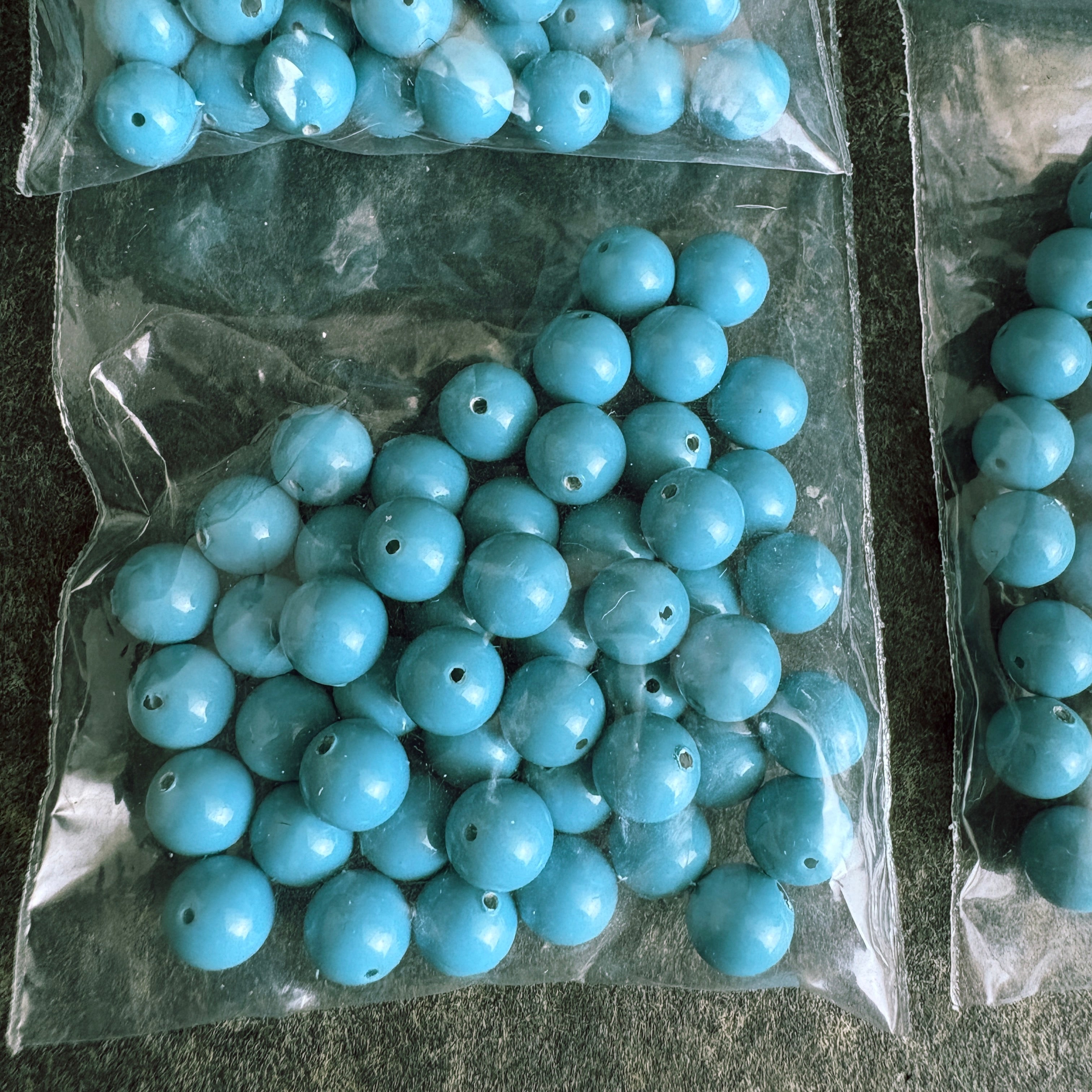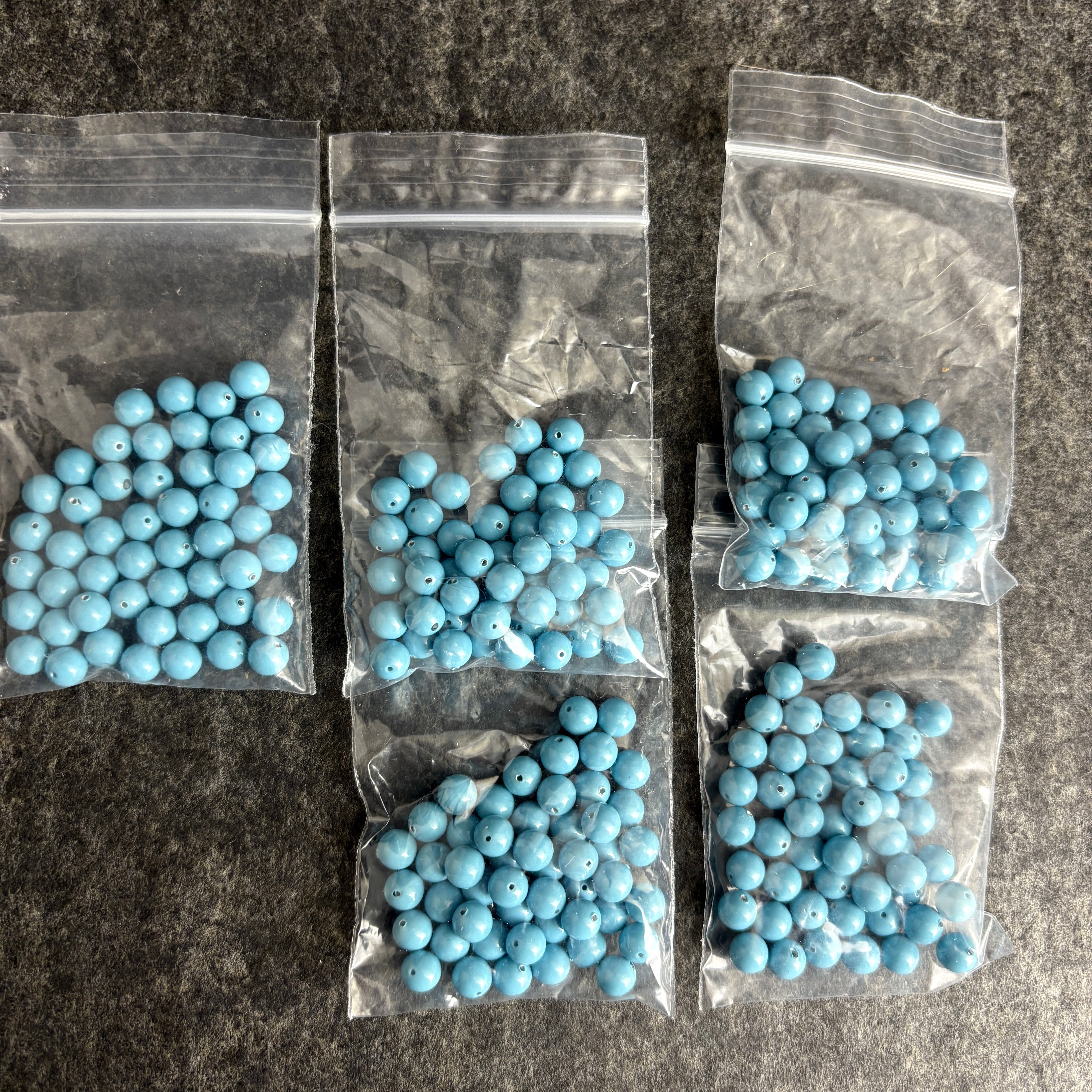 Five bags with 50/bag of 6mm round crystal pearls in turquoise for a total of 250 beads. These beautiful crystal pearls are full-drilled and ready for your next jewelry or craft project.