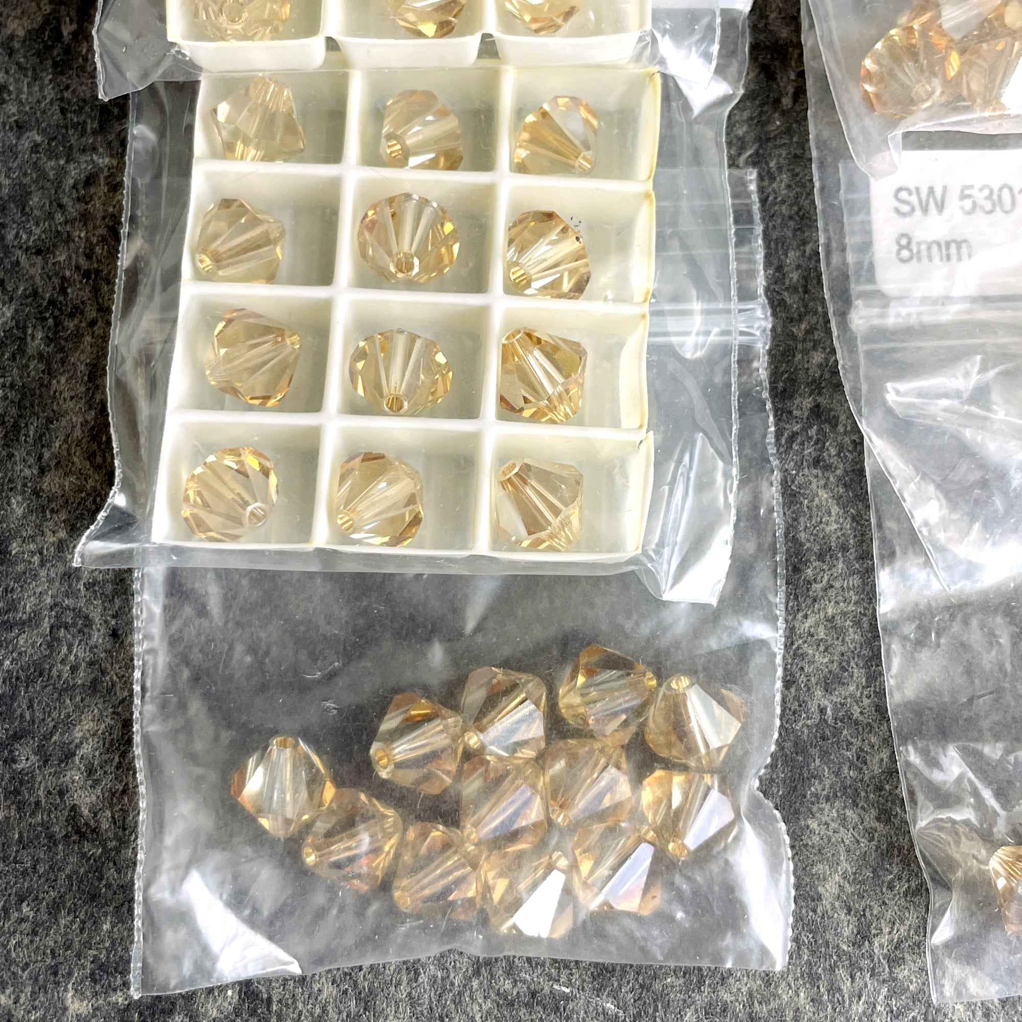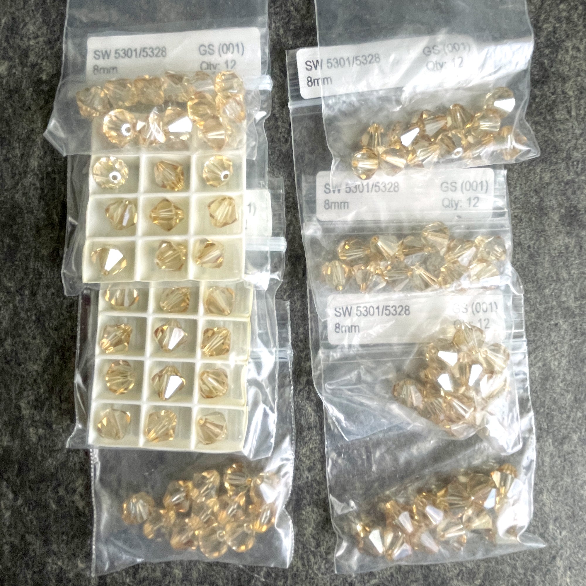 8 bags of 12/bag of 8mm bicone crystal beads for a total of 96 beads. Color: crystal golden shadow.