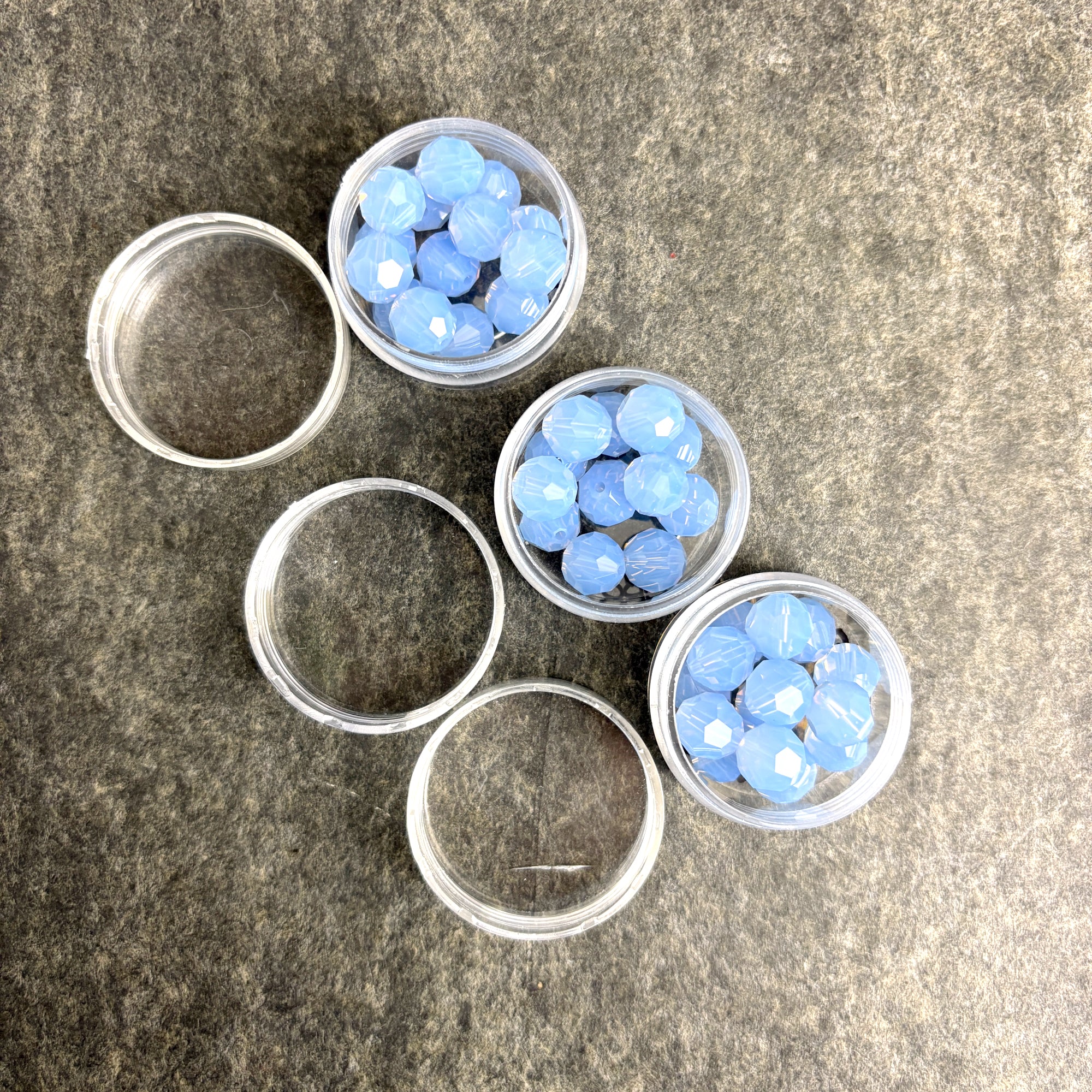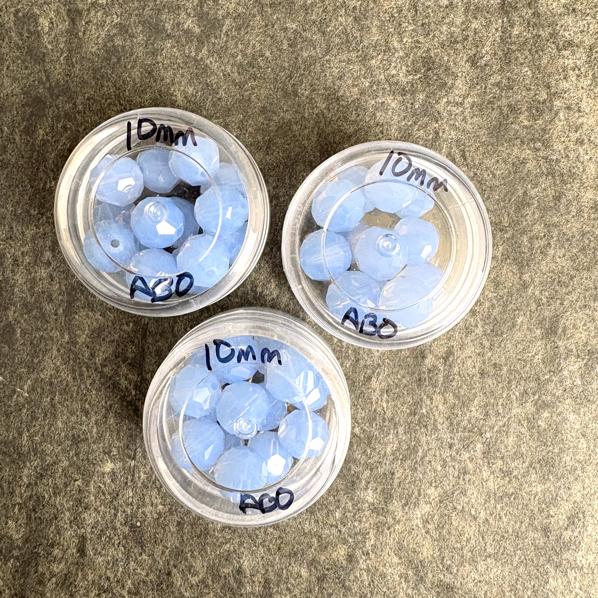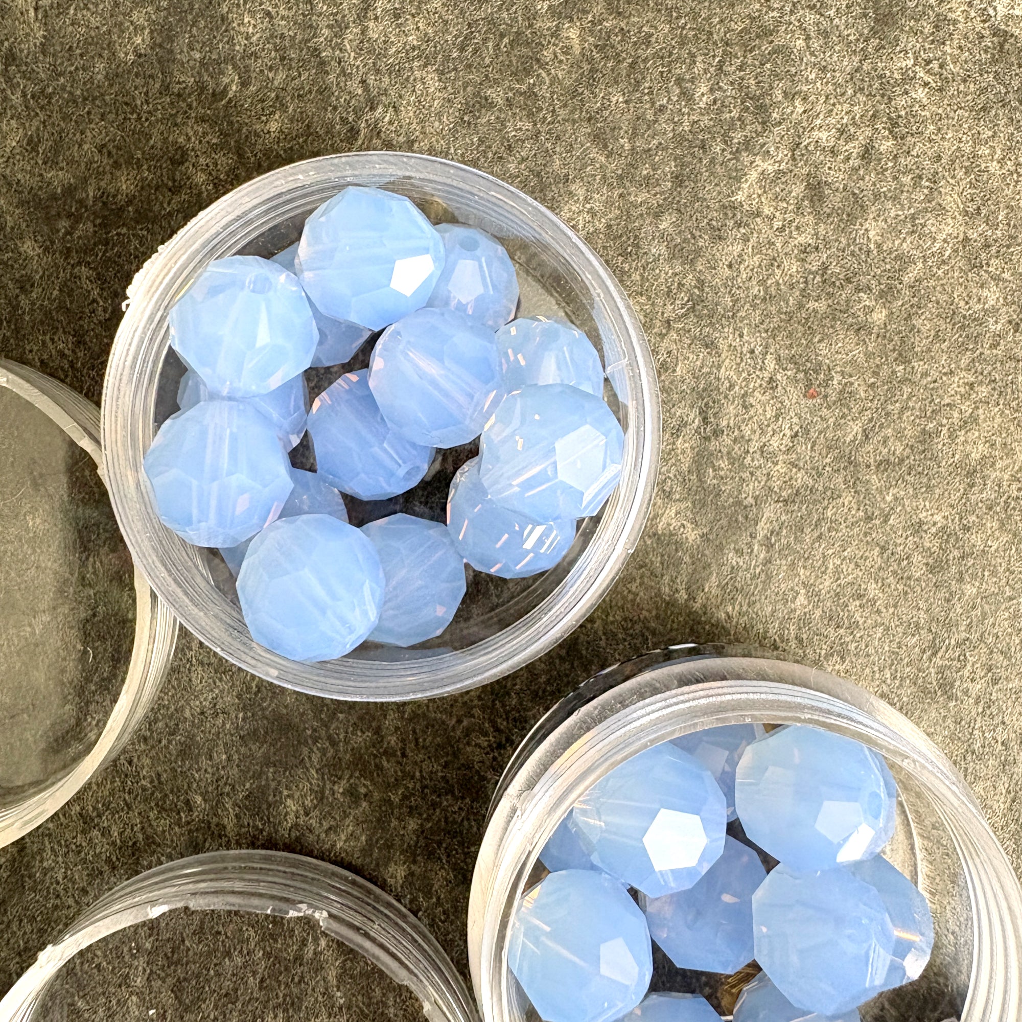 40 faceted 10mm round crystal beads in air blue opal.  The beads are packaged in three 1.5" x 0.75" clear round screw lid containers (two with 14 beads, one with 12).  A great opportunity to add to your bead stash.