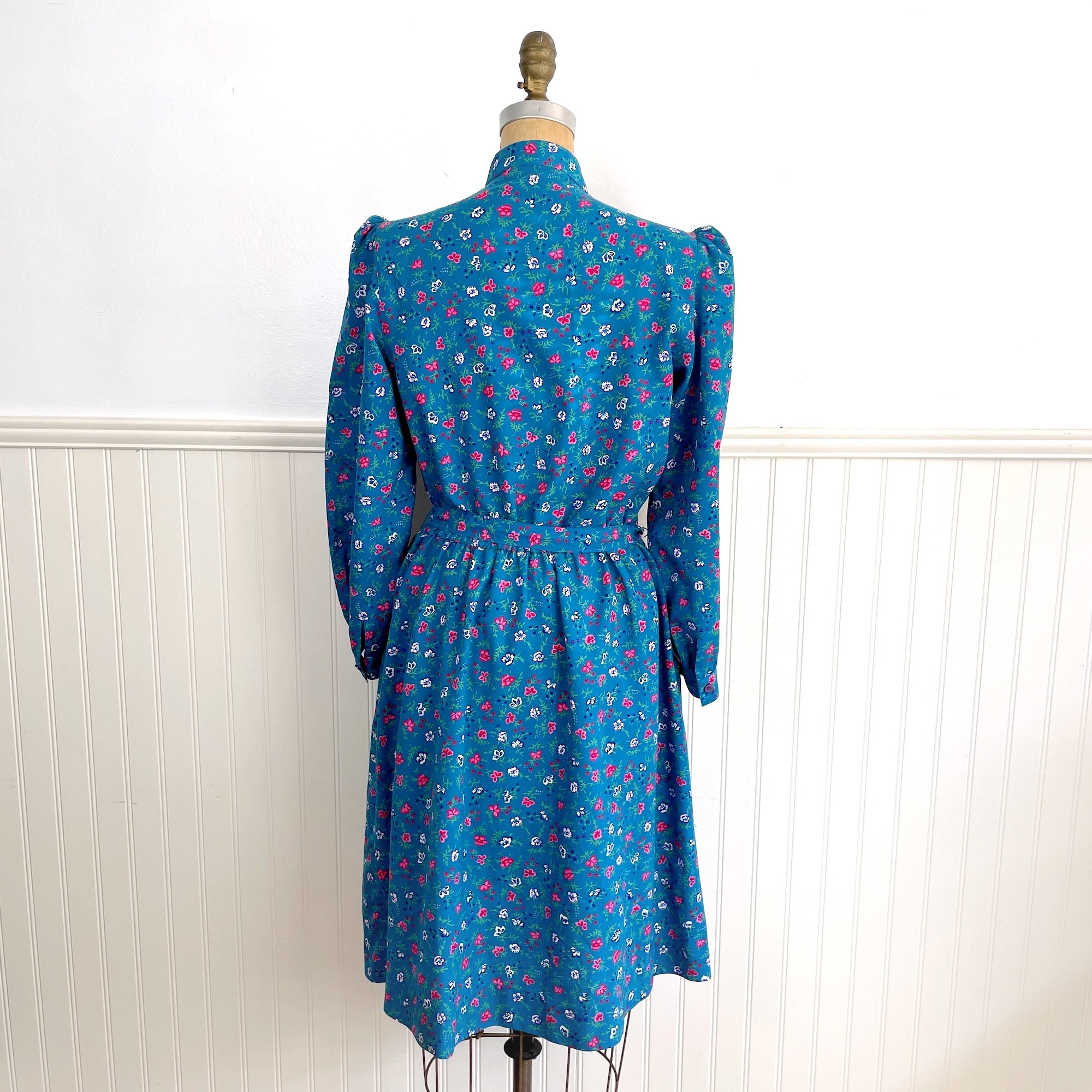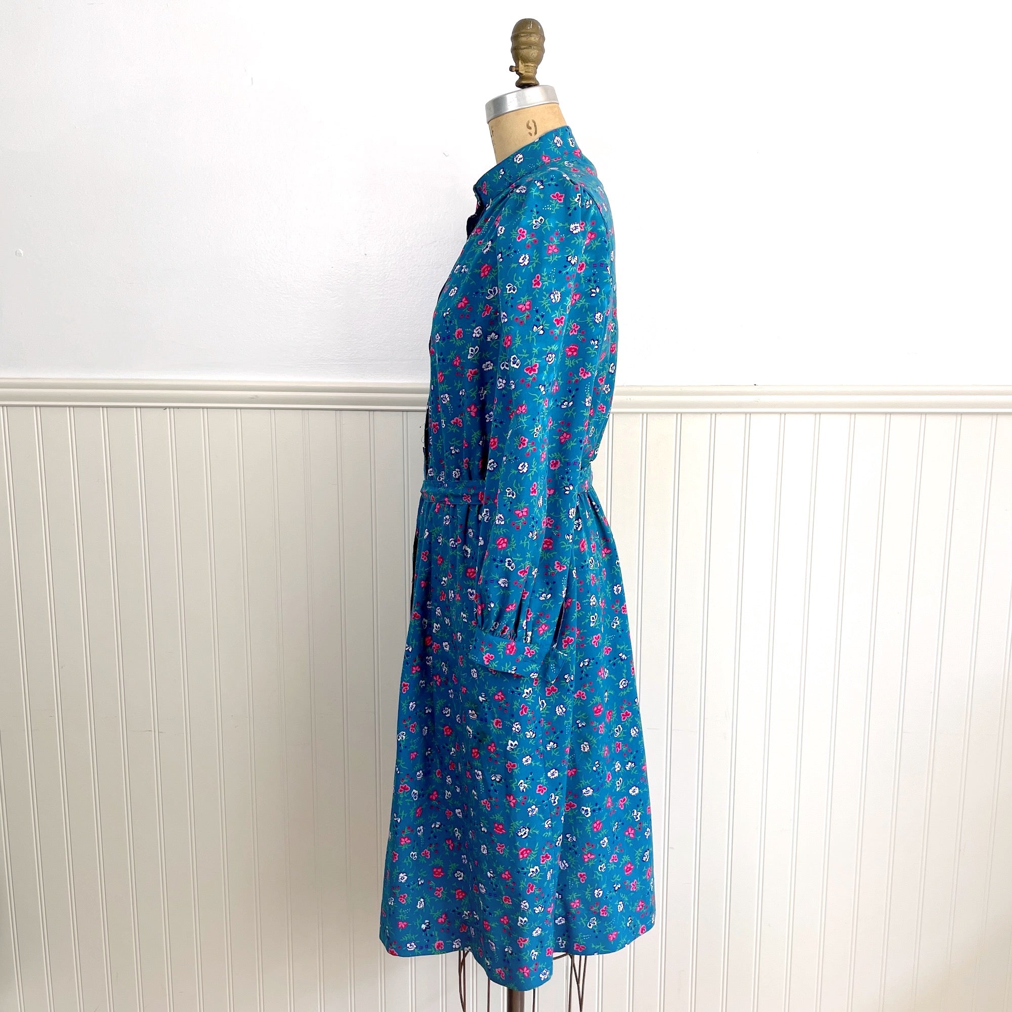 1970s cerulean blue floral dress with elastic waist - The Talbots - size medium
