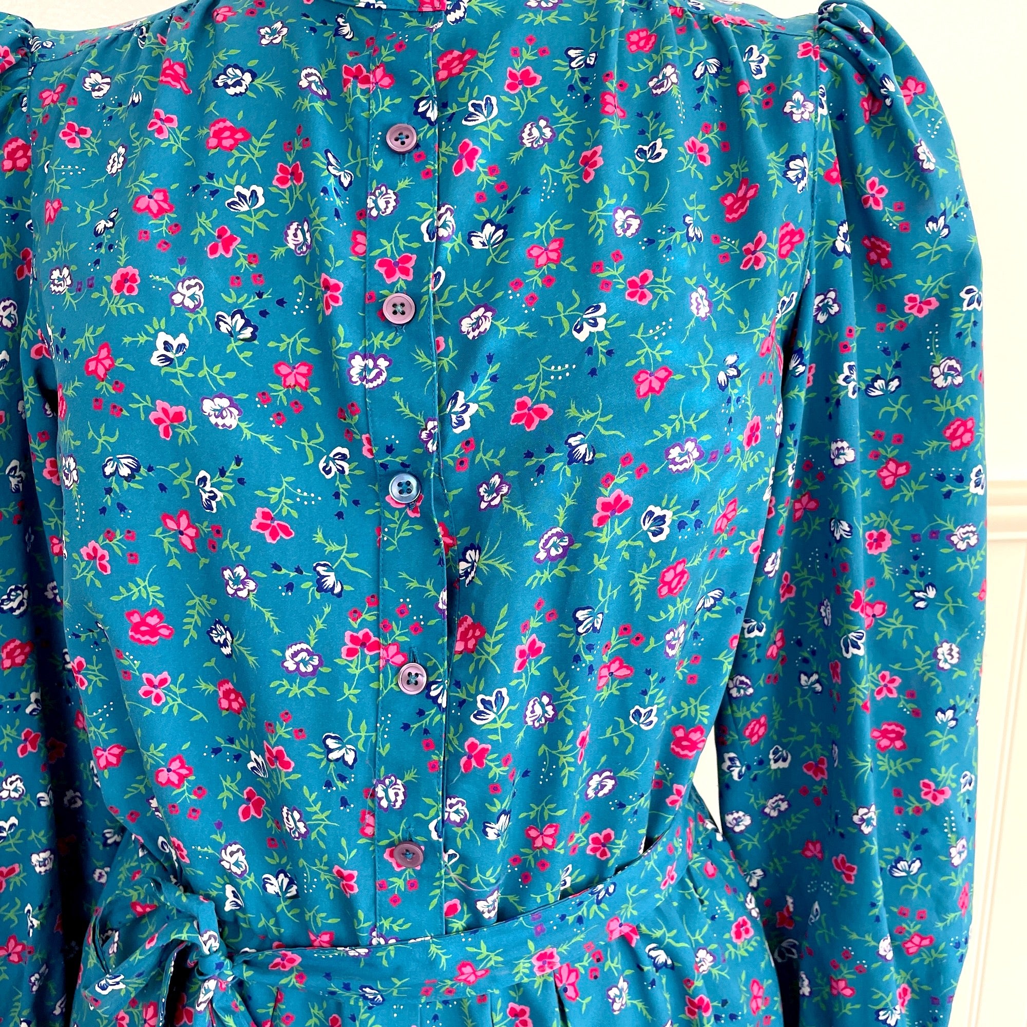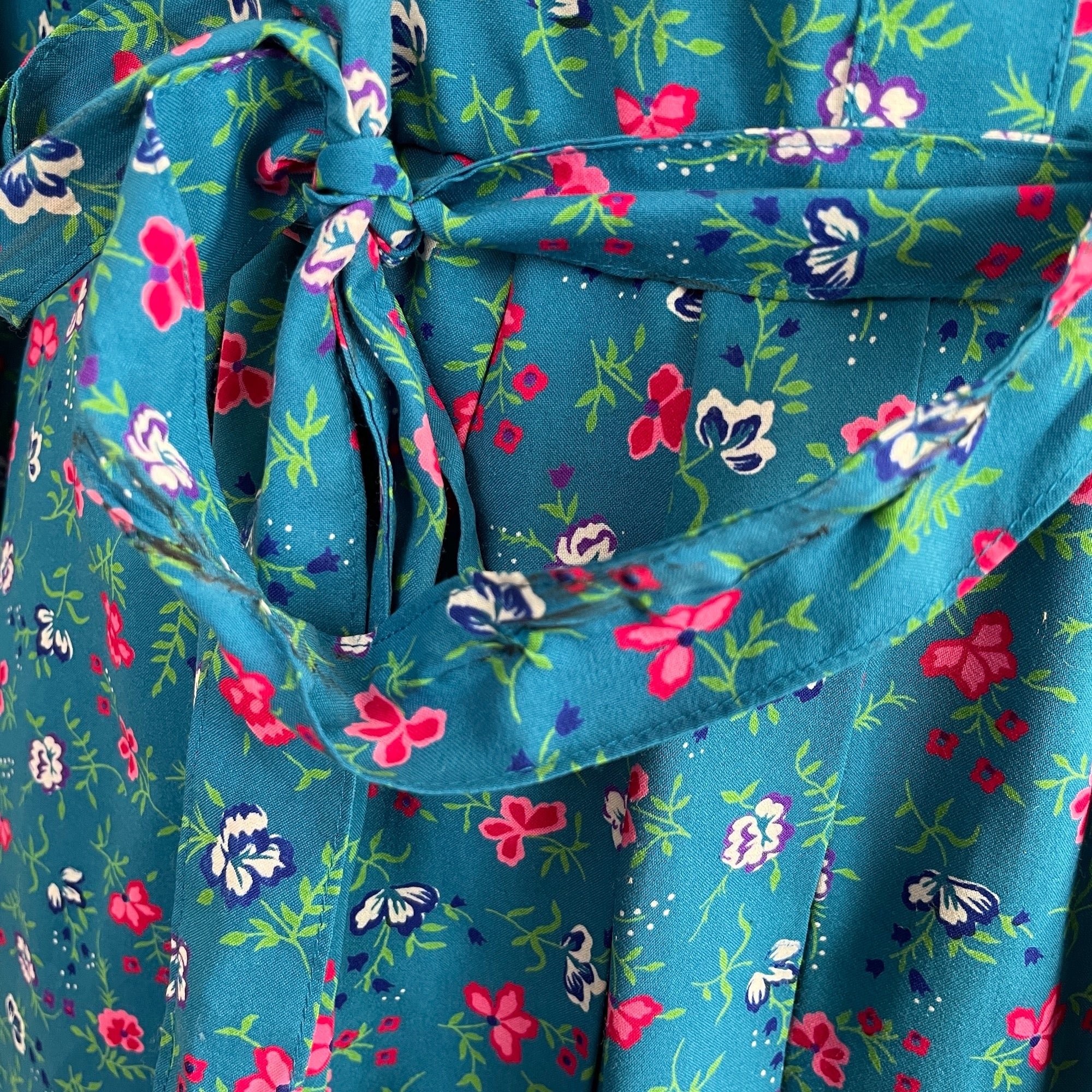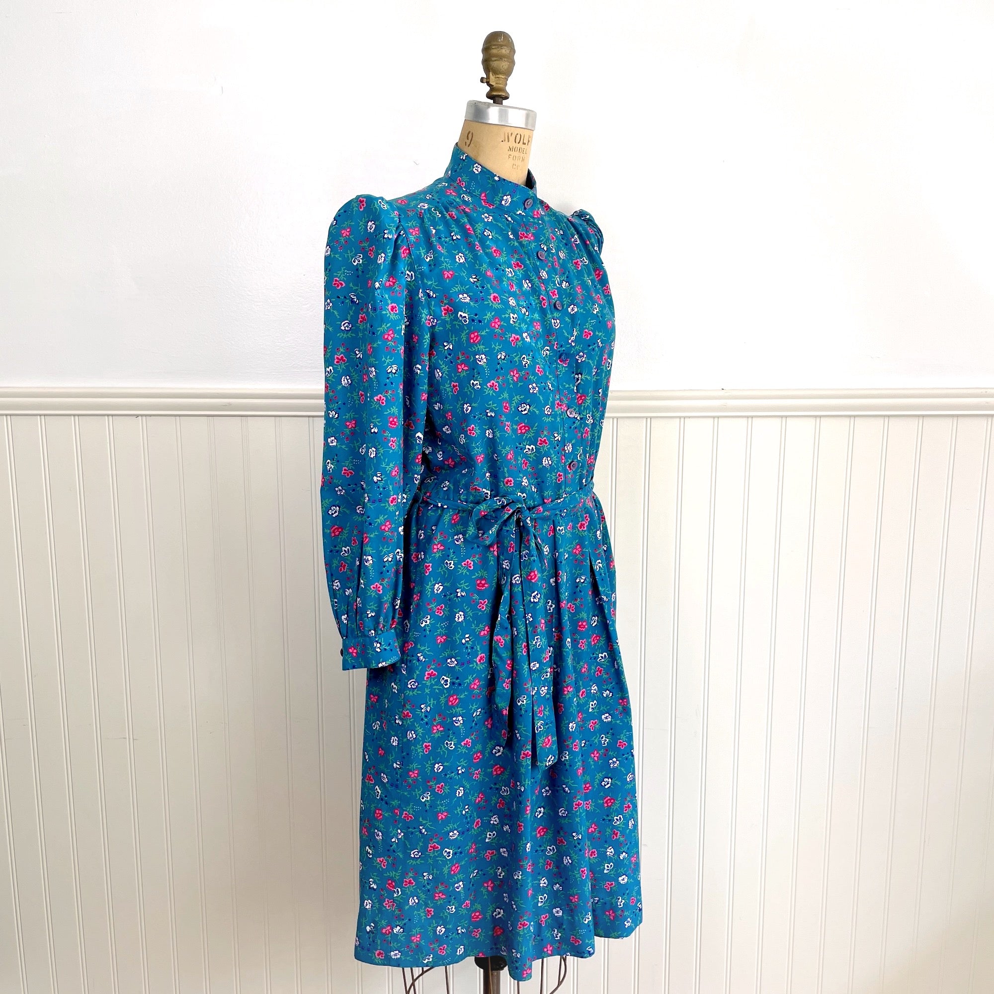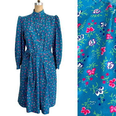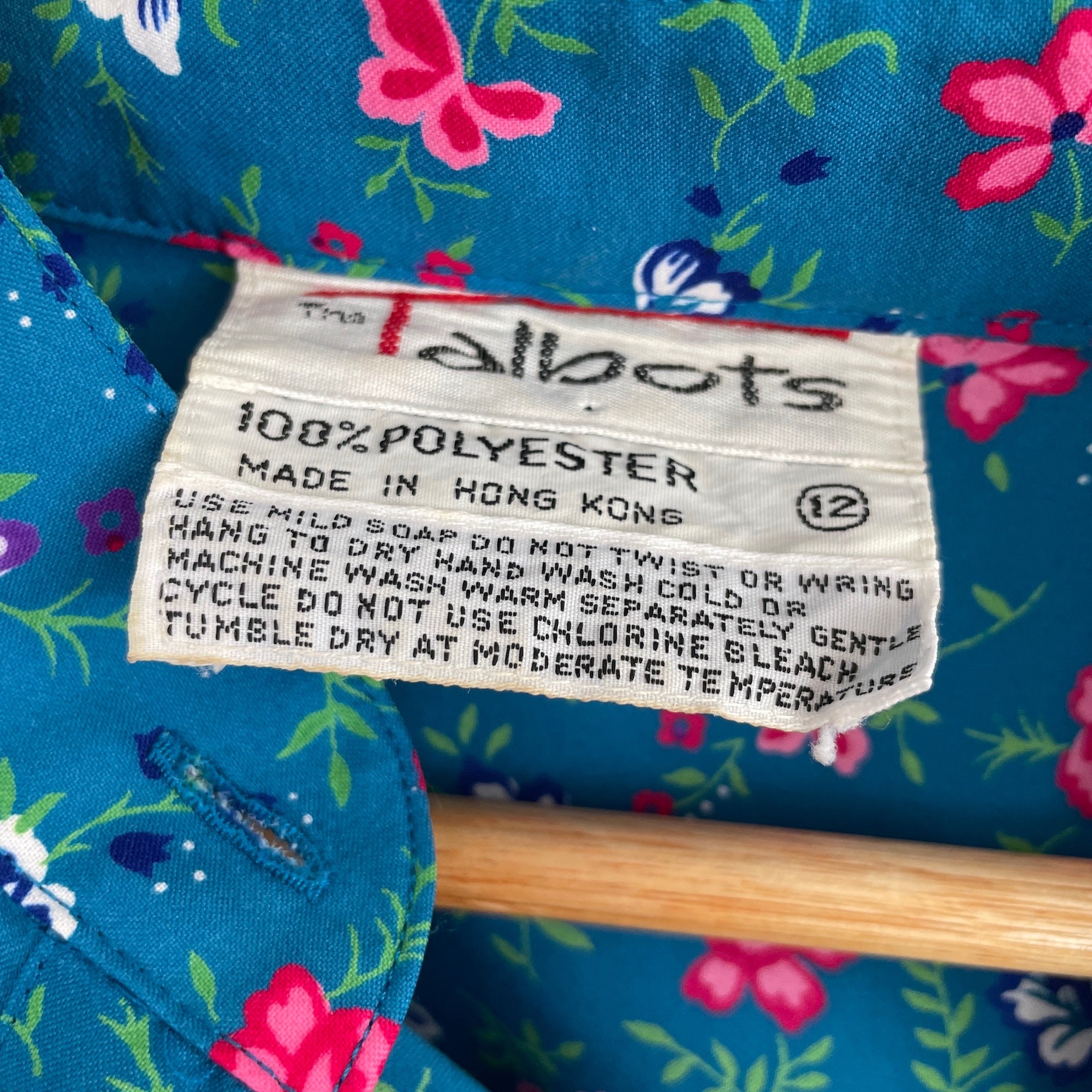 Vintage 1970s pullover day dress with an elastic waist by the Talbots. (Before it was cut short to Talbots.) Cerulean blue with magenta, royal purple, spring green and white flowers. Pleated skirt. Lavender buttons. Fabric belt. In seam POCKETS! on the skirt. Made in Hong Kong.