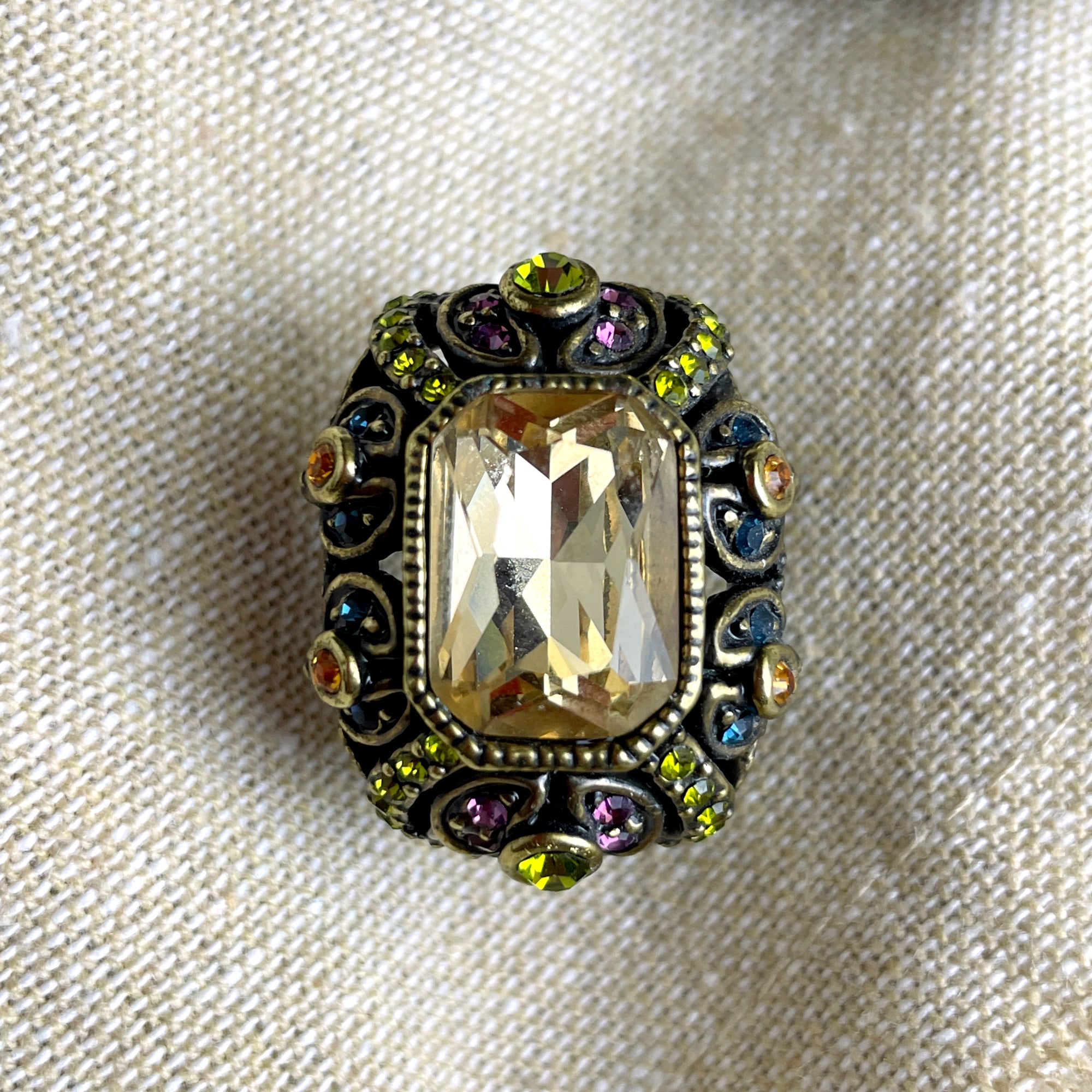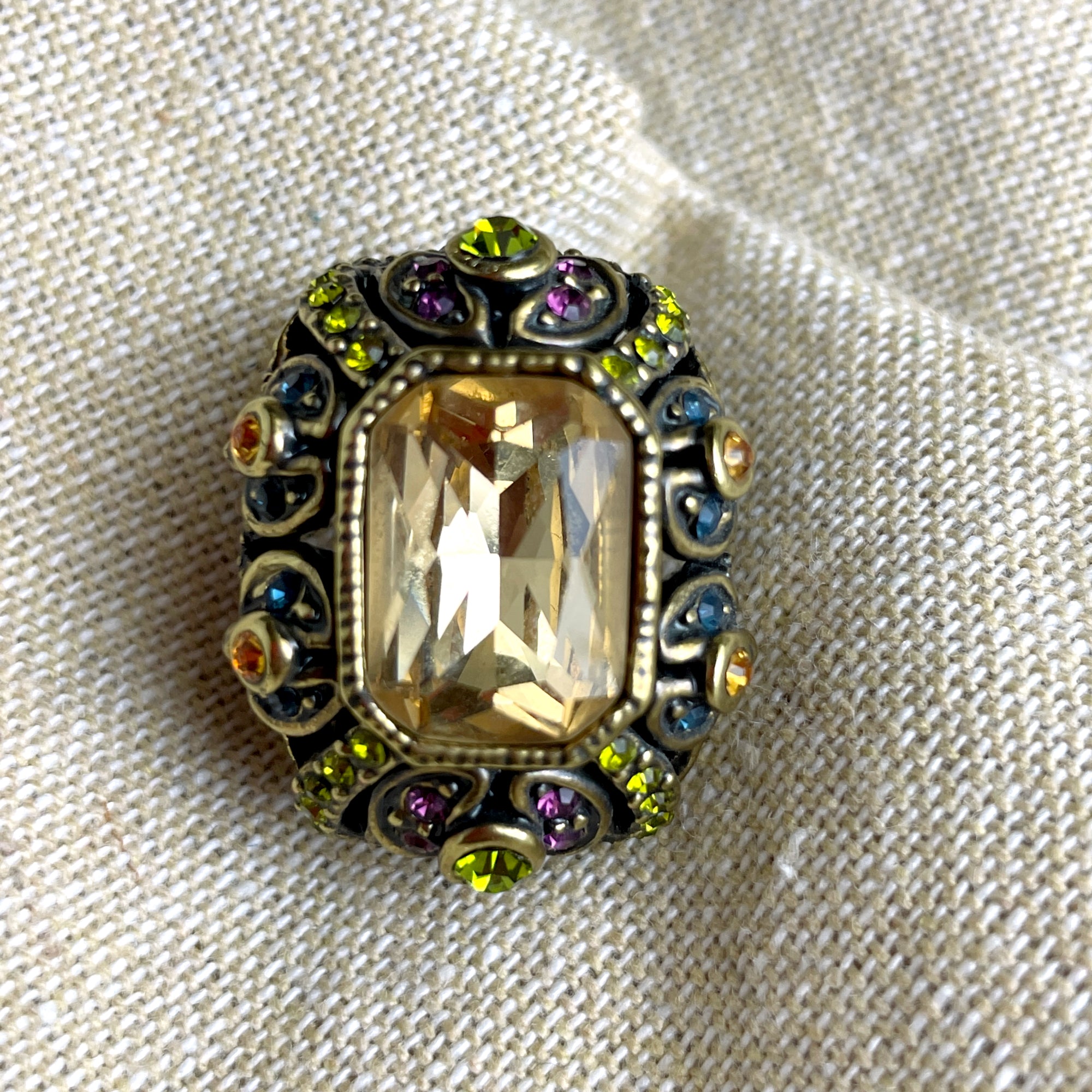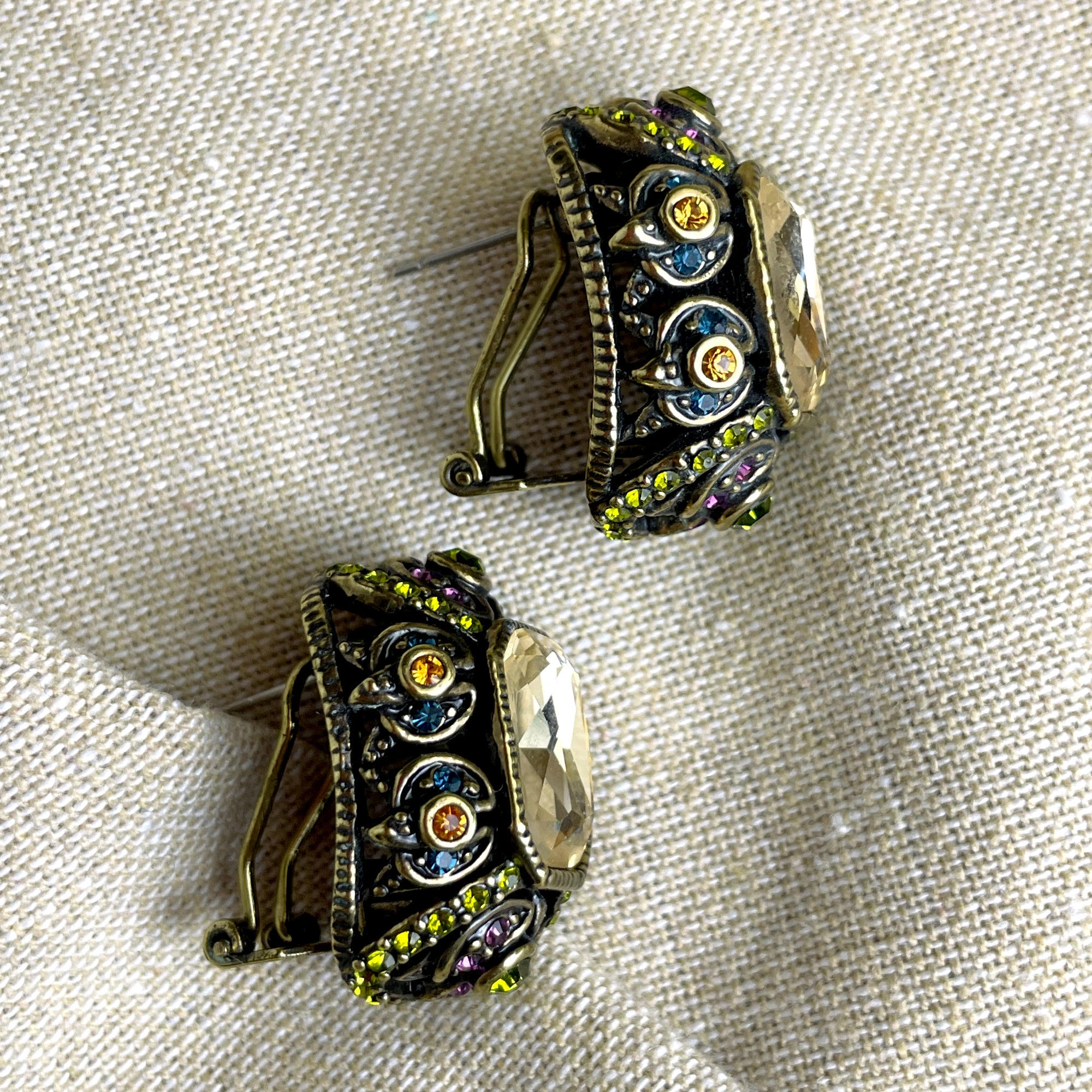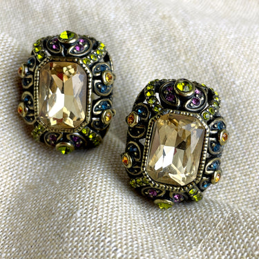 Vintage 90s-Y2k Heidi Daus maximalist multicolor crystal earrings. One large light smoky champagne topaz crystal surrounded by olivine, purple, amber and blue accent crystals. Post pierced, signed. Made for HSN. Brings the old world glamour.