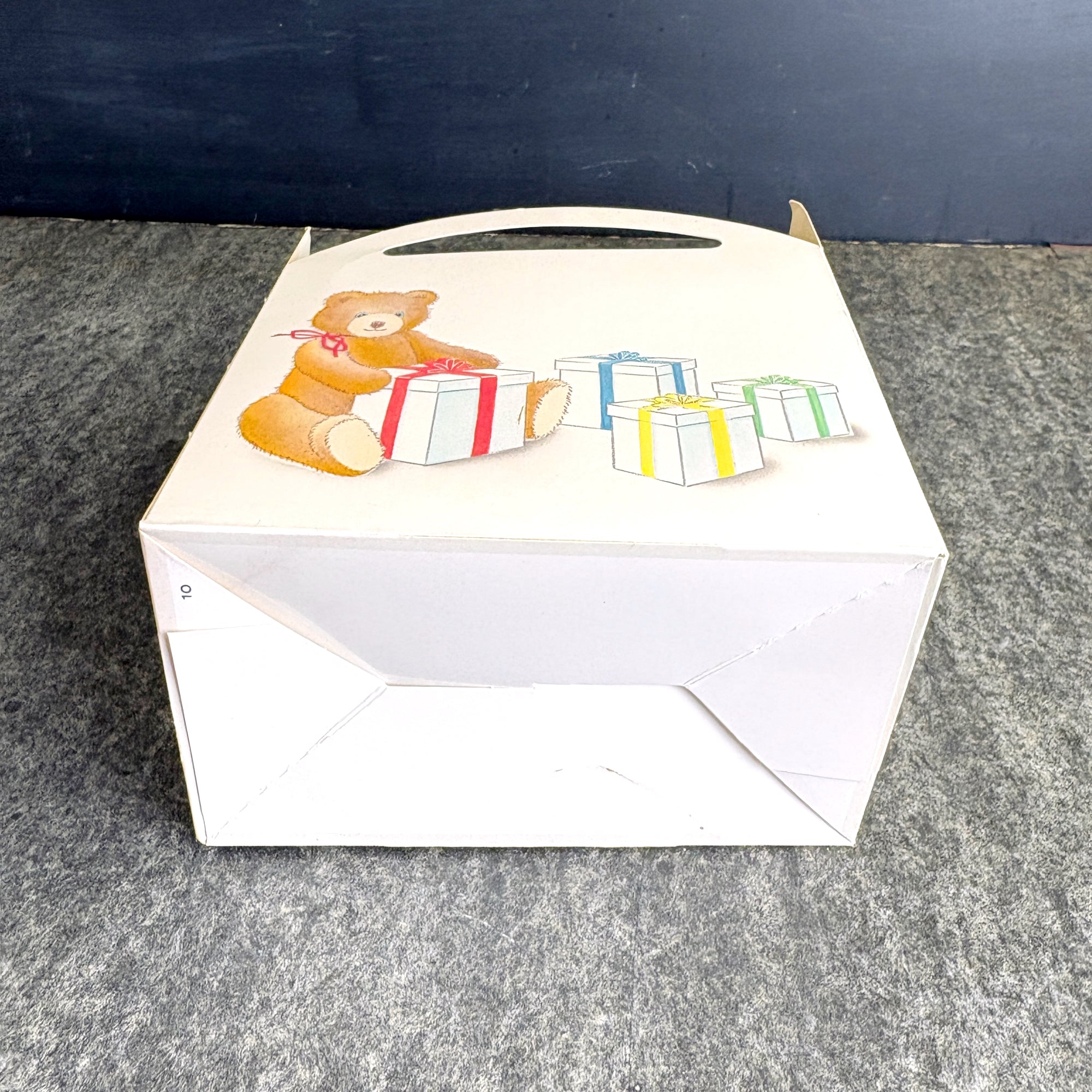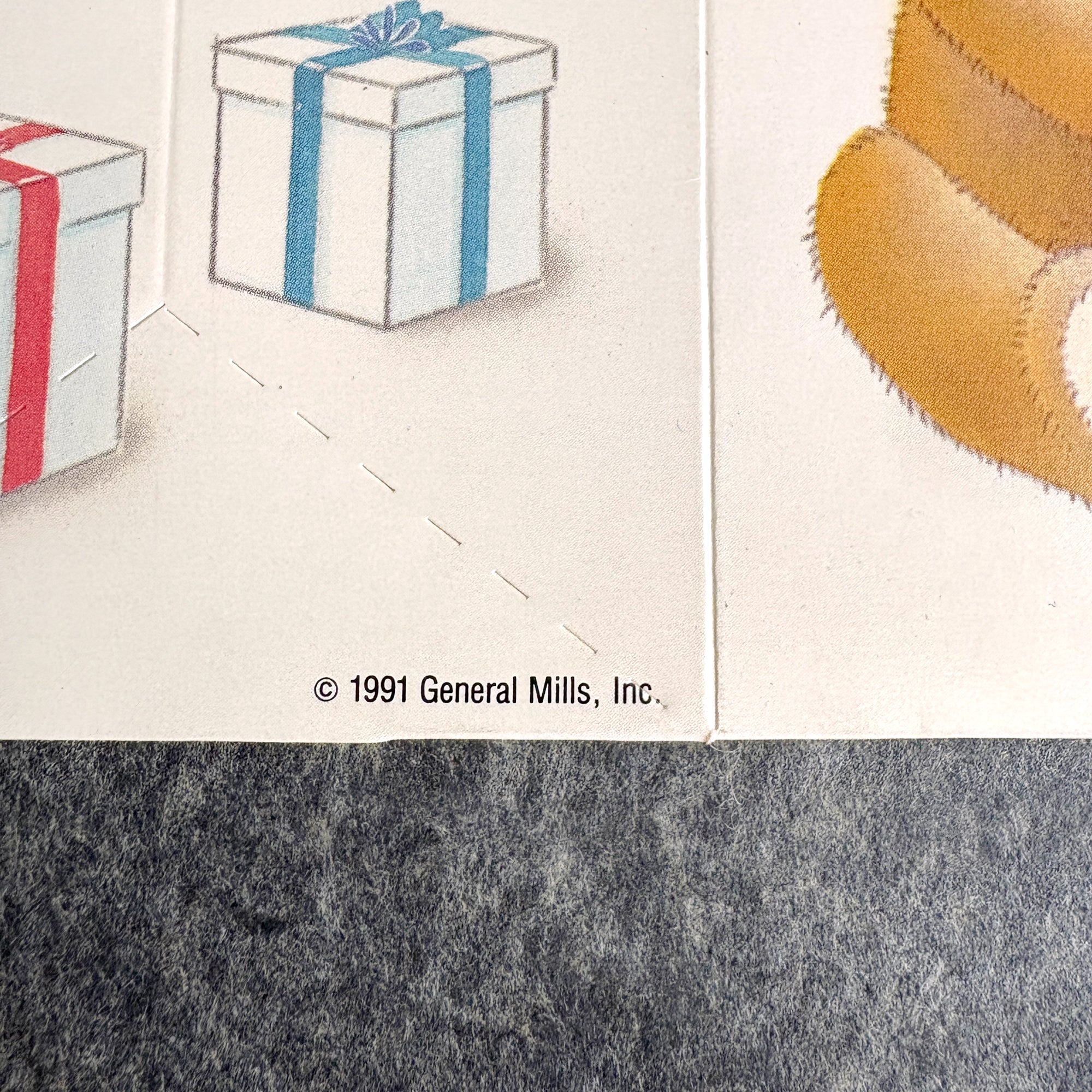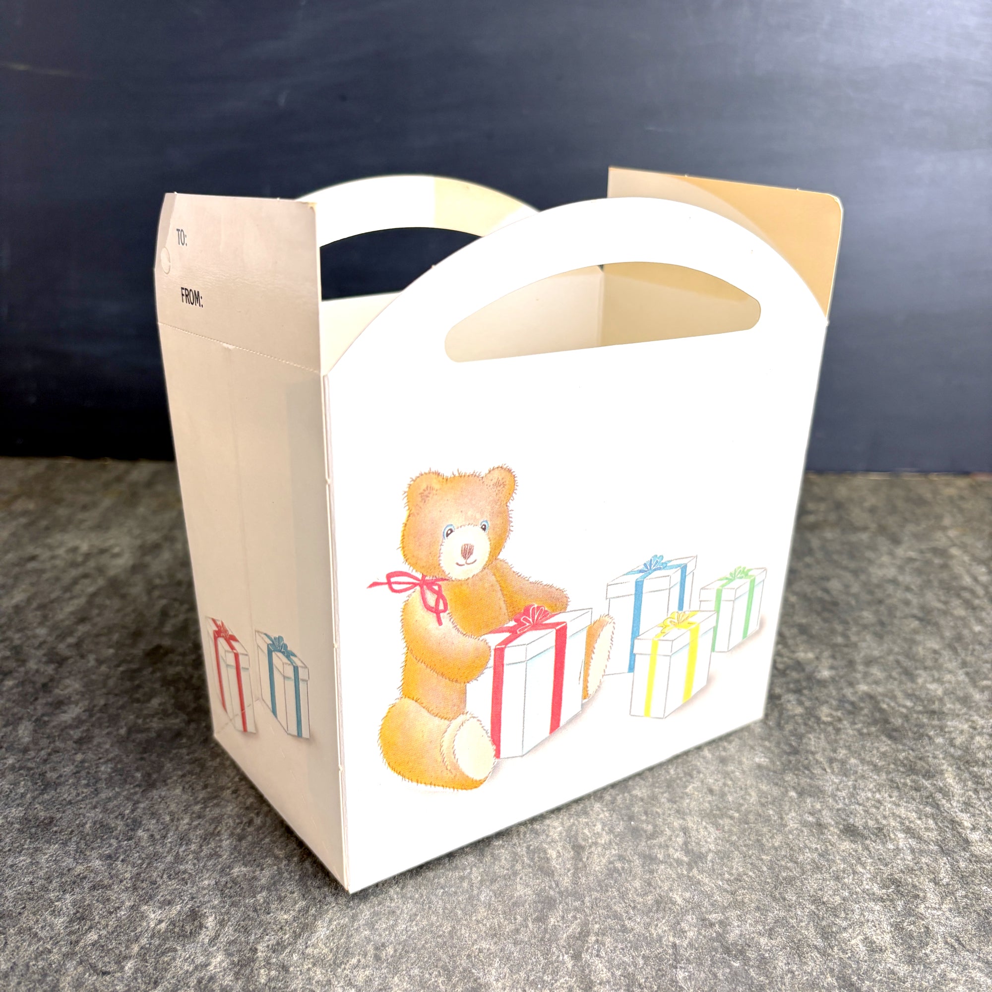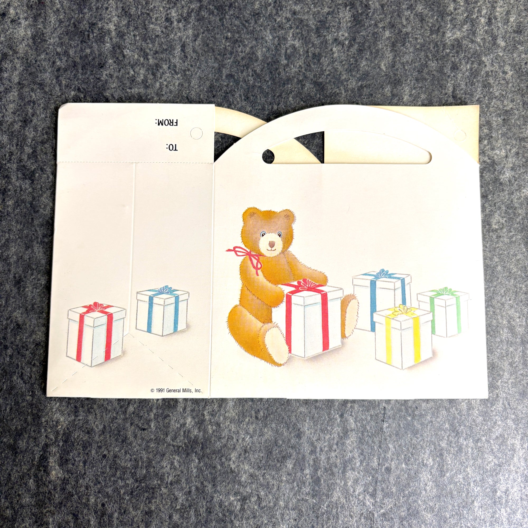 An adorable unused folding gift box featuring teddy bears and gift boxes with colorful ribbons. Has integrated carry handles. Copyright 1991, General Mills, Inc.