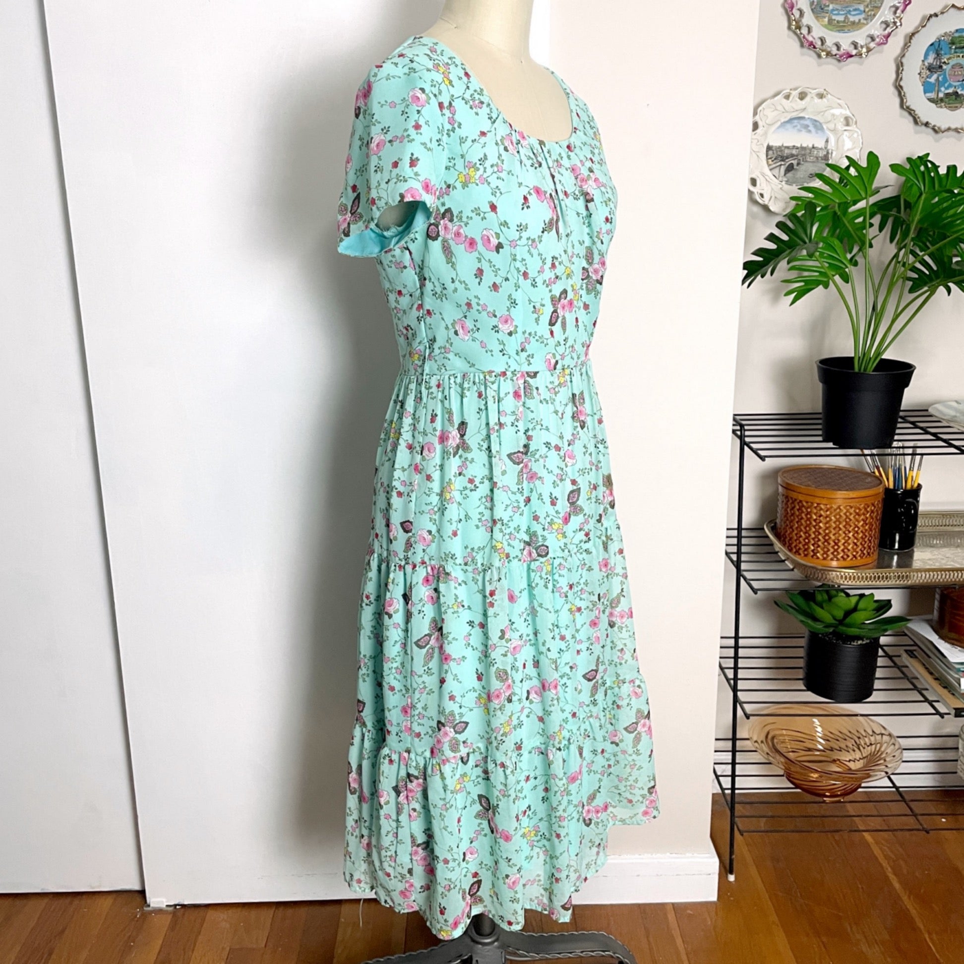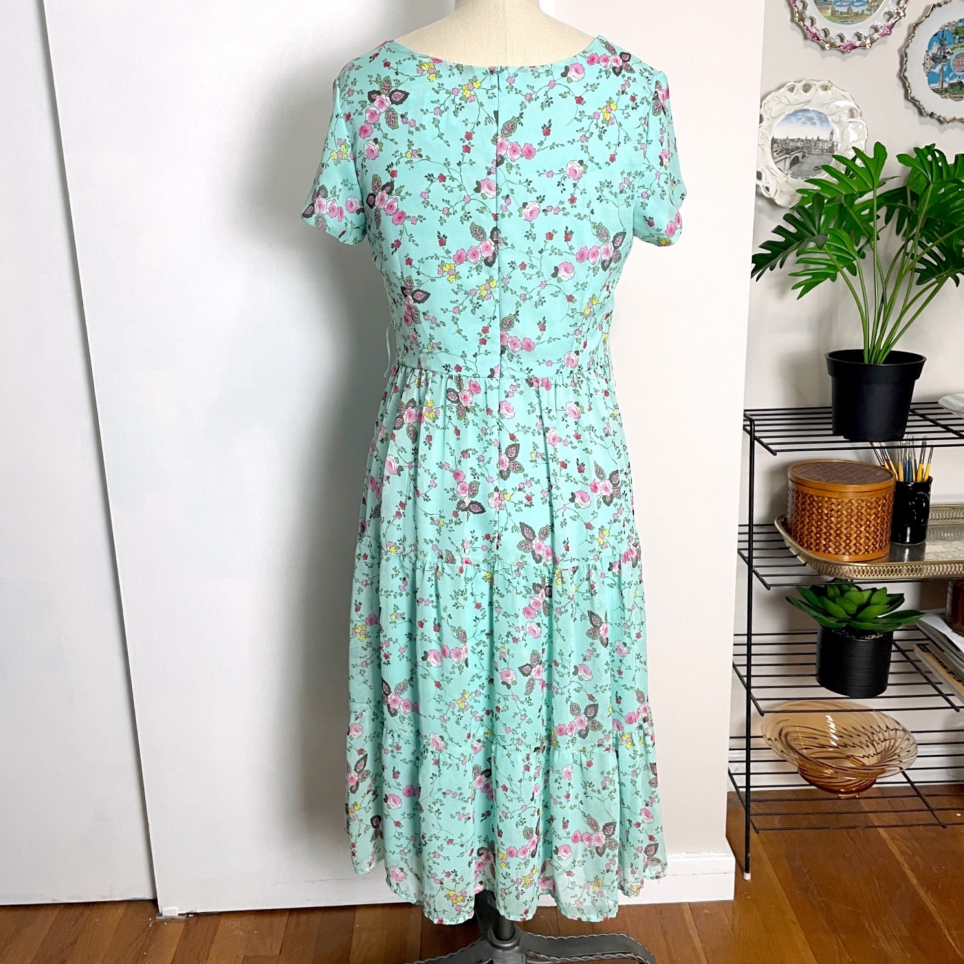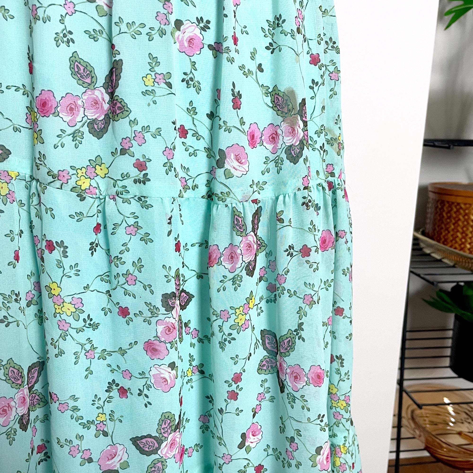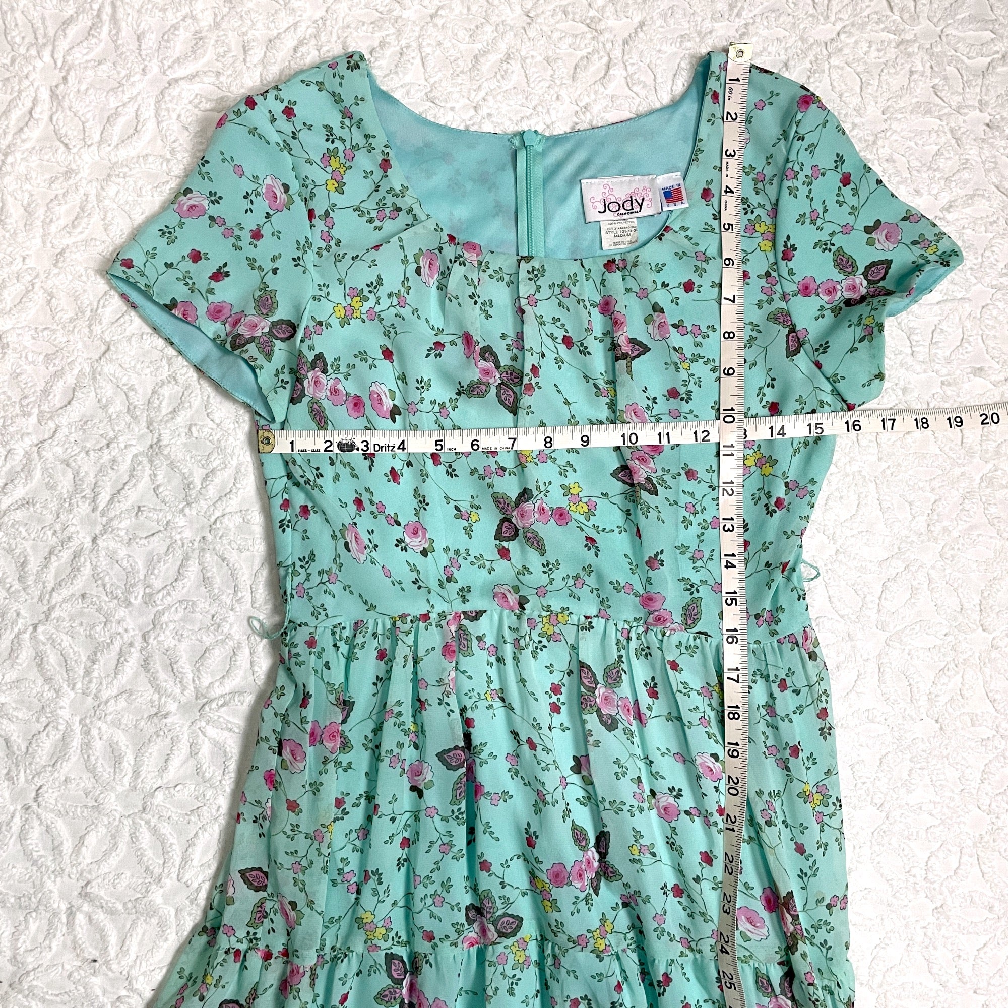 Light turquoise tiered floral dress by Jody California. Short sleeves. Back zipper. Round neck with tucks. Sheer fabric, fully lined. Chained belt loops, belt is missing. Made in USA.