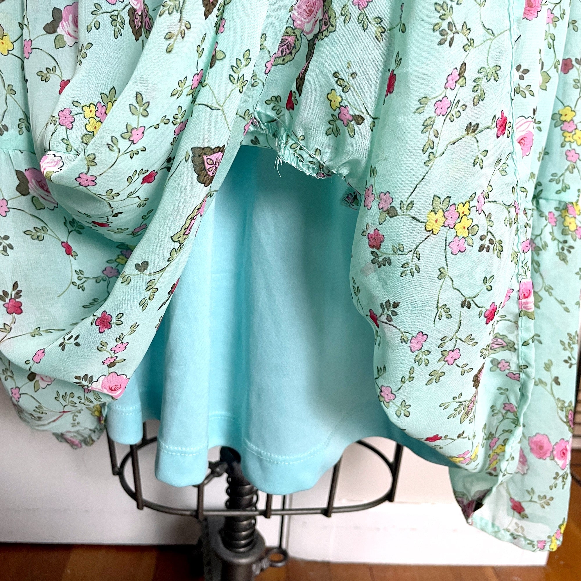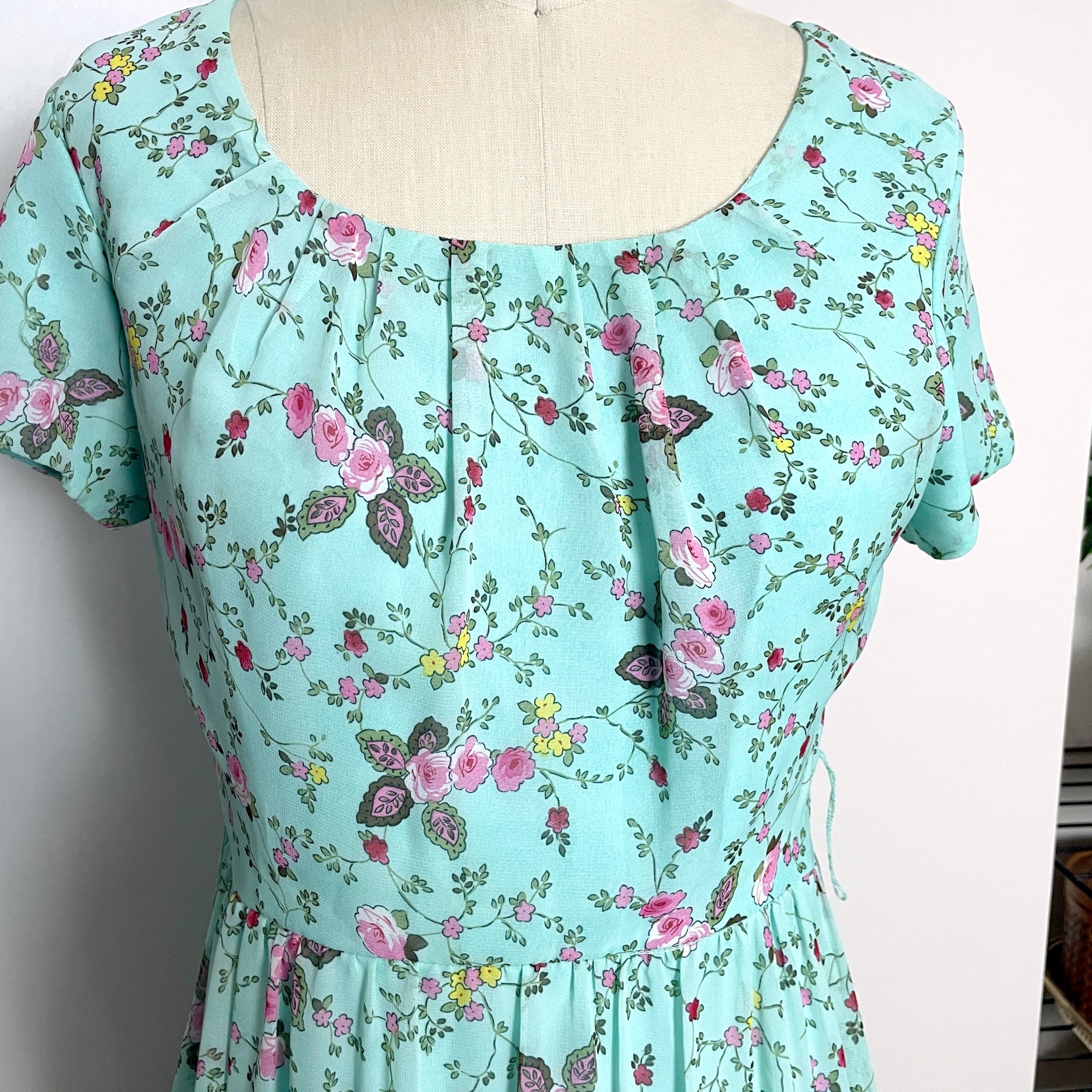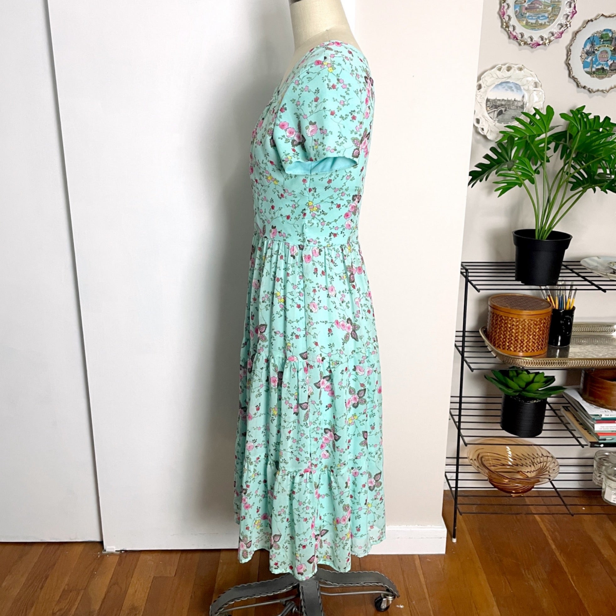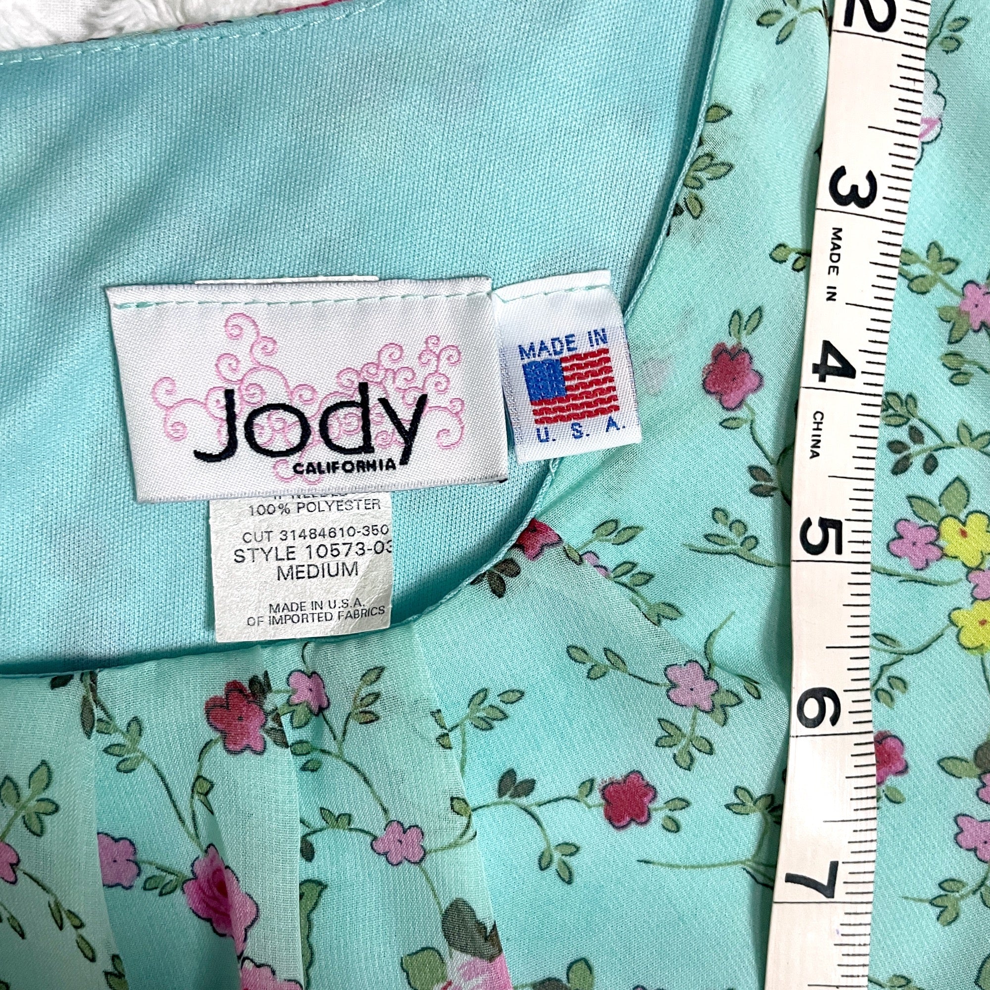 Light turquoise tiered floral dress by Jody California. Short sleeves. Back zipper. Round neck with tucks. Sheer fabric, fully lined. Chained belt loops, belt is missing. Made in USA.