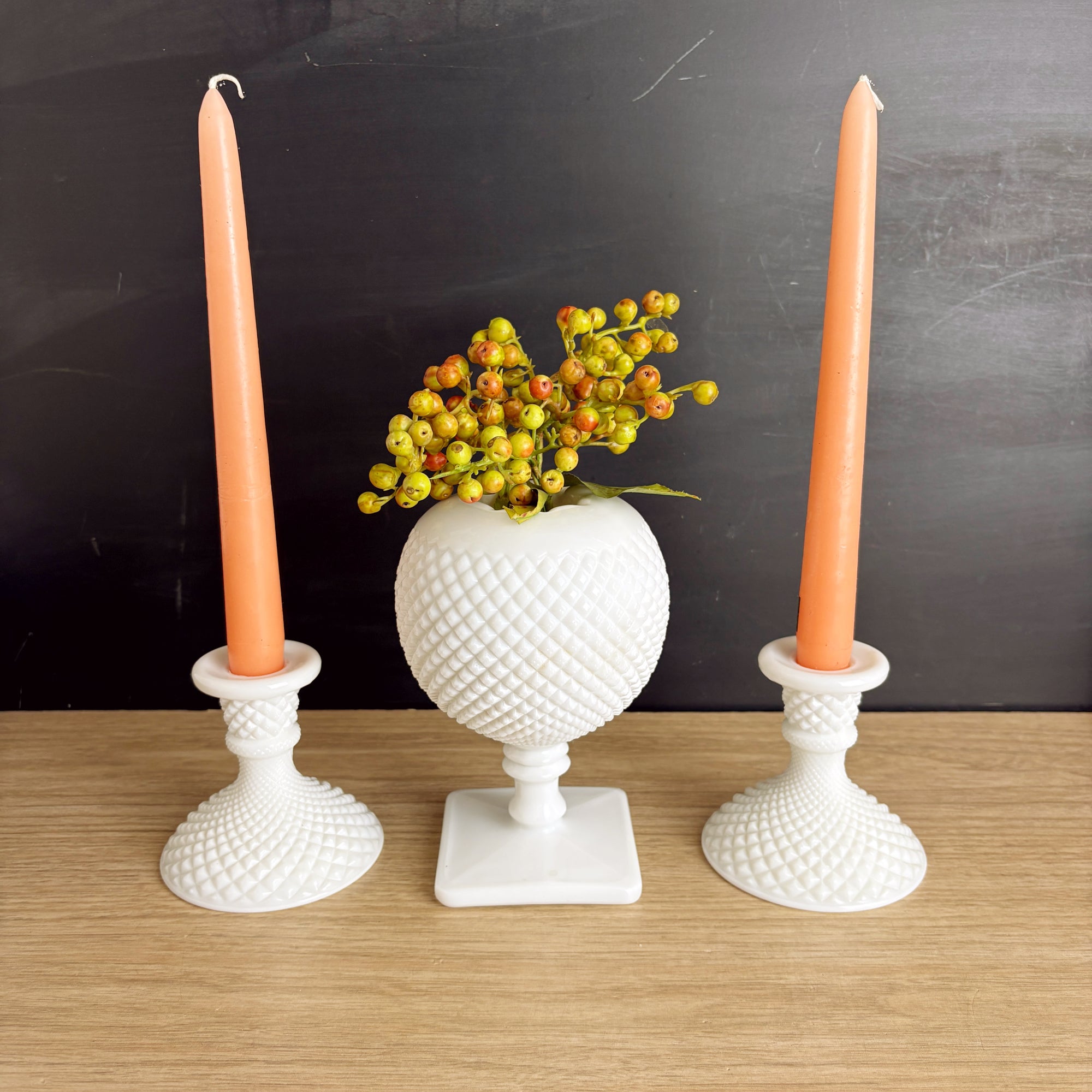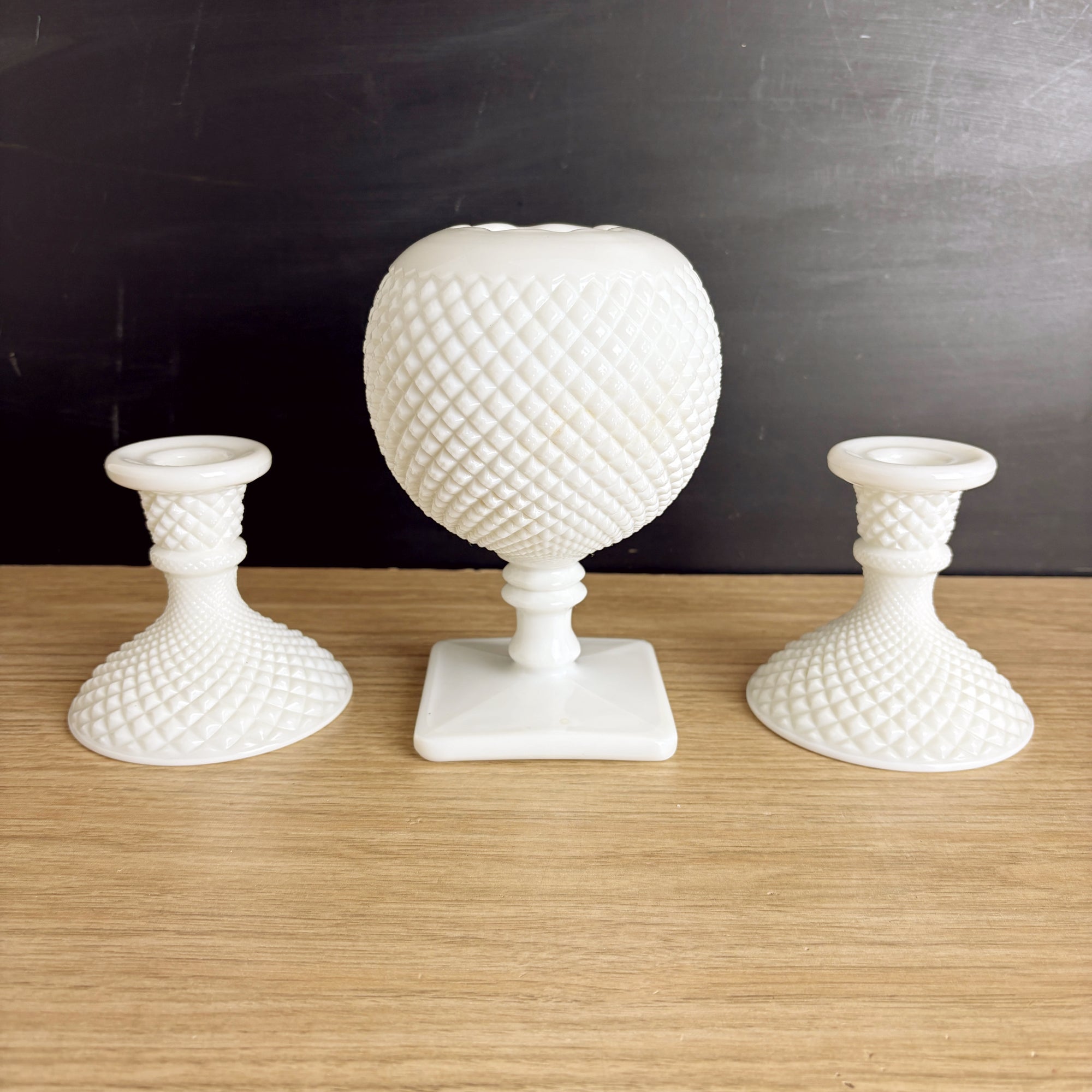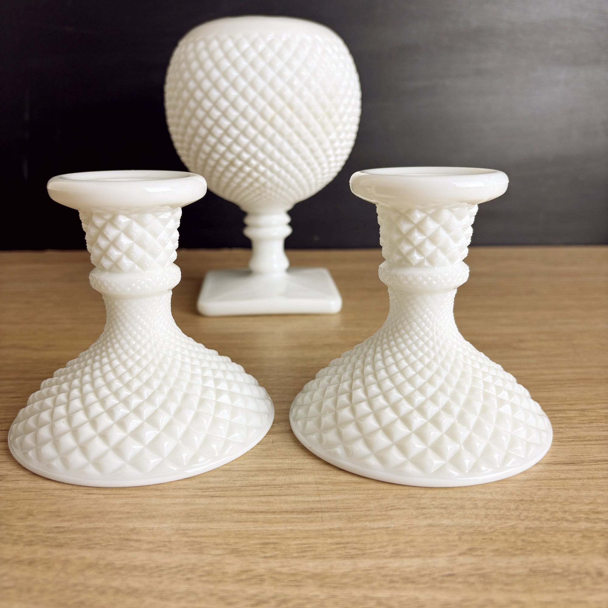 Westmoreland Hobnail milk glass candlestick pair and ivy ball vase – classic vintage trio