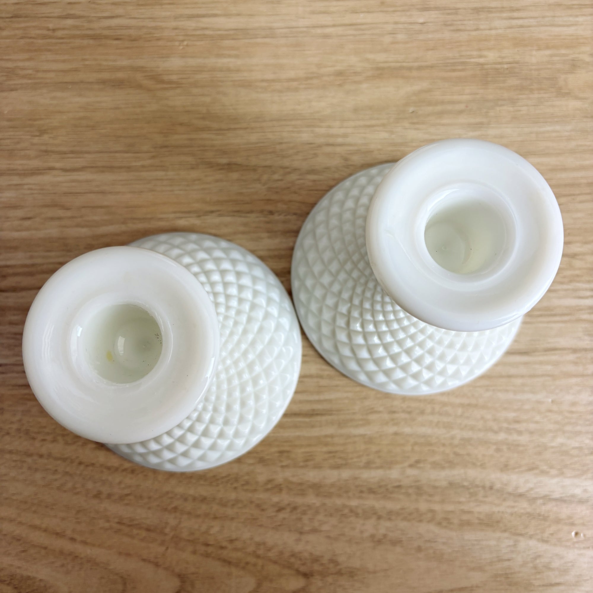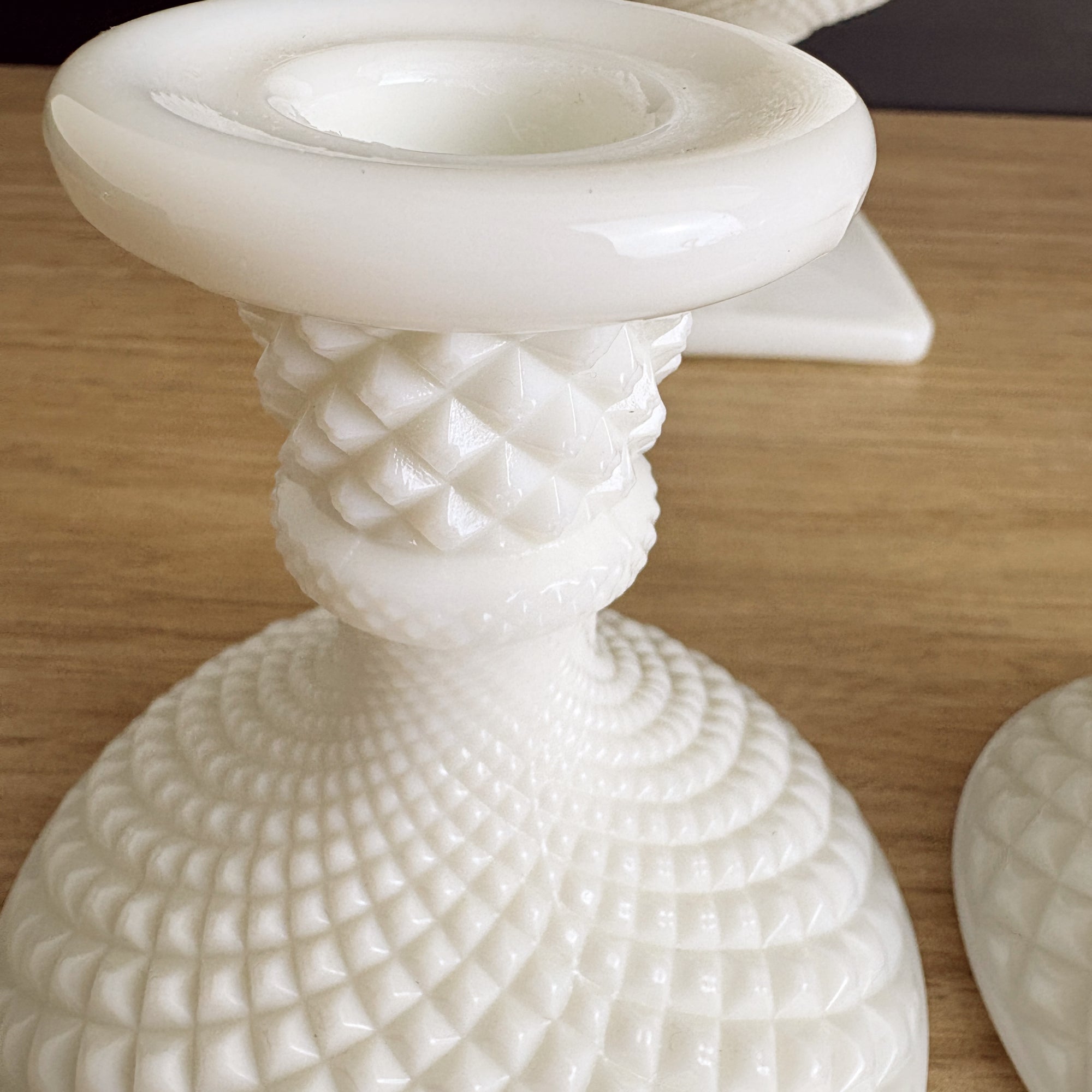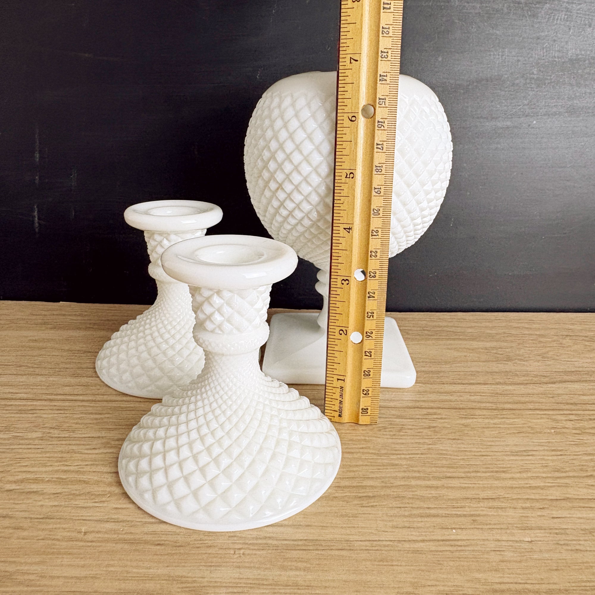 Westmoreland Hobnail milk glass candlestick pair and ivy ball vase – classic vintage trio
