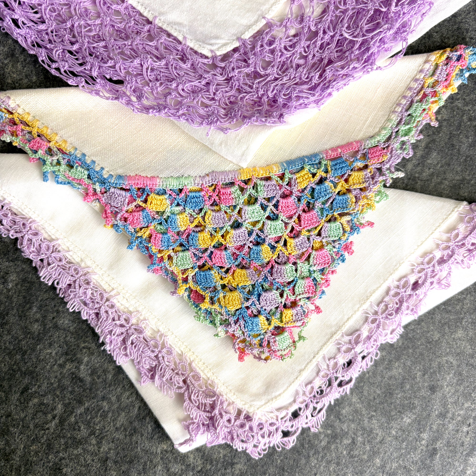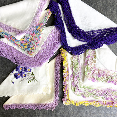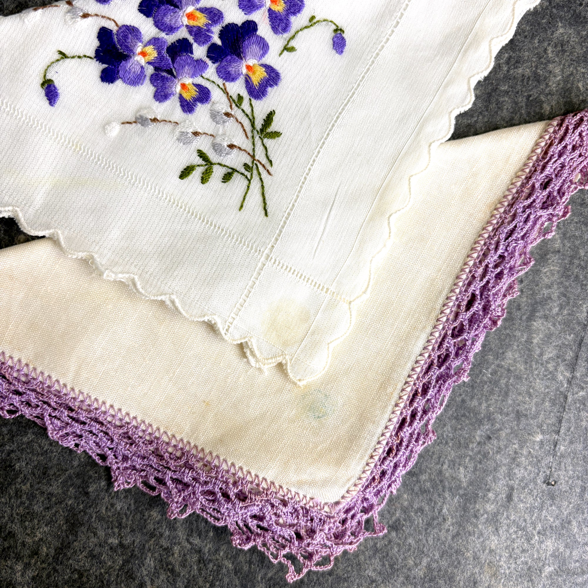 10 vintage linen embroidery and crochet hankies lot - shades of purple - 1950s vintage
