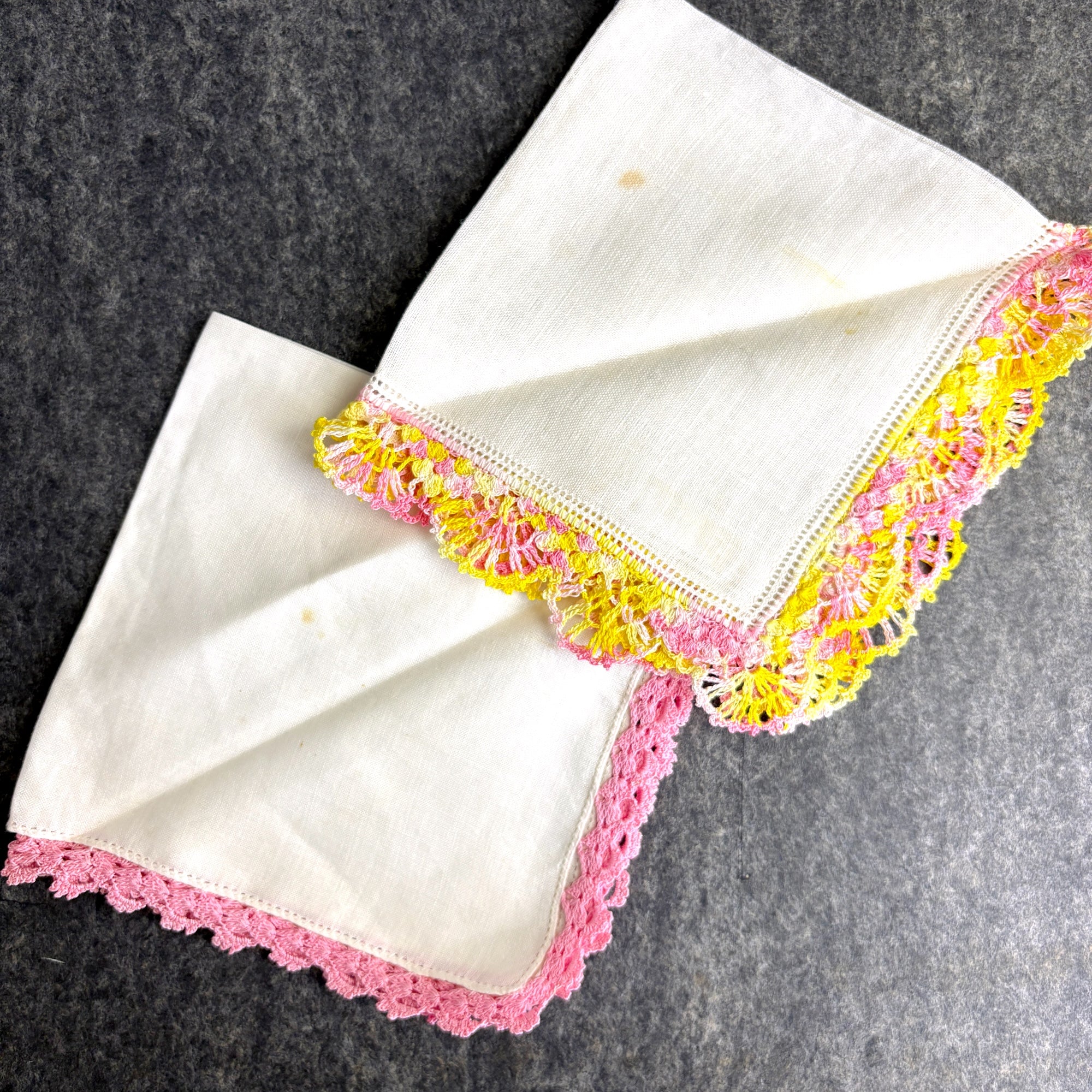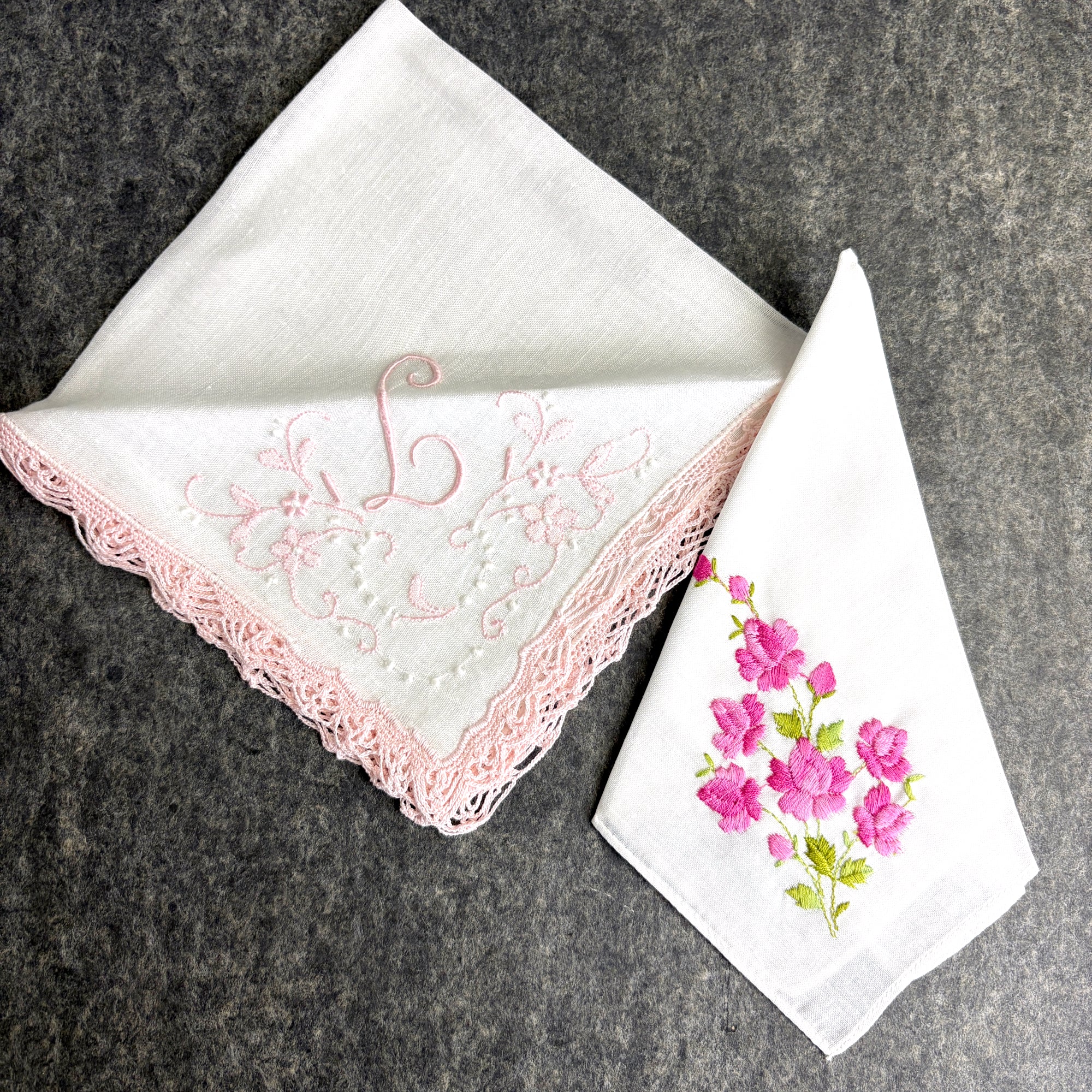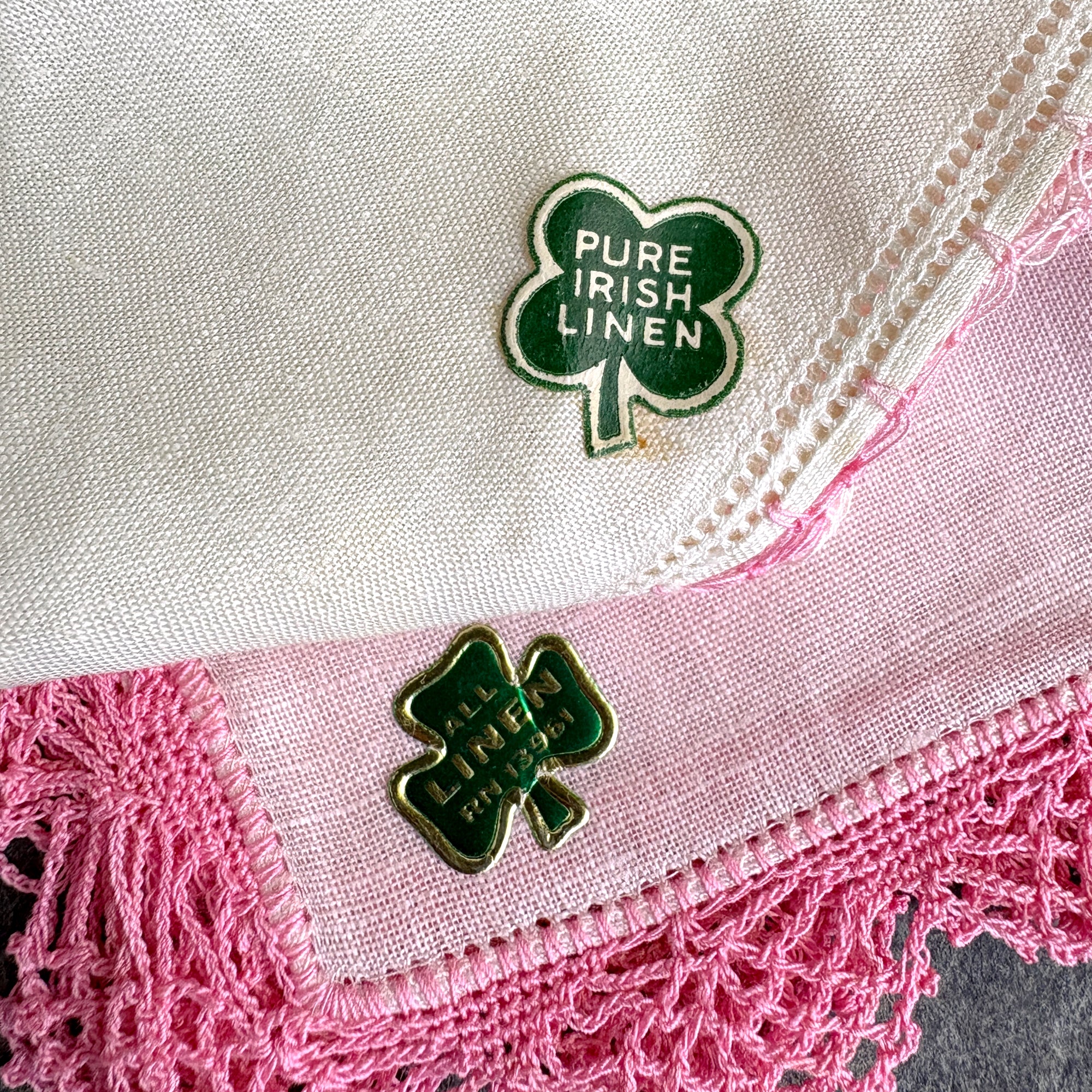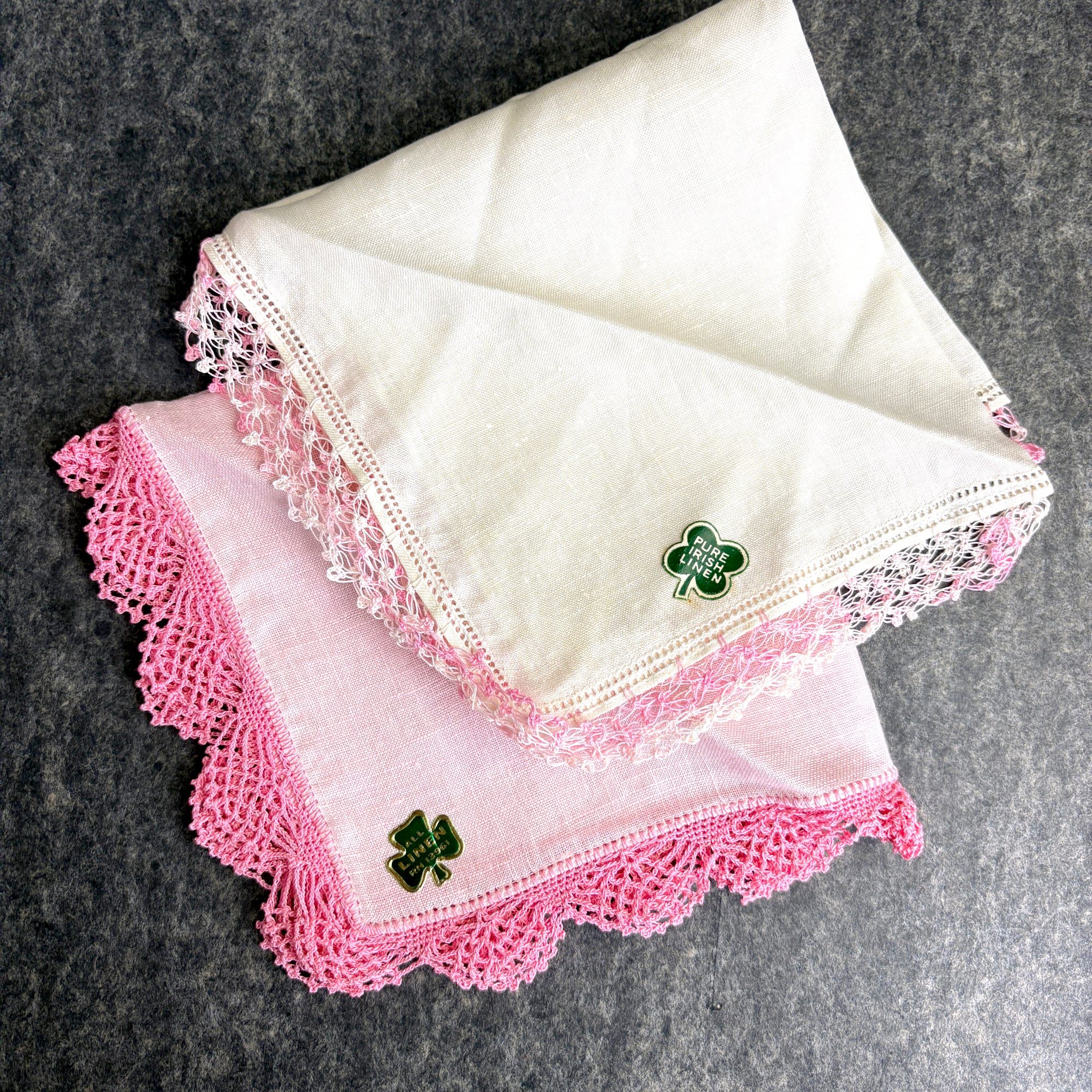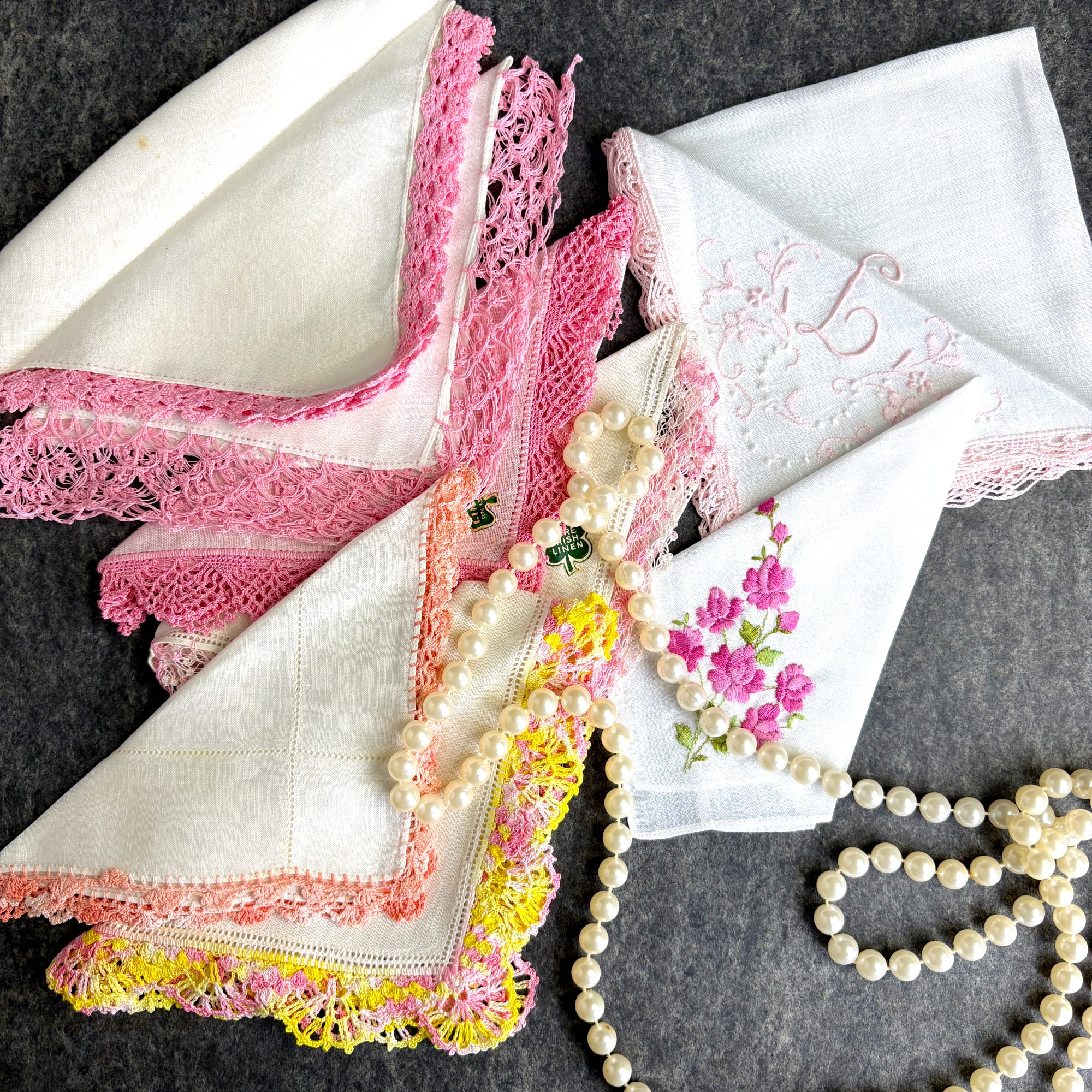 Lot of 8 vintage linen hankies, one with floral embroidery, one with embroidered monogram "L" and crochet trim, and 6 with trim crocheted in shades of pink, are wonderful for wedding, shower or tea party favors. 2 have Irish linen stickers. The linen is crisp, and many appear unused.