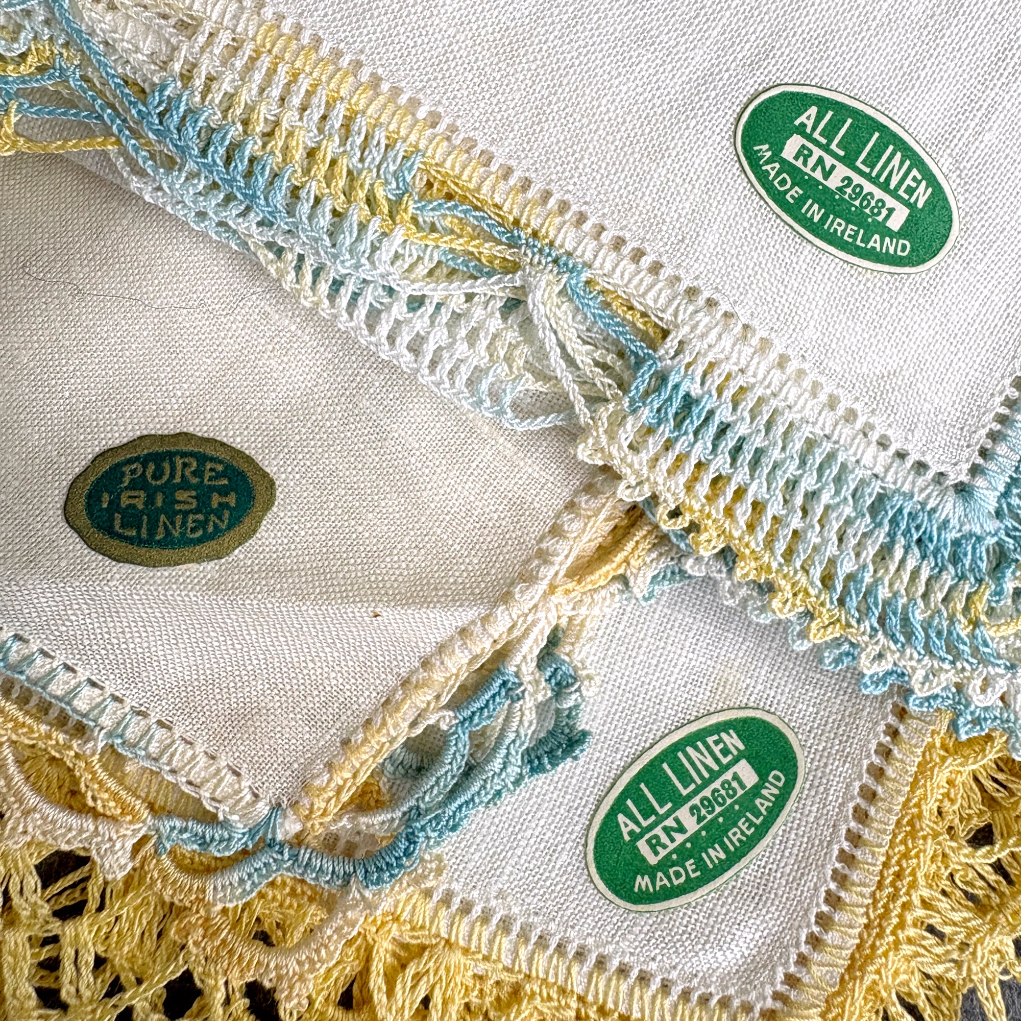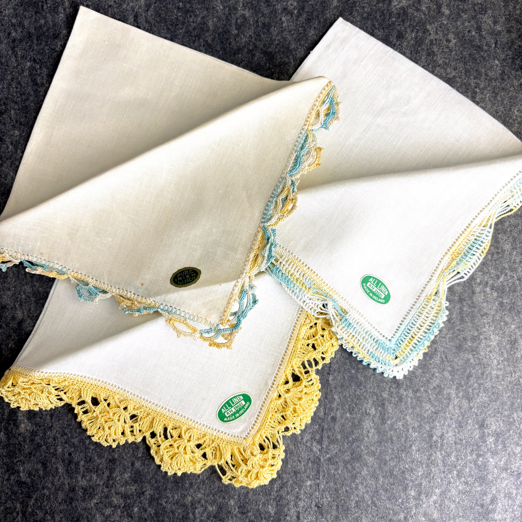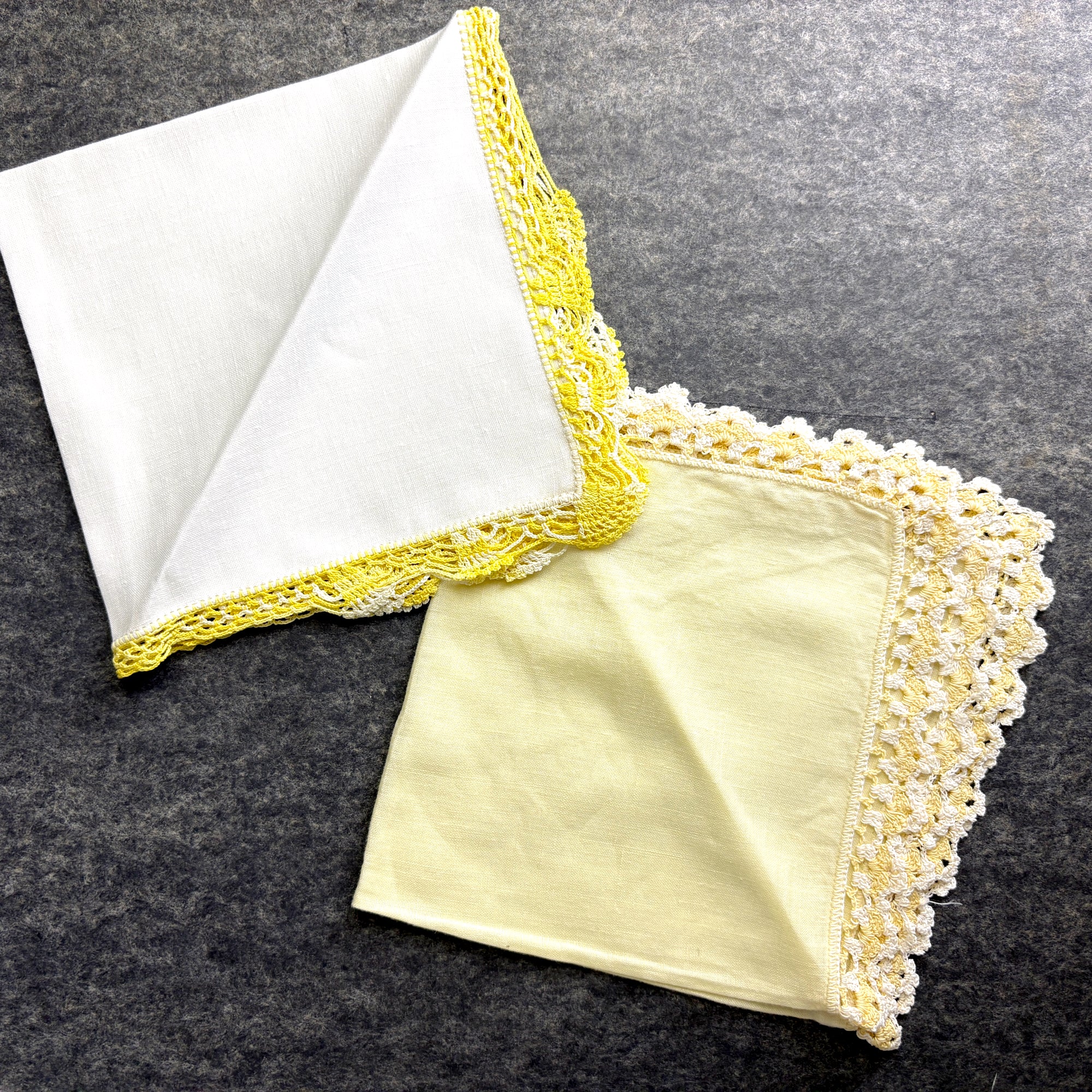 Lot of 11 vintage linen hankies, one with floral embroidery and 10 with trim crocheted in shades of yellow, are wonderful for wedding, shower or tea party favors. 3 have Irish linen stickers. The linen is crisp, and many appear unused.