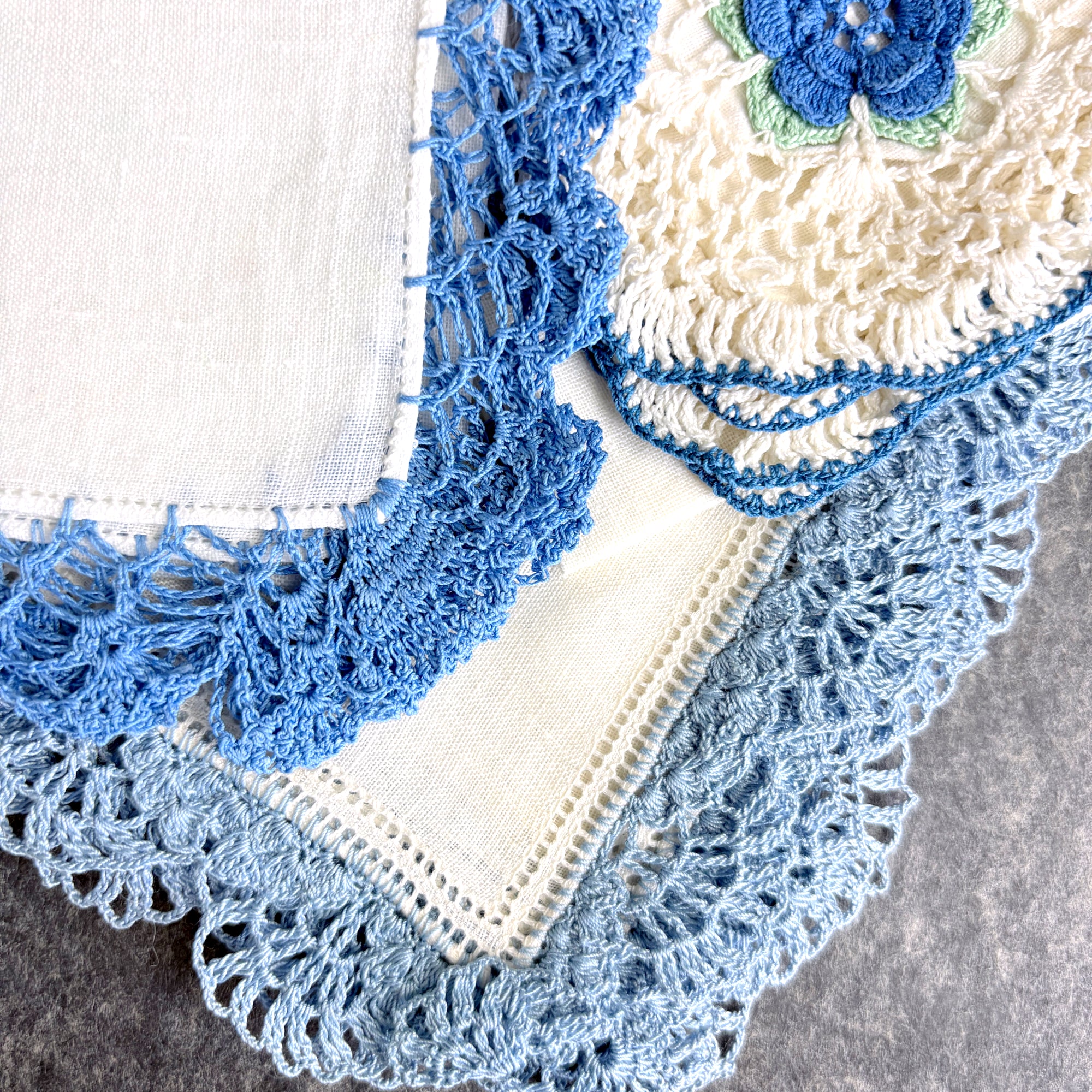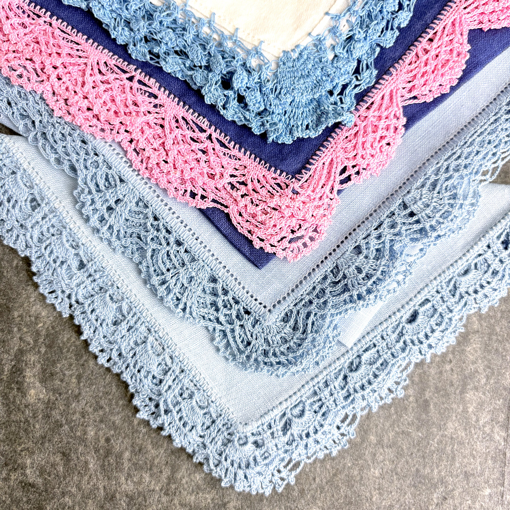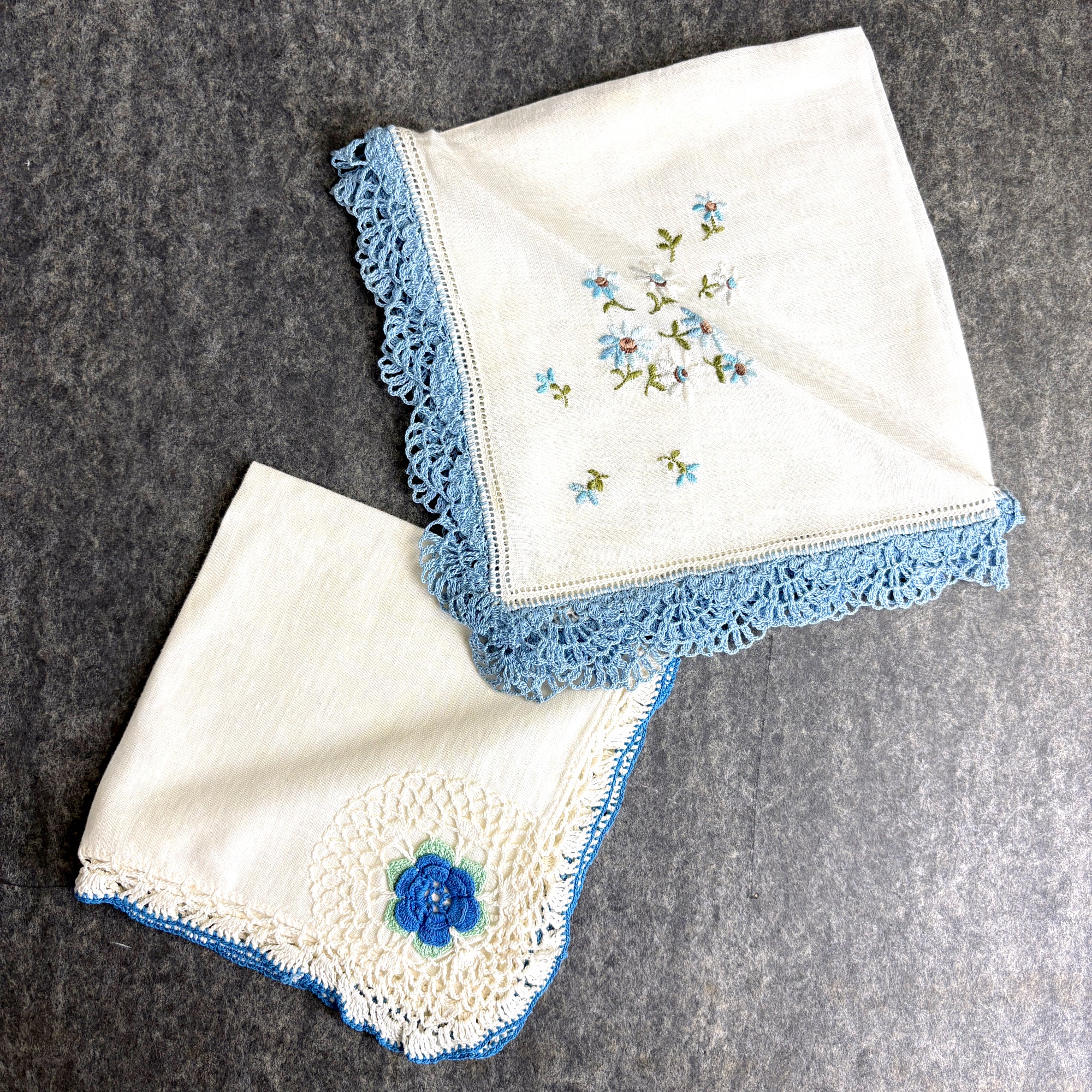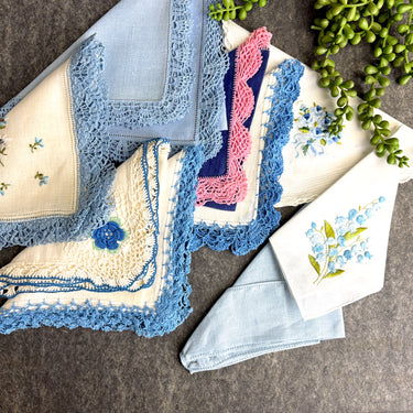 Very good vintage condition. One embroidered and crochet-trimmed hanky has a light sticker mark in one corner. As with all vintage items, these pieces have been used and loved, adding to their unique history and character. Please review all photos carefully.