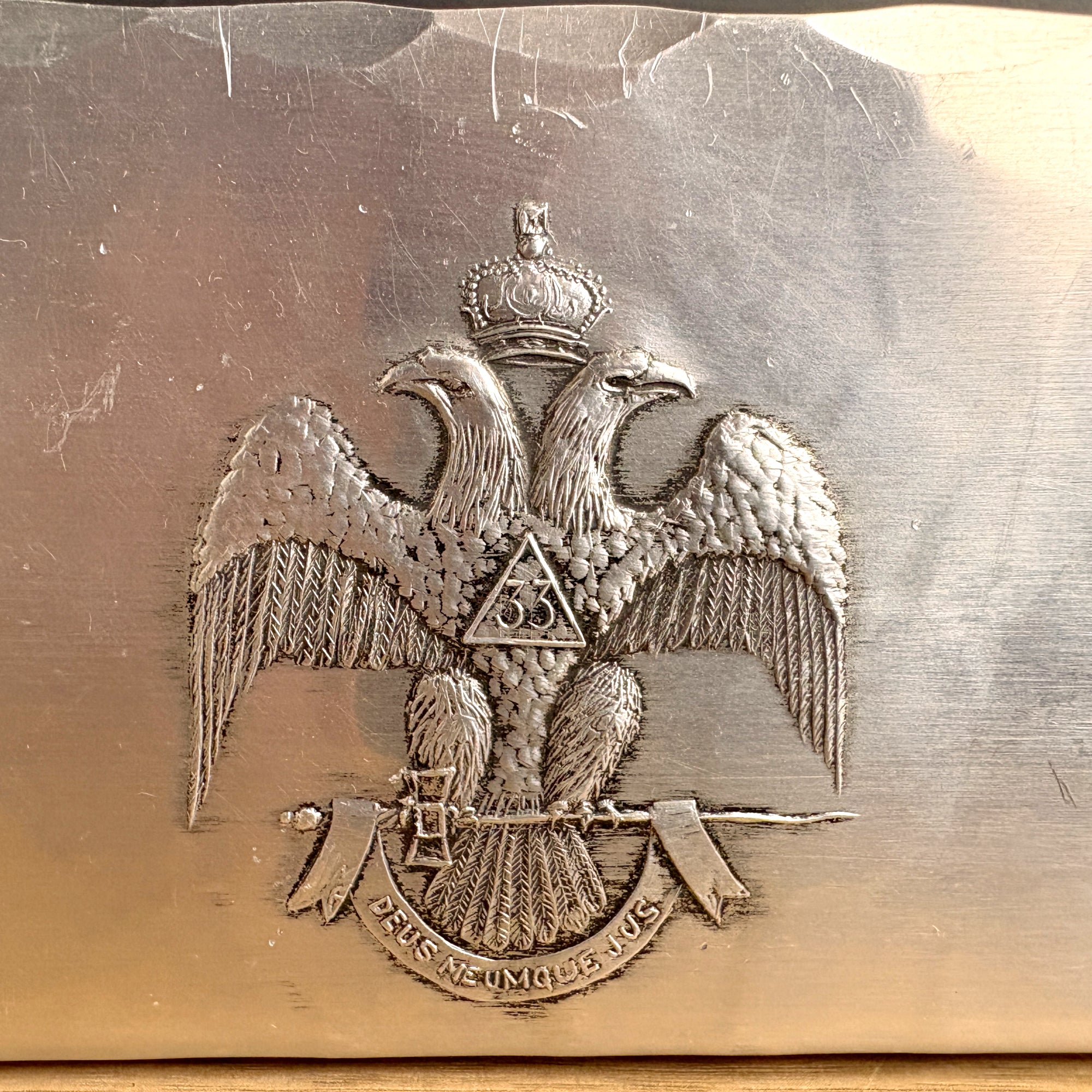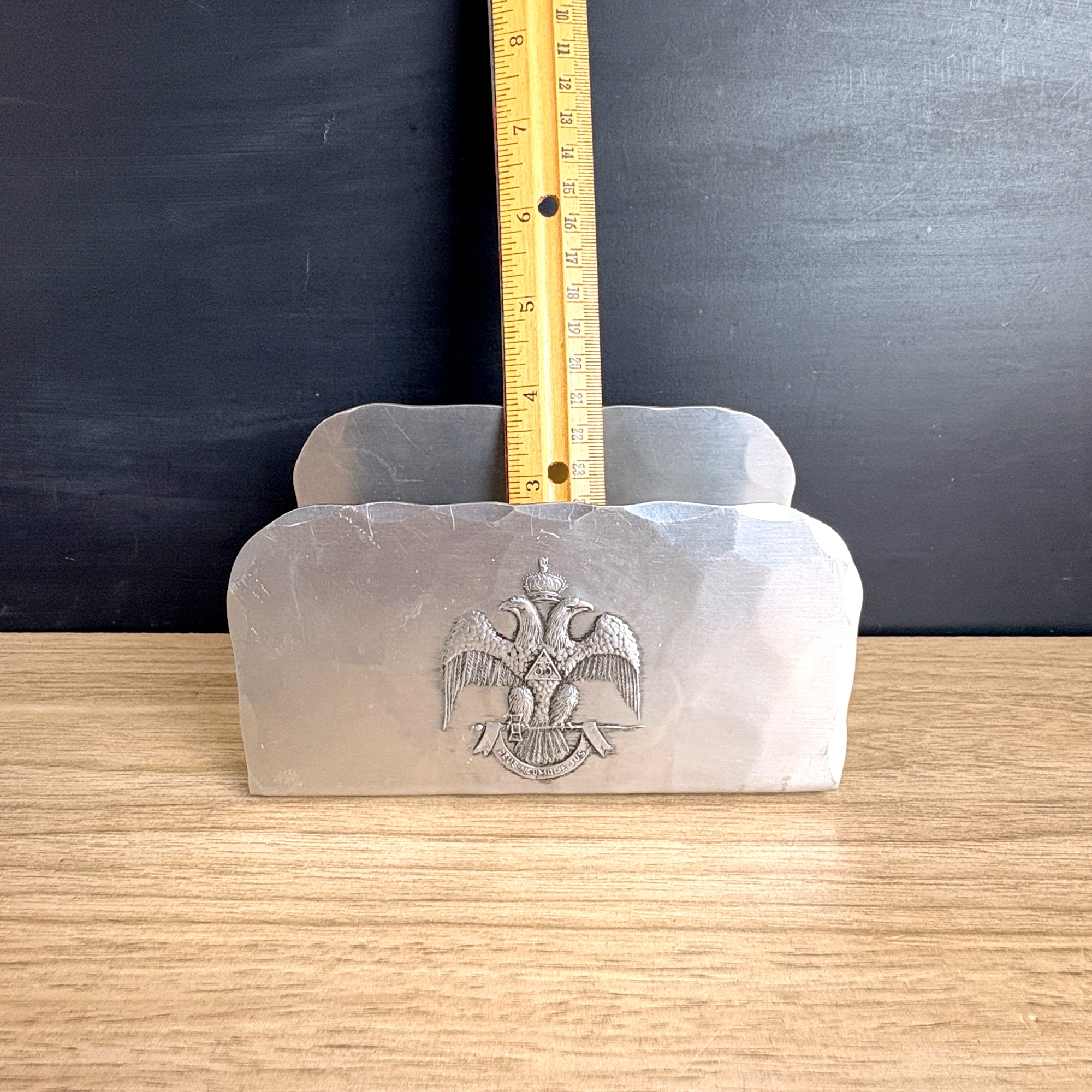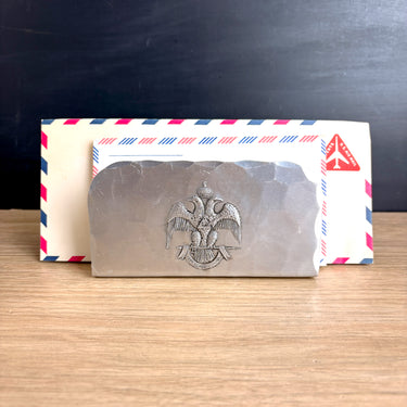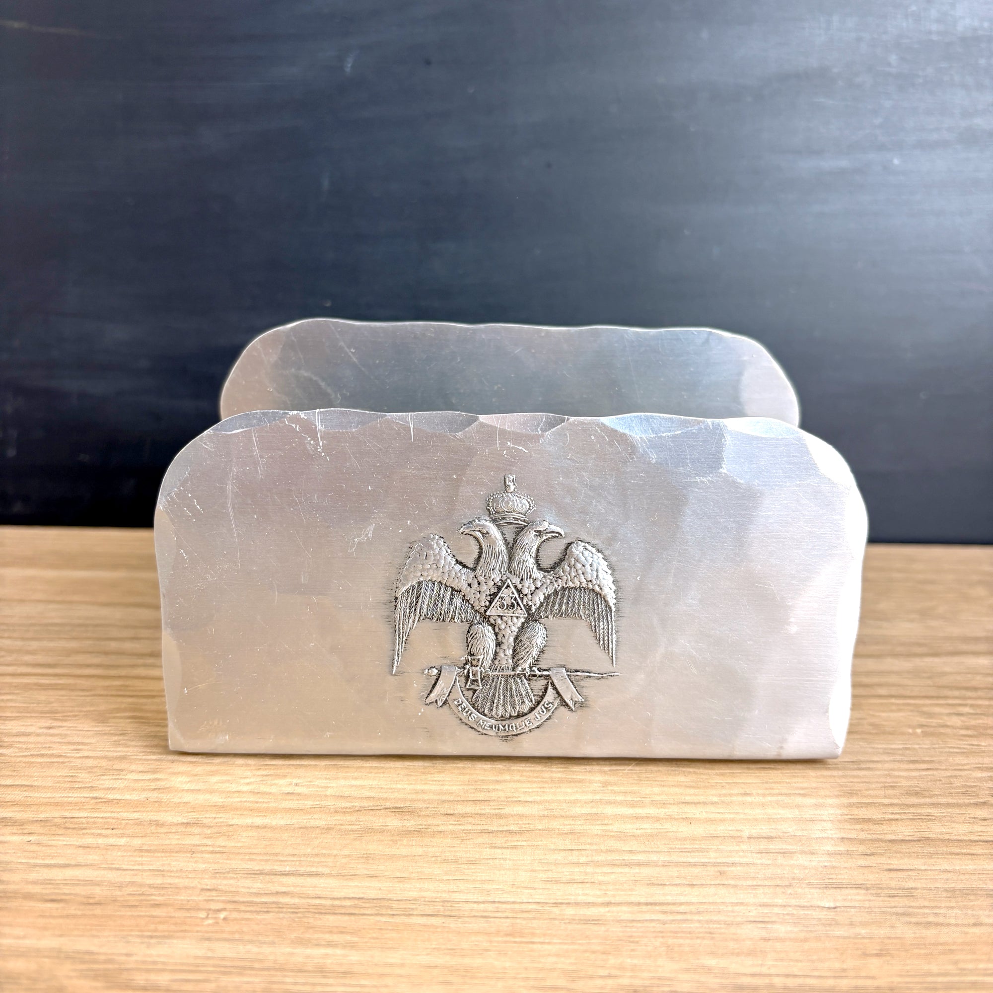 Hammered aluminum letter holder with the emblem of the Scottish Rite of Freemasonry, 33rd degree - a double headed eagle with a triangle containing the number 33 and the Latin motto "Deus Meumque Jus" on the banner below. Hand made by Natale, Leesburg, PA for the Supreme Council 33rd° N.M.J.