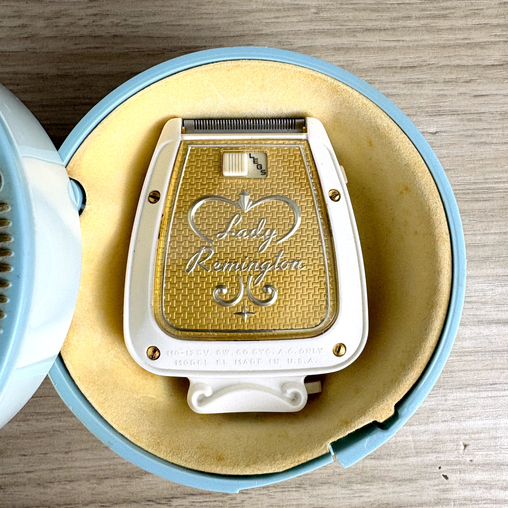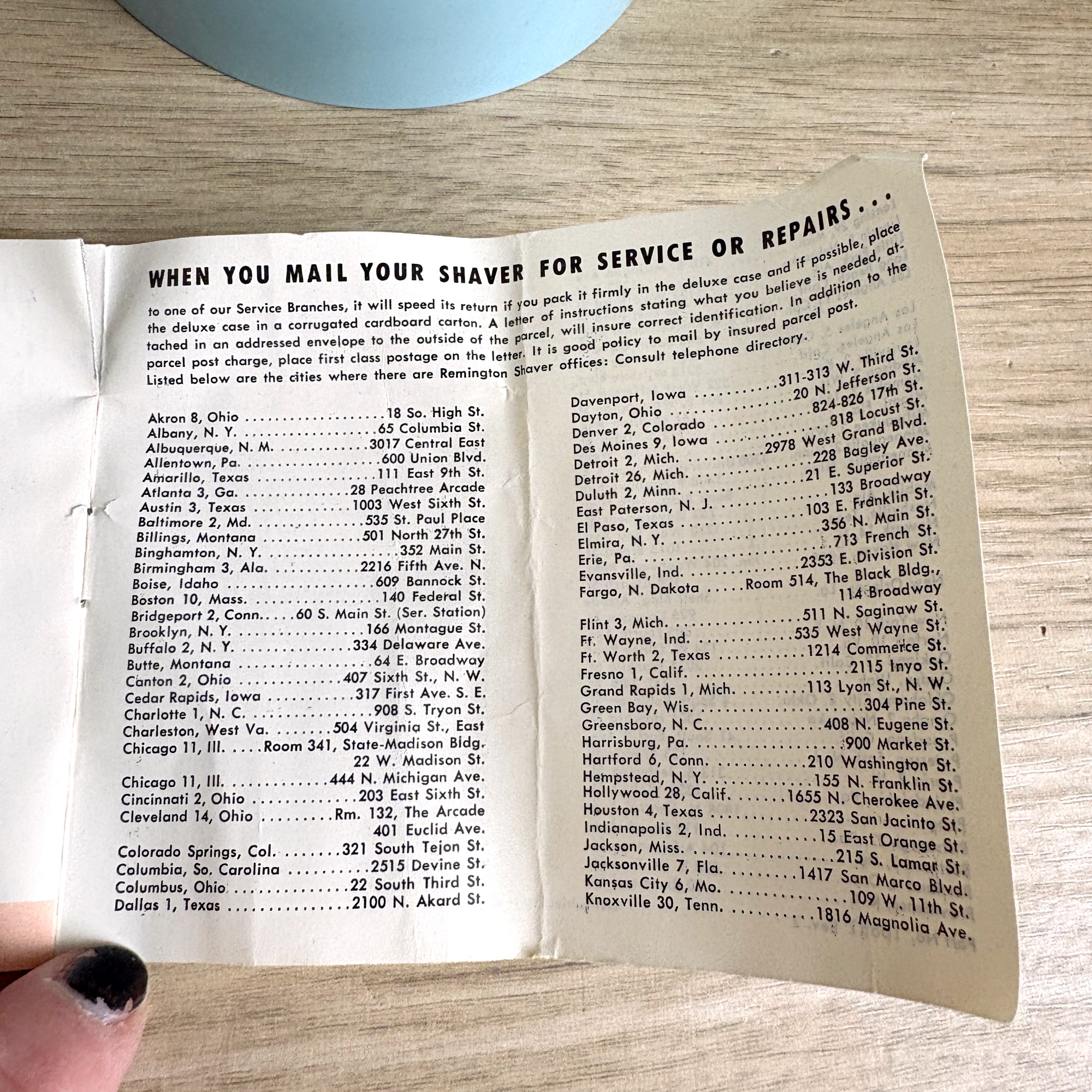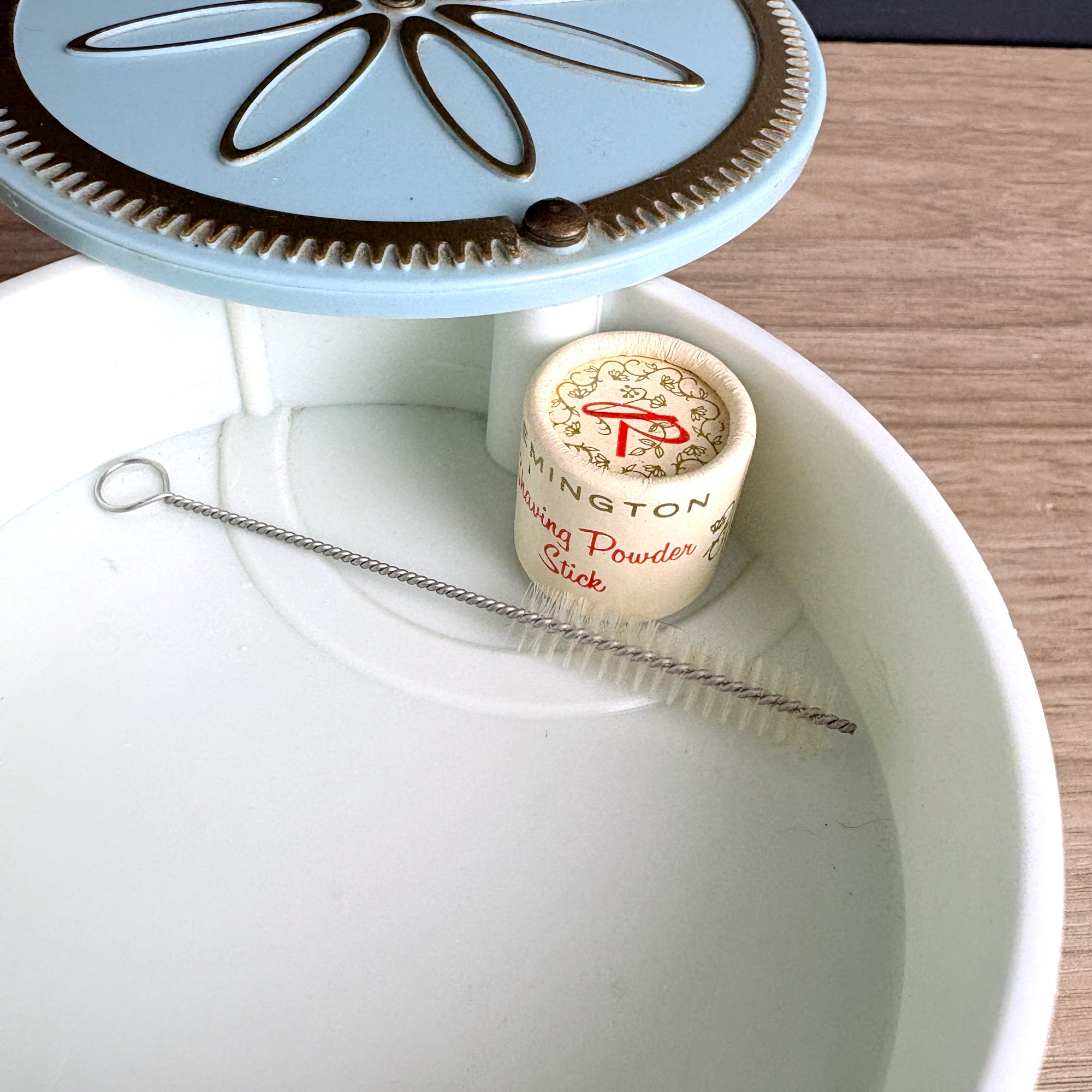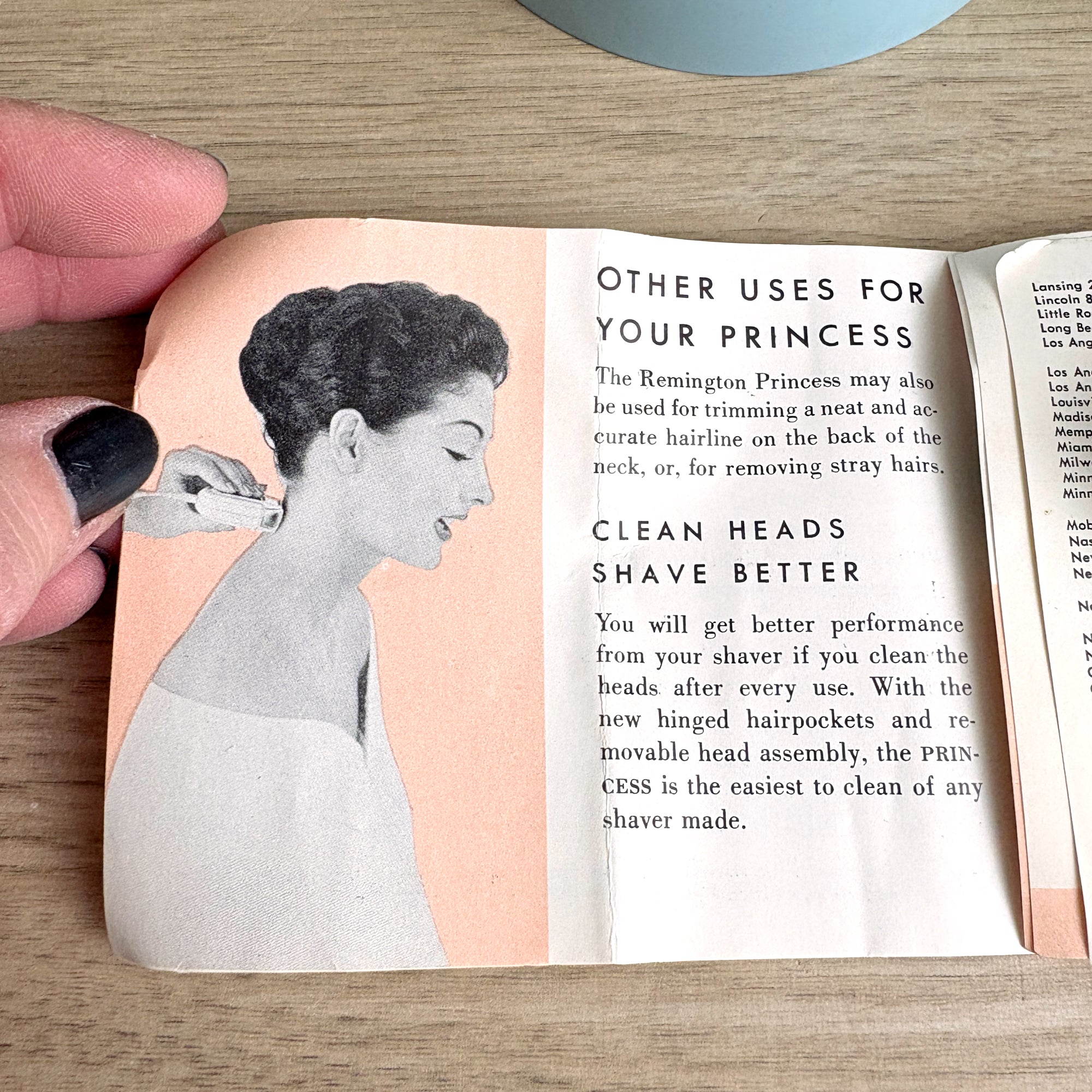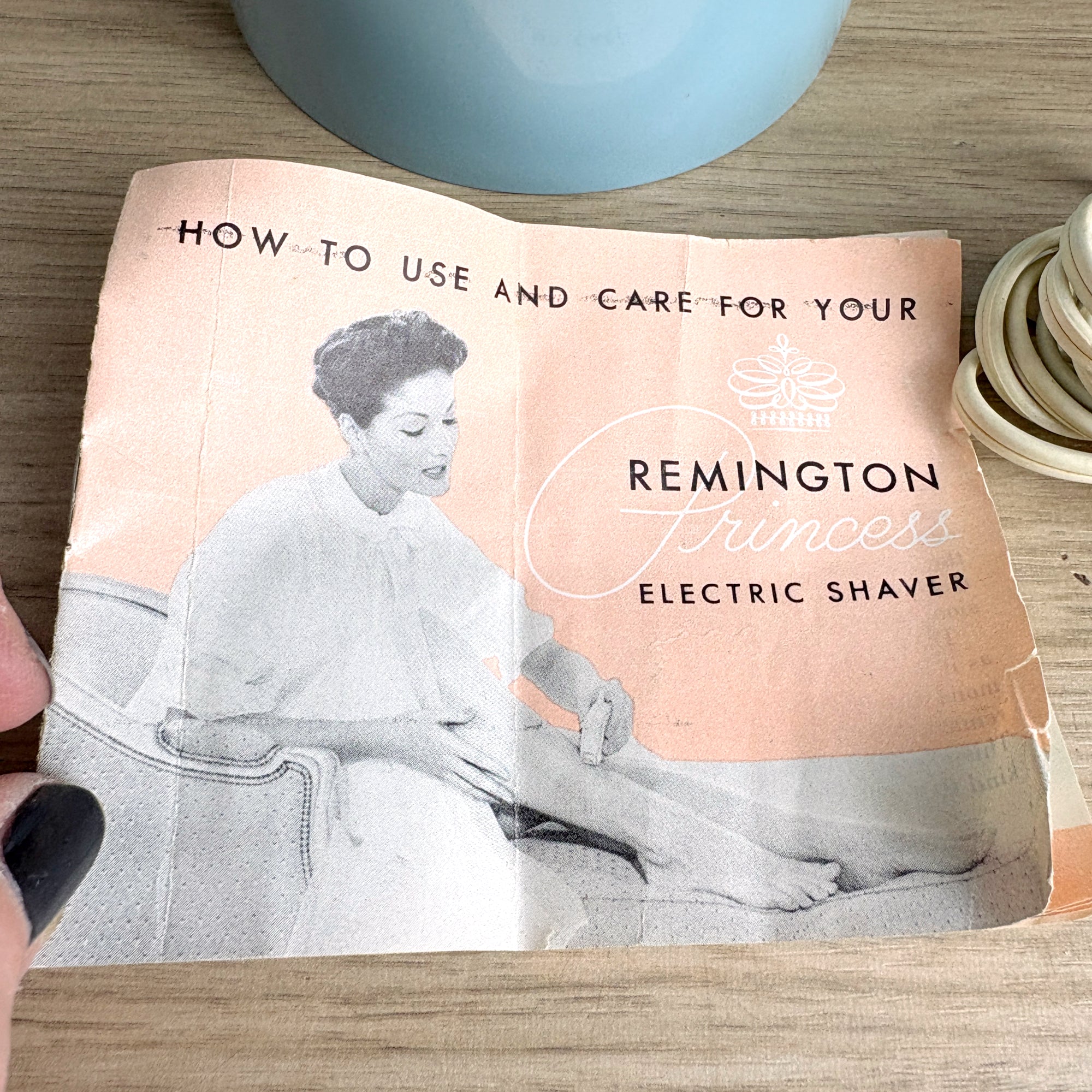 Vintage Remington Princess electric razor in swiveling round hard case with 2 separate sections. Includes cord and cord keeper, cleaning brush, shaving powder stick and instructions with fantastic vintage photos. Baby blue atomic case with tan liner stamped Remington Rand, Made in USA, Pat Pend on the bottom.