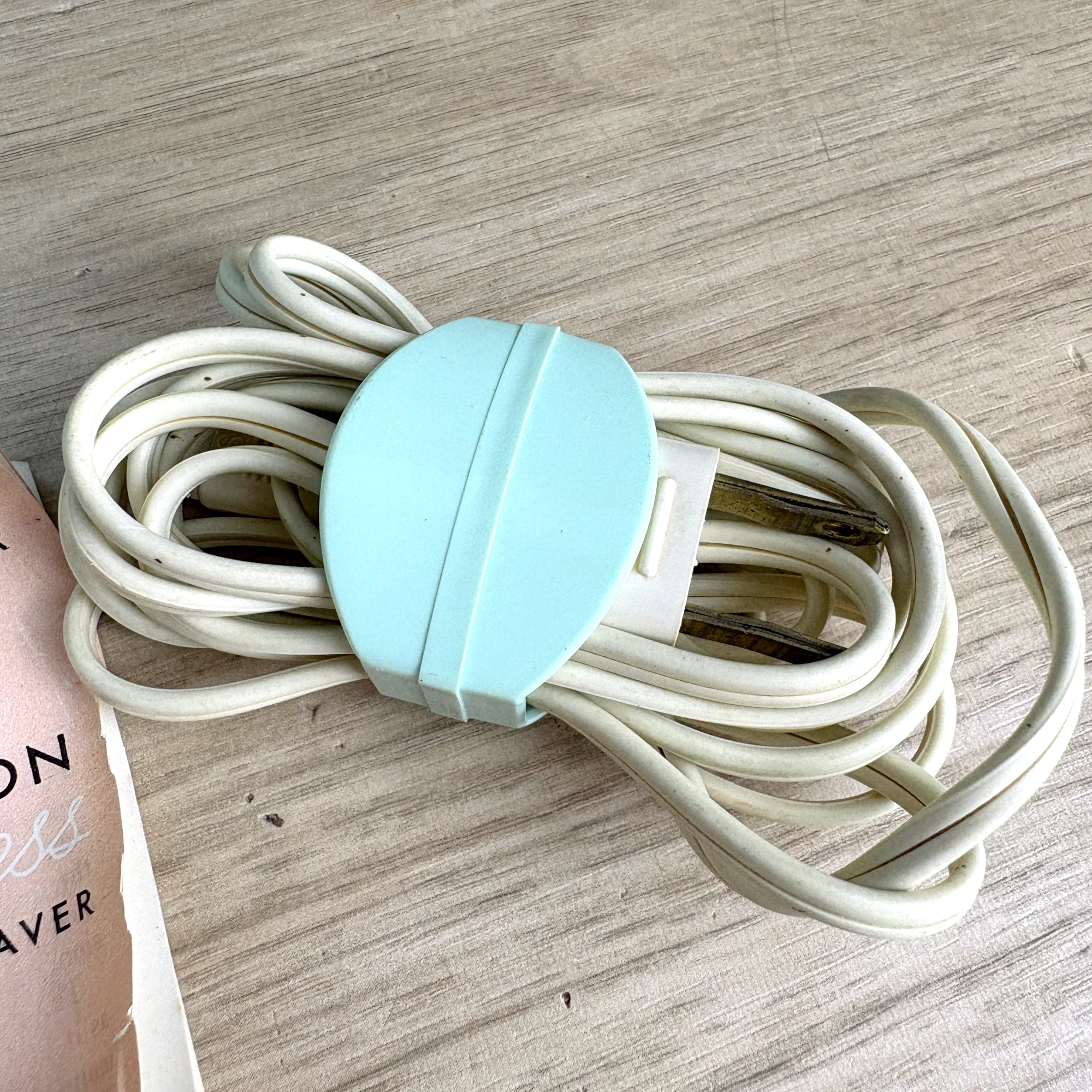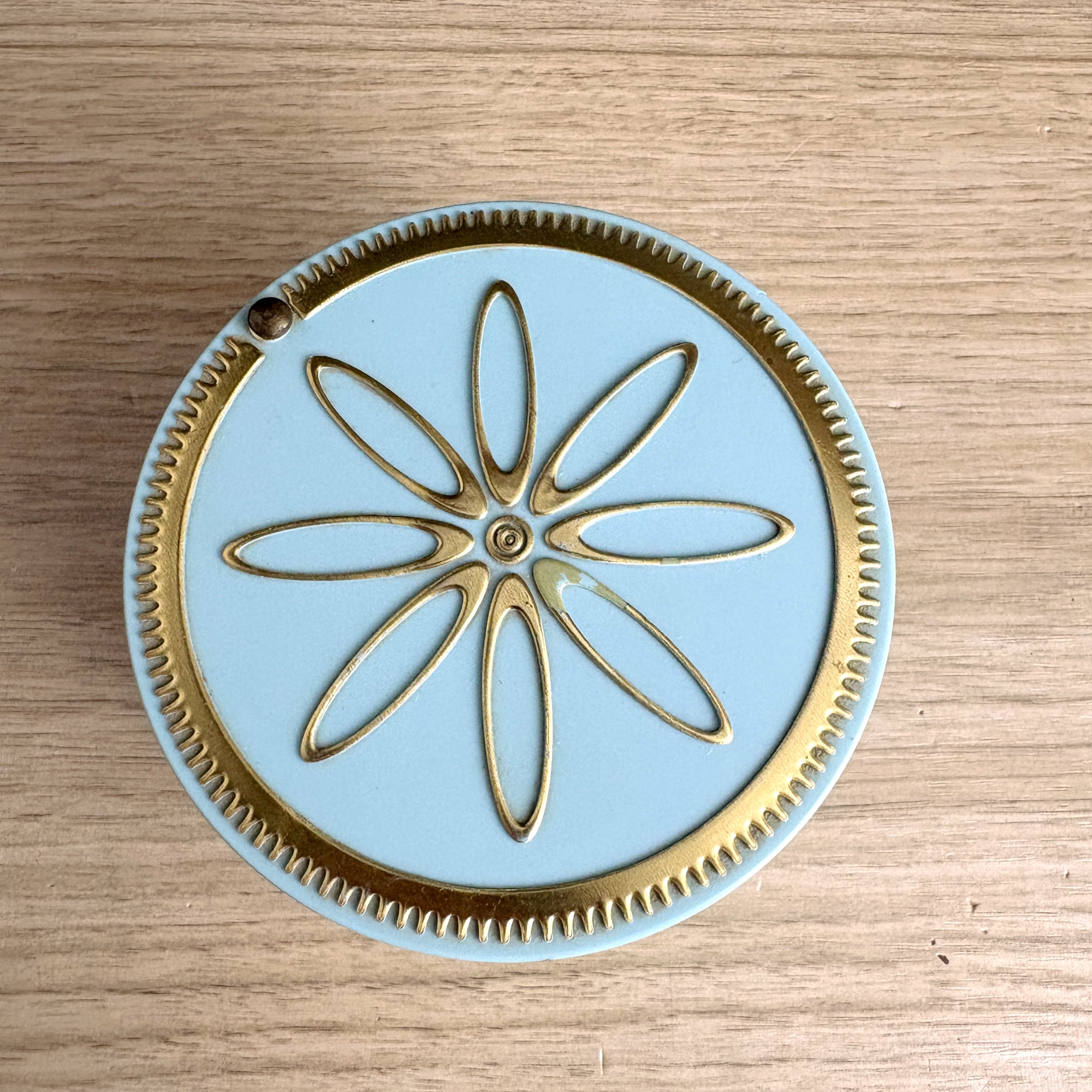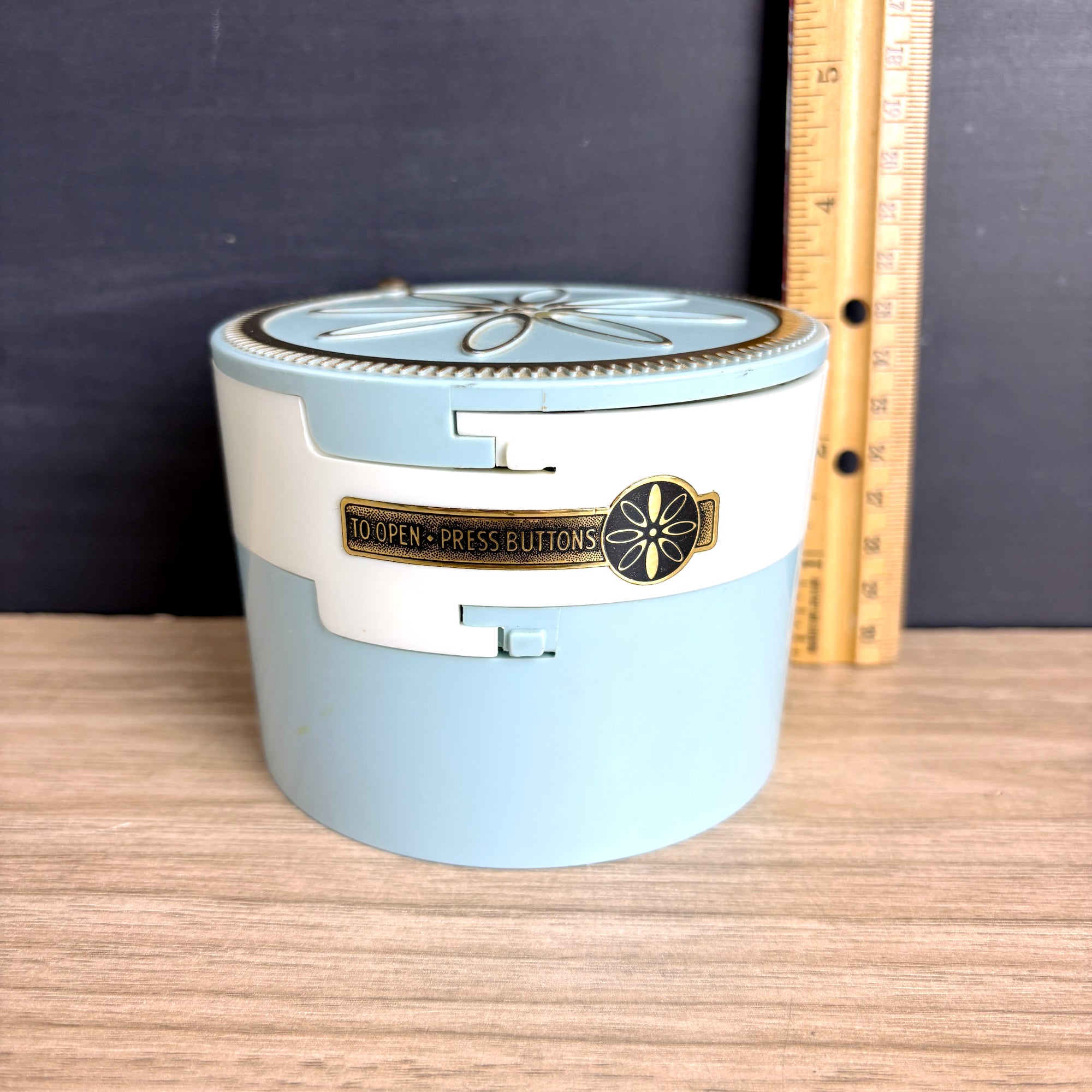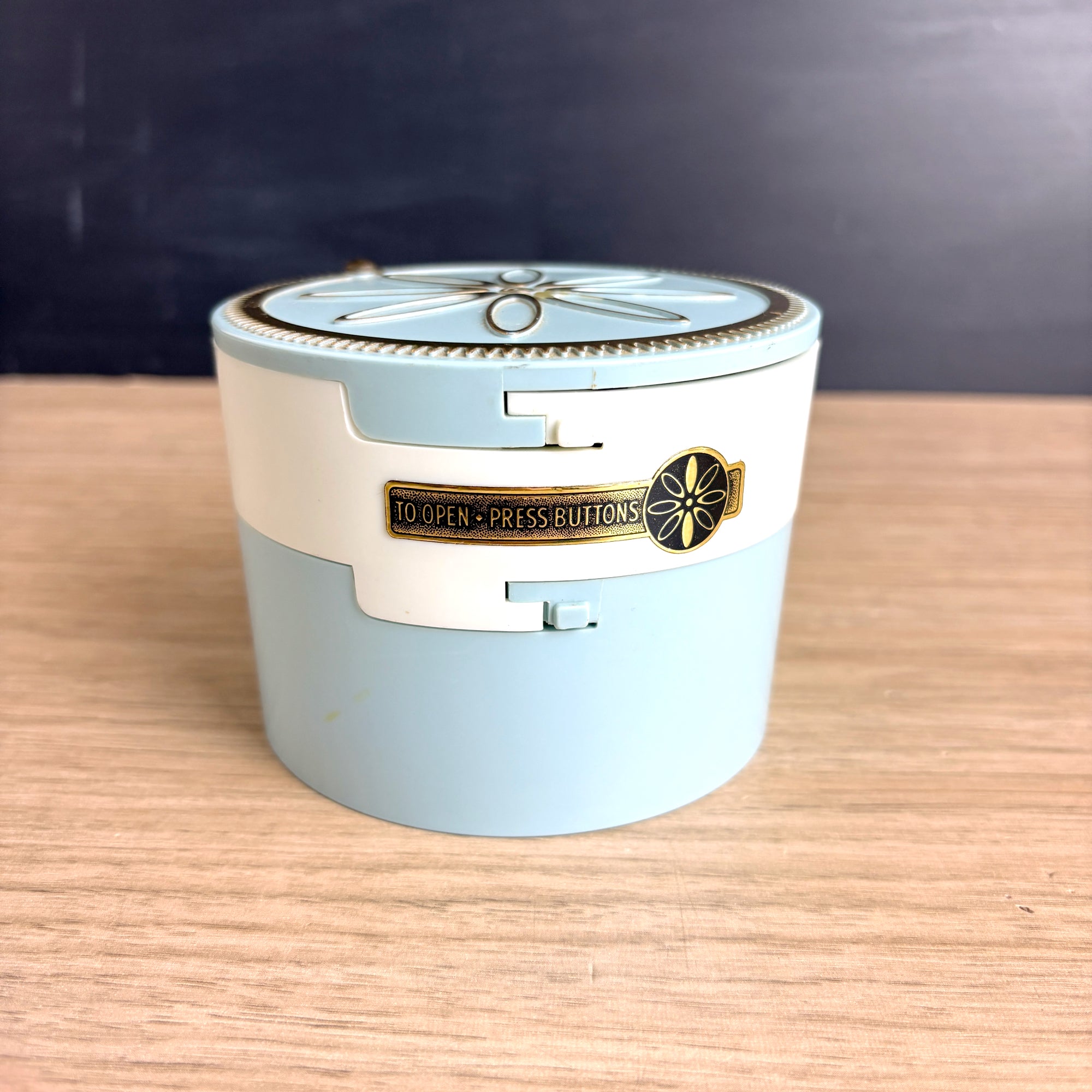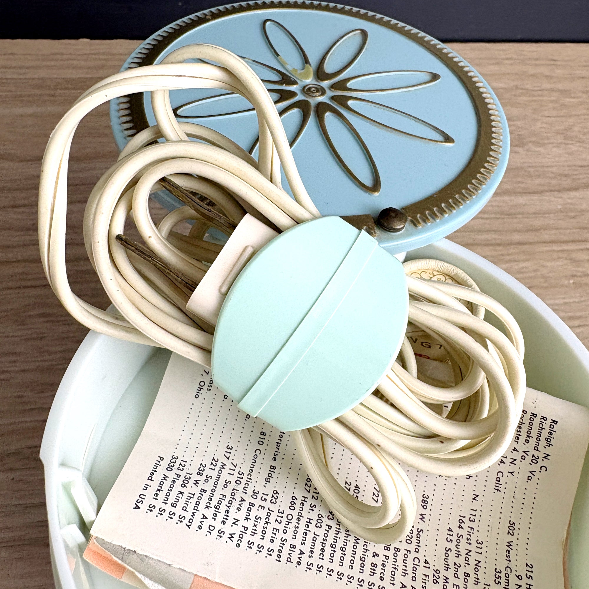 Vintage Remington Princess electric razor in swiveling round hard case with 2 separate sections. Includes cord and cord keeper, cleaning brush, shaving powder stick and instructions with fantastic vintage photos. Baby blue atomic case with tan liner stamped Remington Rand, Made in USA, Pat Pend on the bottom.