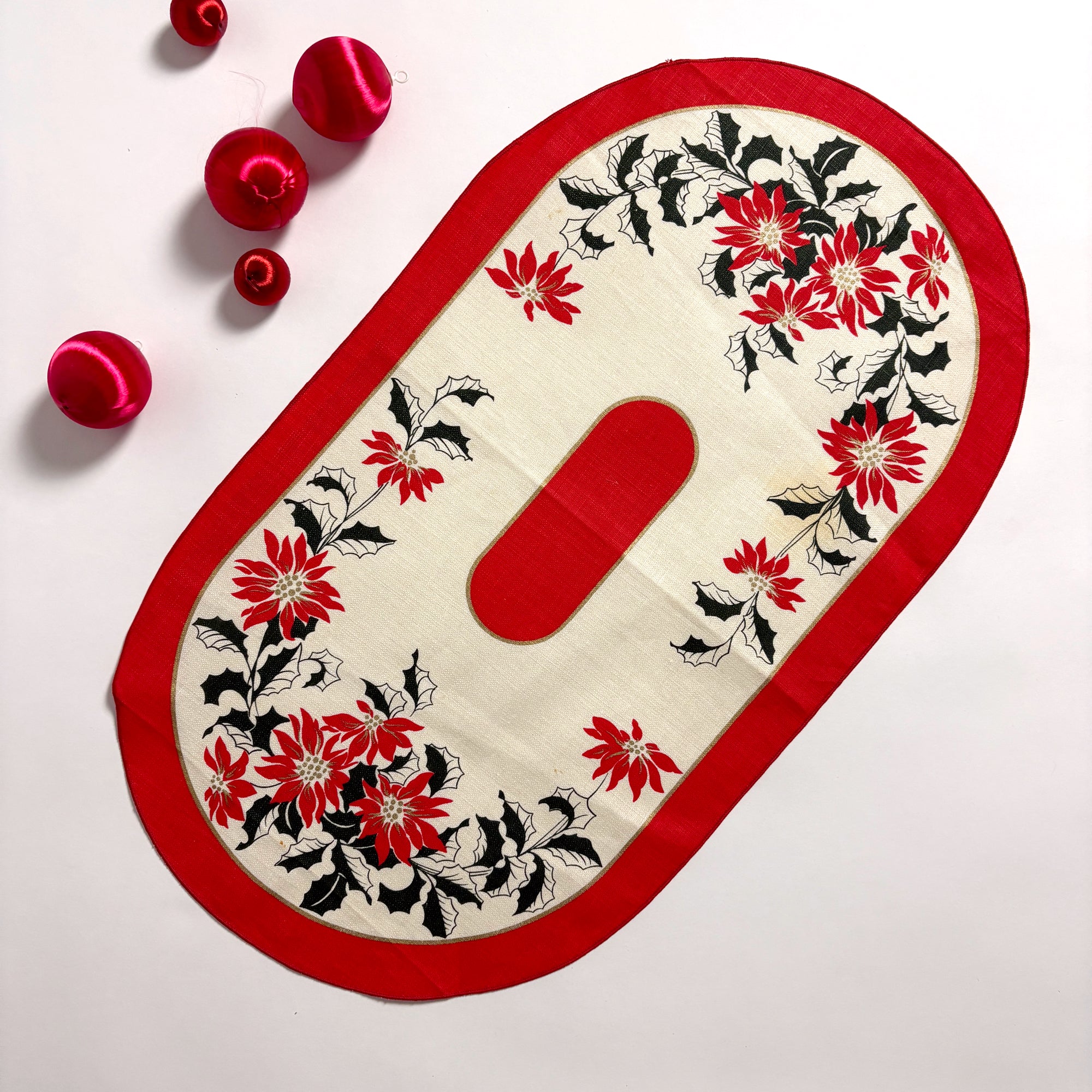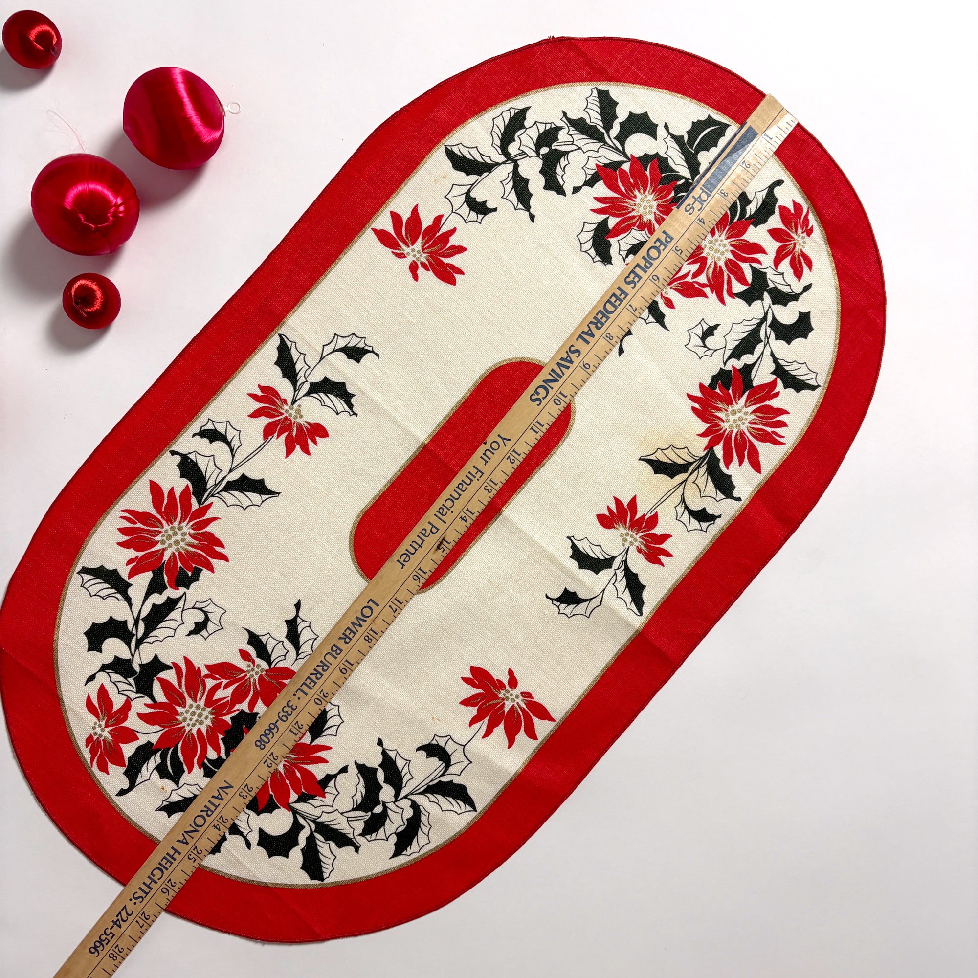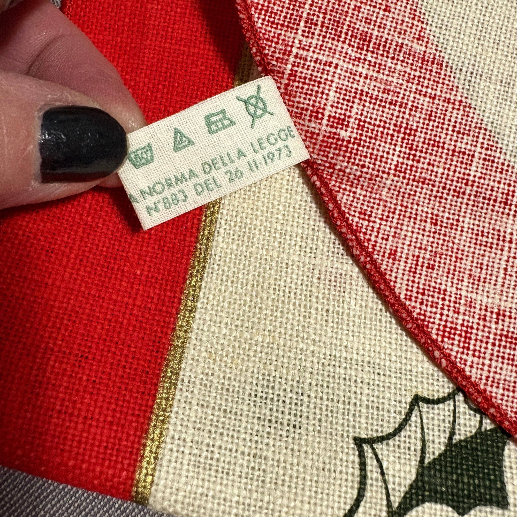 This vintage oval poinsettia linen table runner was made in Galliate, Italy of 100% pure linen. Bright red Christmas poinsettia with dark green leaves and gold accents, with a bright red border. The label indicates a November 1973 date of manufacture. The Cotonificio di Galliate" (cotton factory of Galliate) closed in 1984.