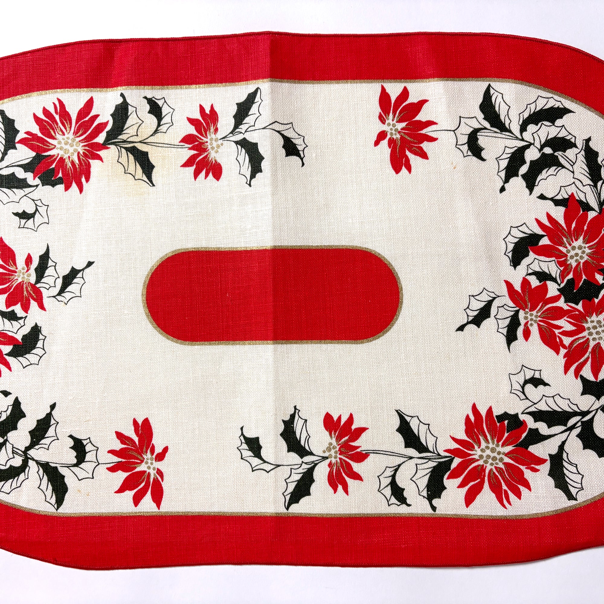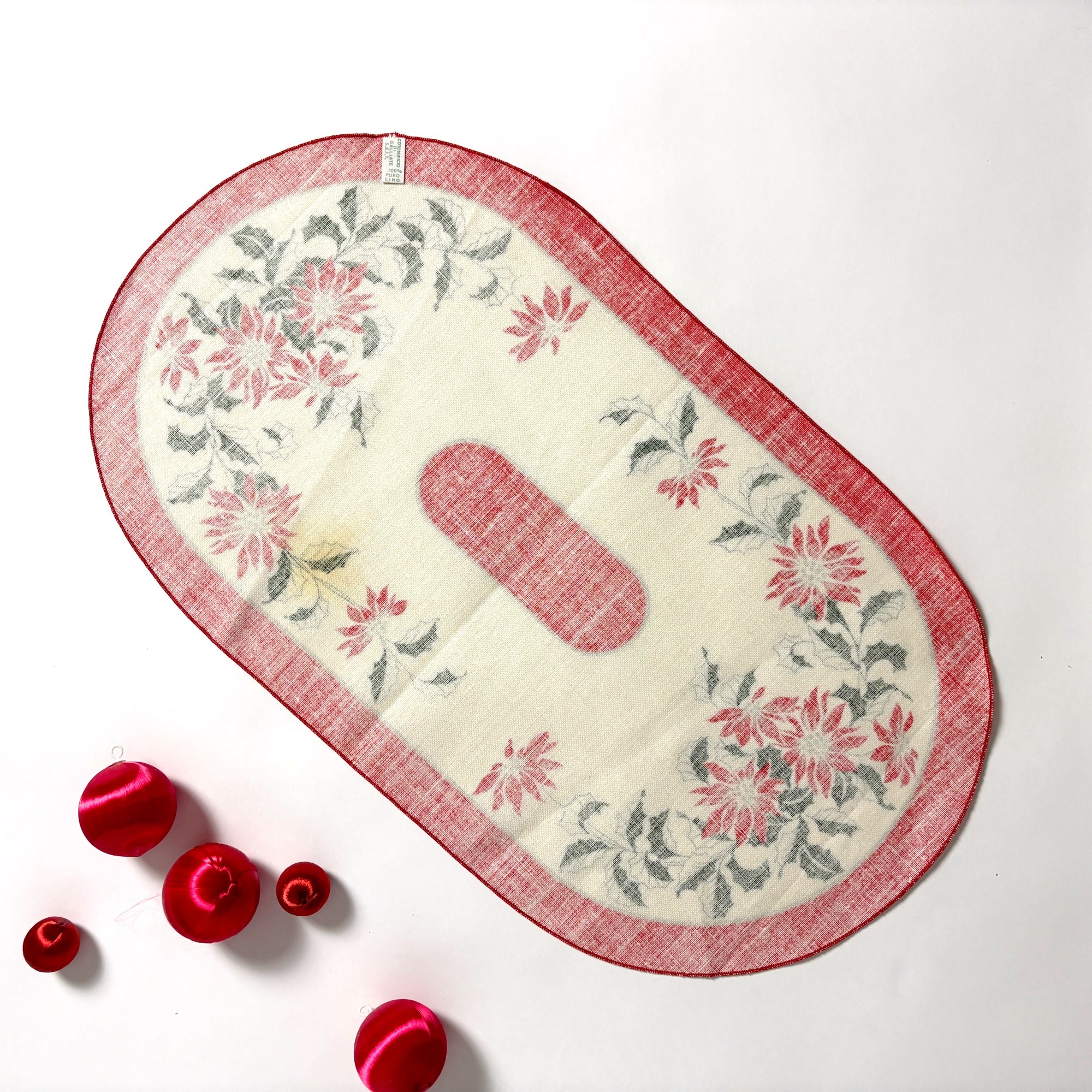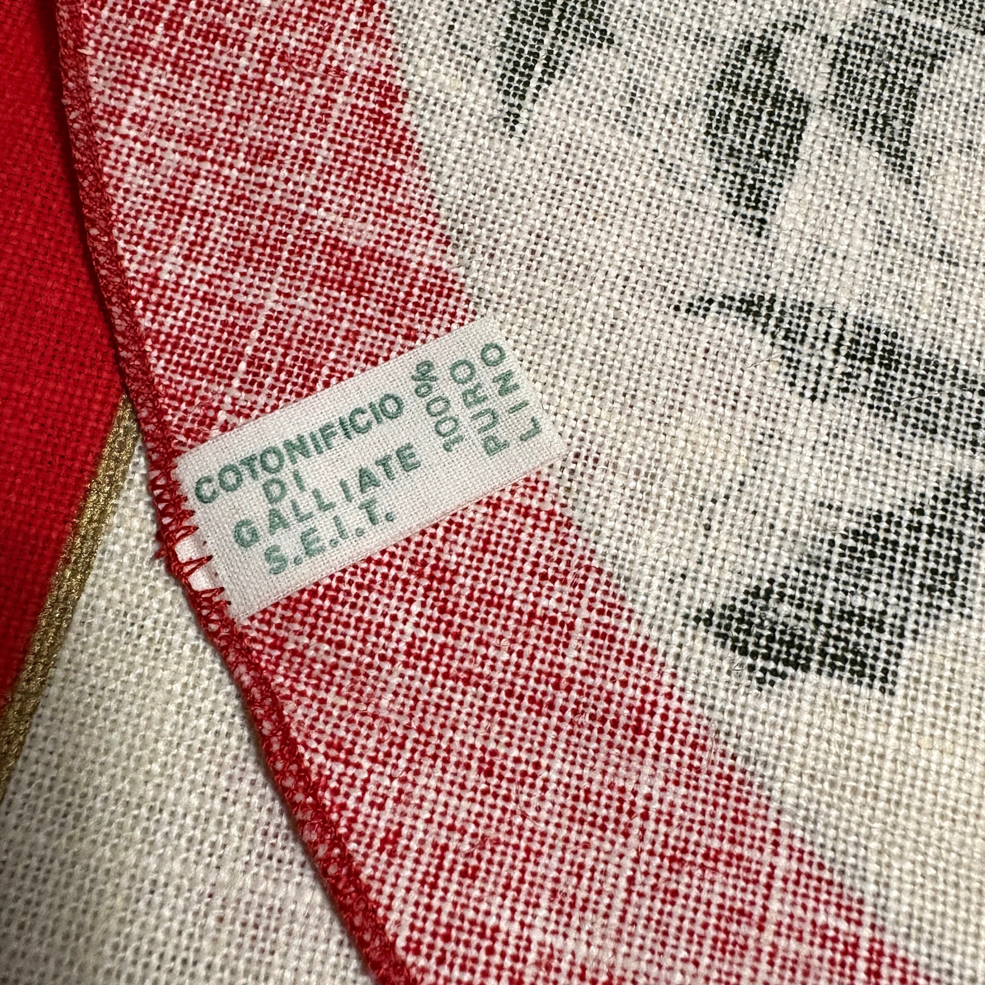 This vintage oval poinsettia linen table runner was made in Galliate, Italy of 100% pure linen. Bright red Christmas poinsettia with dark green leaves and gold accents, with a bright red border. The label indicates a November 1973 date of manufacture. The Cotonificio di Galliate" (cotton factory of Galliate) closed in 1984.