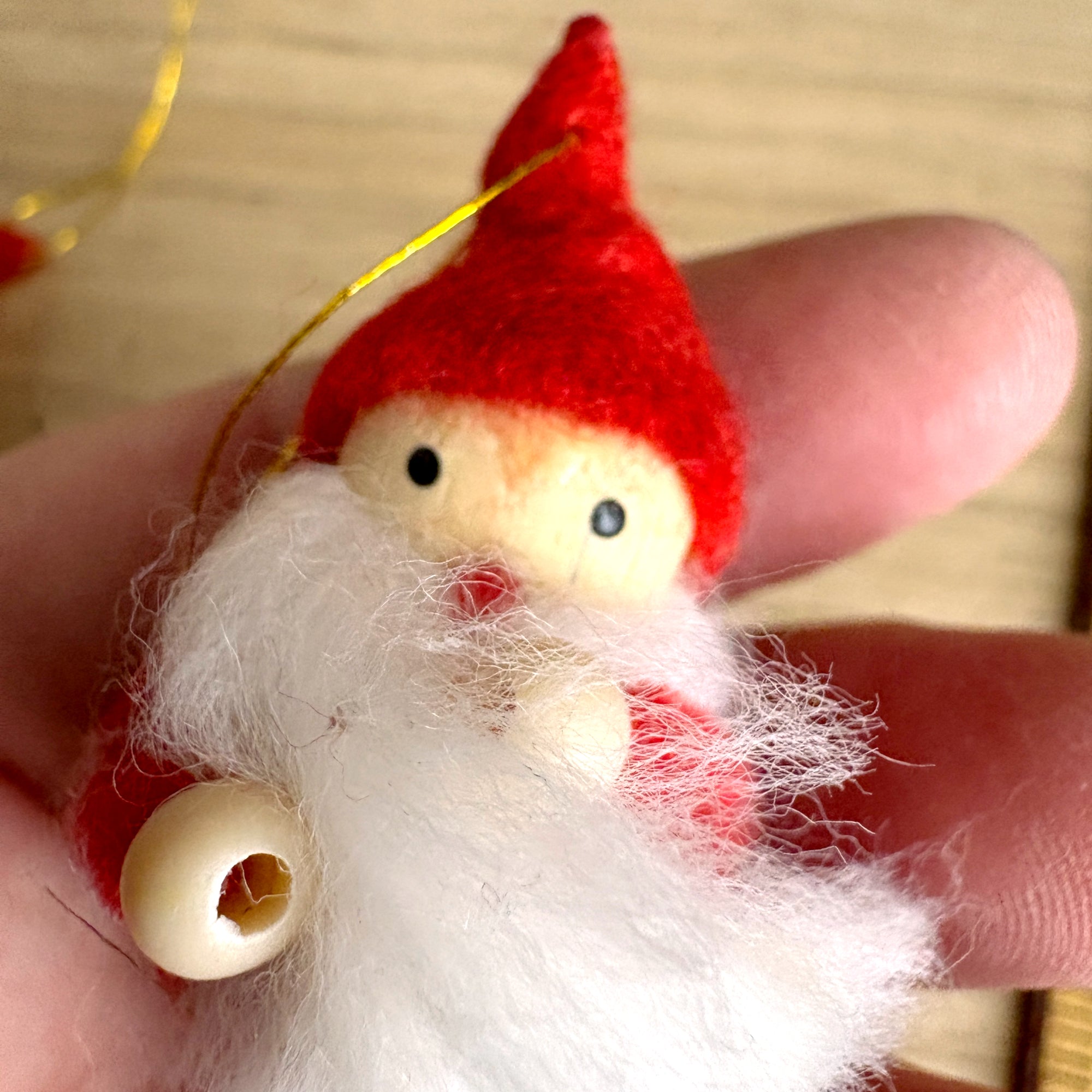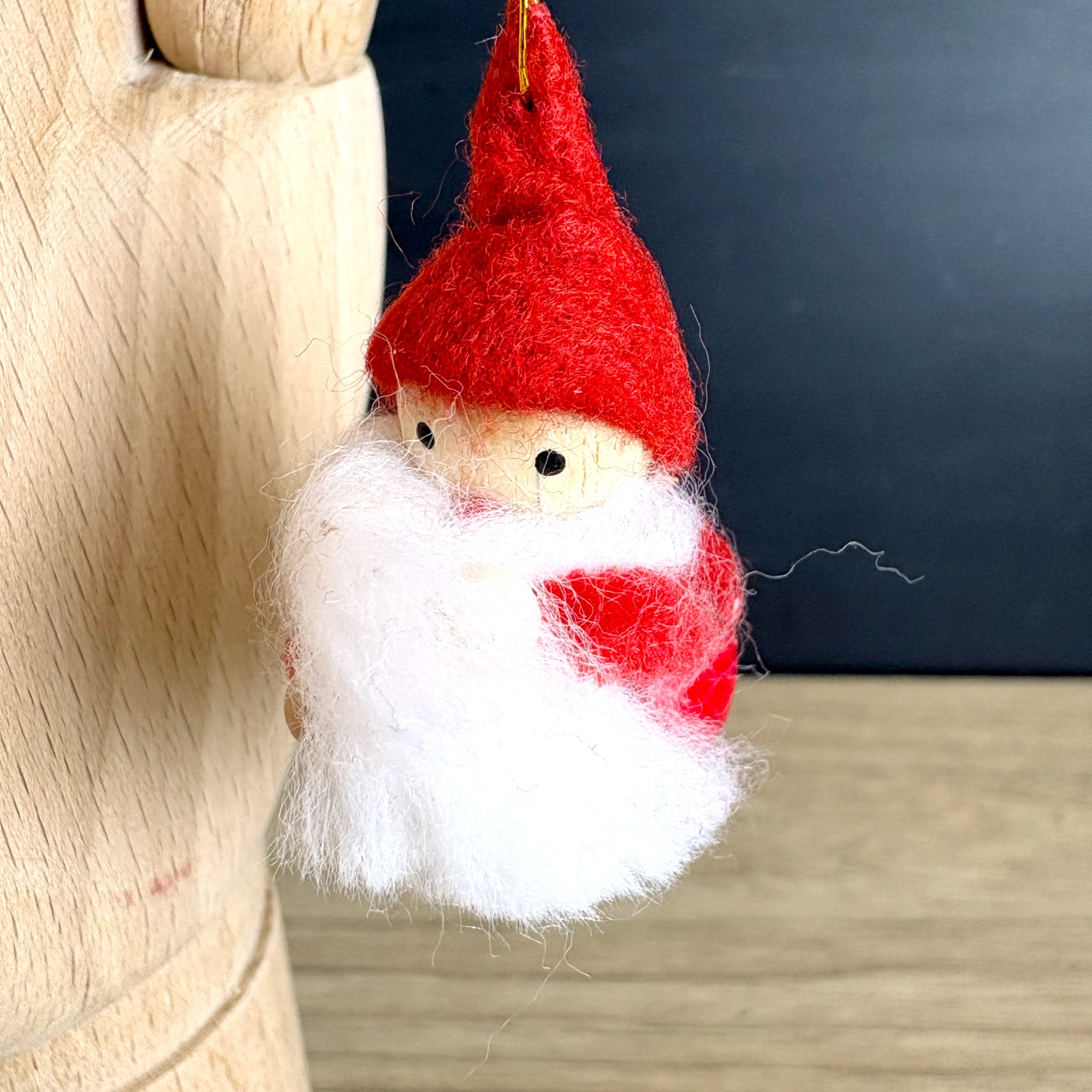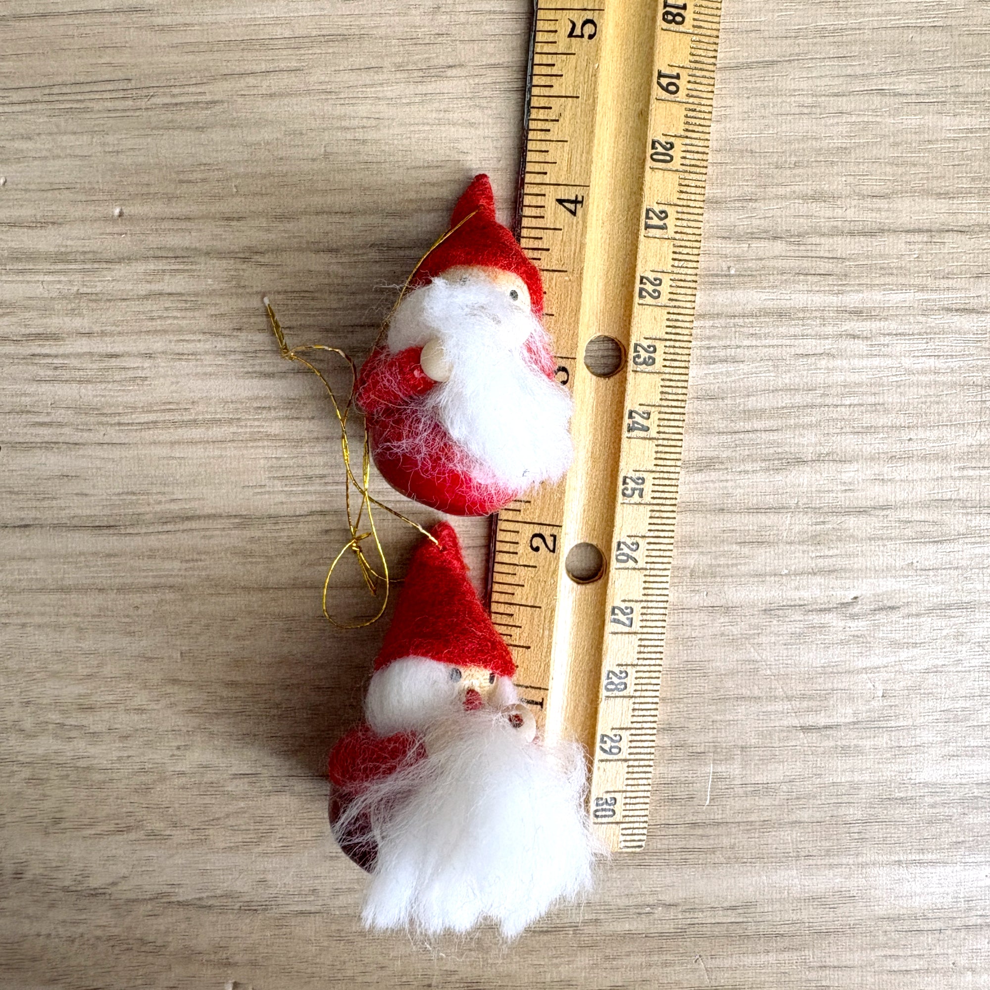 A merry little pair of vintage miniature Santa ornaments Each Santa has a red dipped styrofoam body, a wooden head with a red plastic nose, hand-painted black eyes, and a soft white cotton beard. Adorned with red felt suits and hats, and cream-colored plastic bead hands. Each ornament is finished with a thin gold hanging cord—ready for display on your tree, wreath or garland.