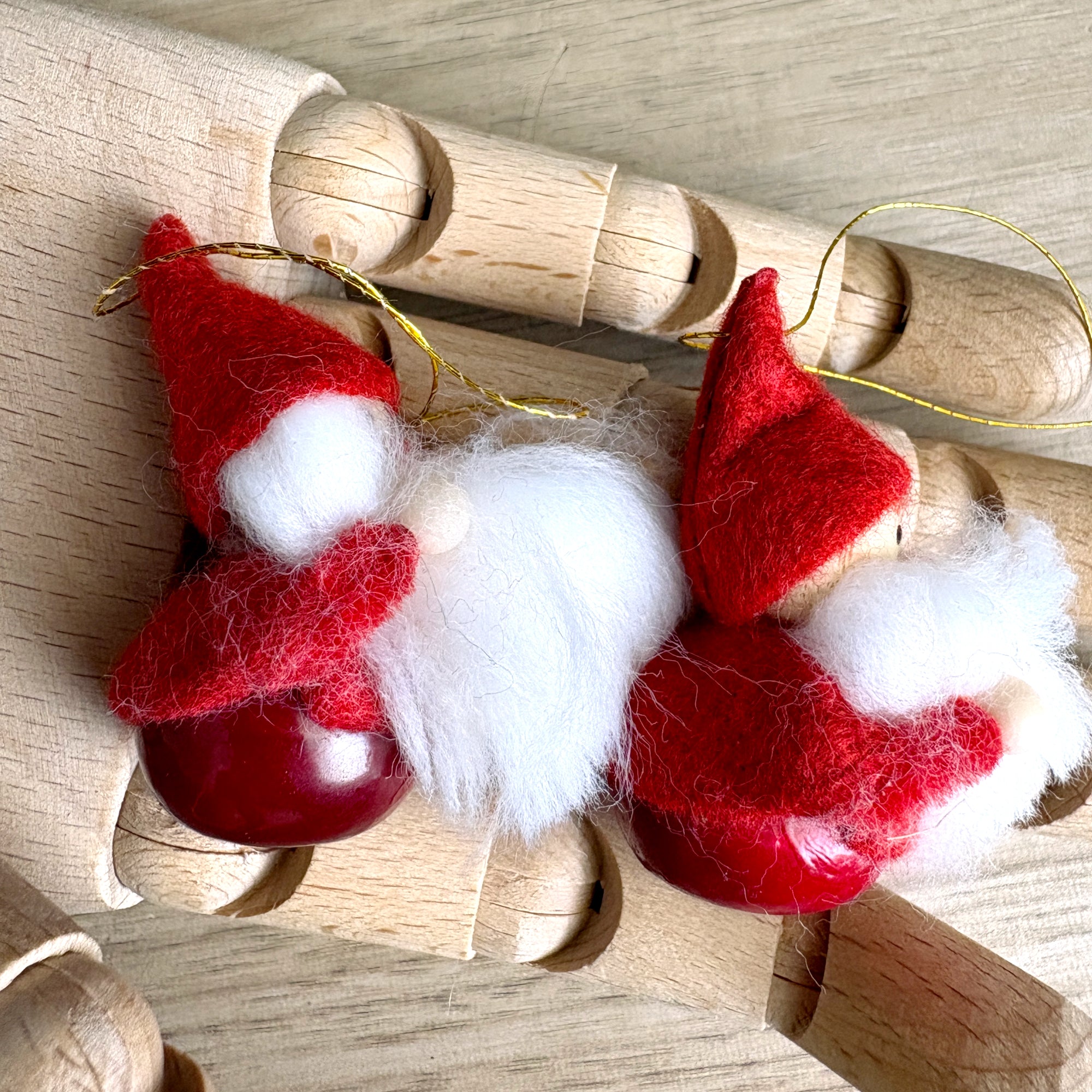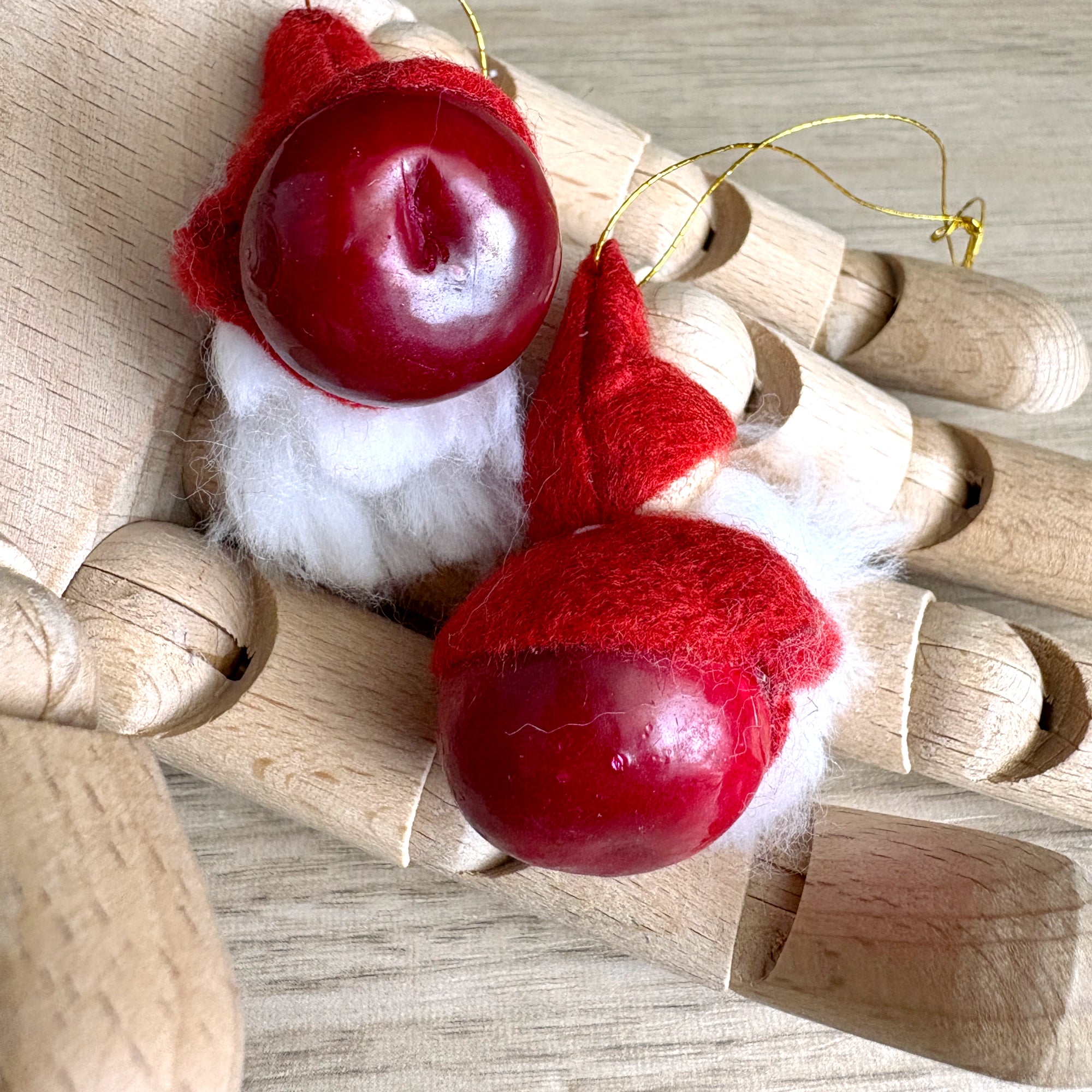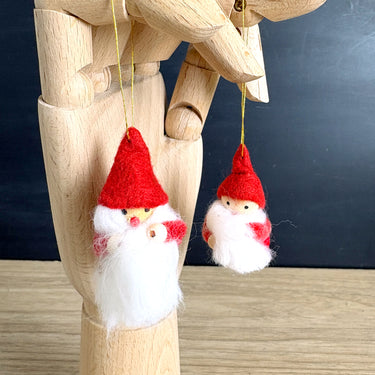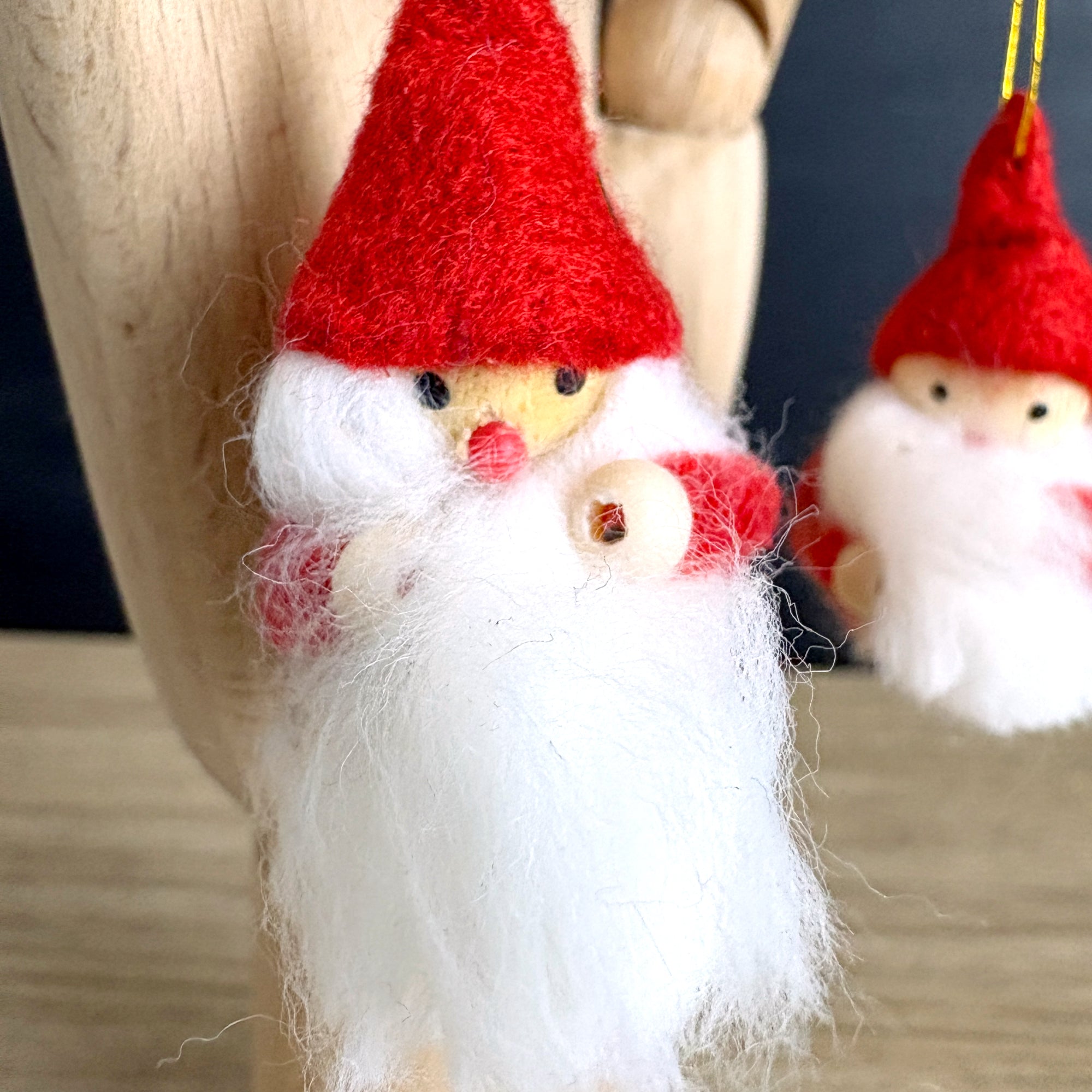A merry little pair of vintage miniature Santa ornaments Each Santa has a red dipped styrofoam body, a wooden head with a red plastic nose, hand-painted black eyes, and a soft white cotton beard. Adorned with red felt suits and hats, and cream-colored plastic bead hands. Each ornament is finished with a thin gold hanging cord—ready for display on your tree, wreath or garland.