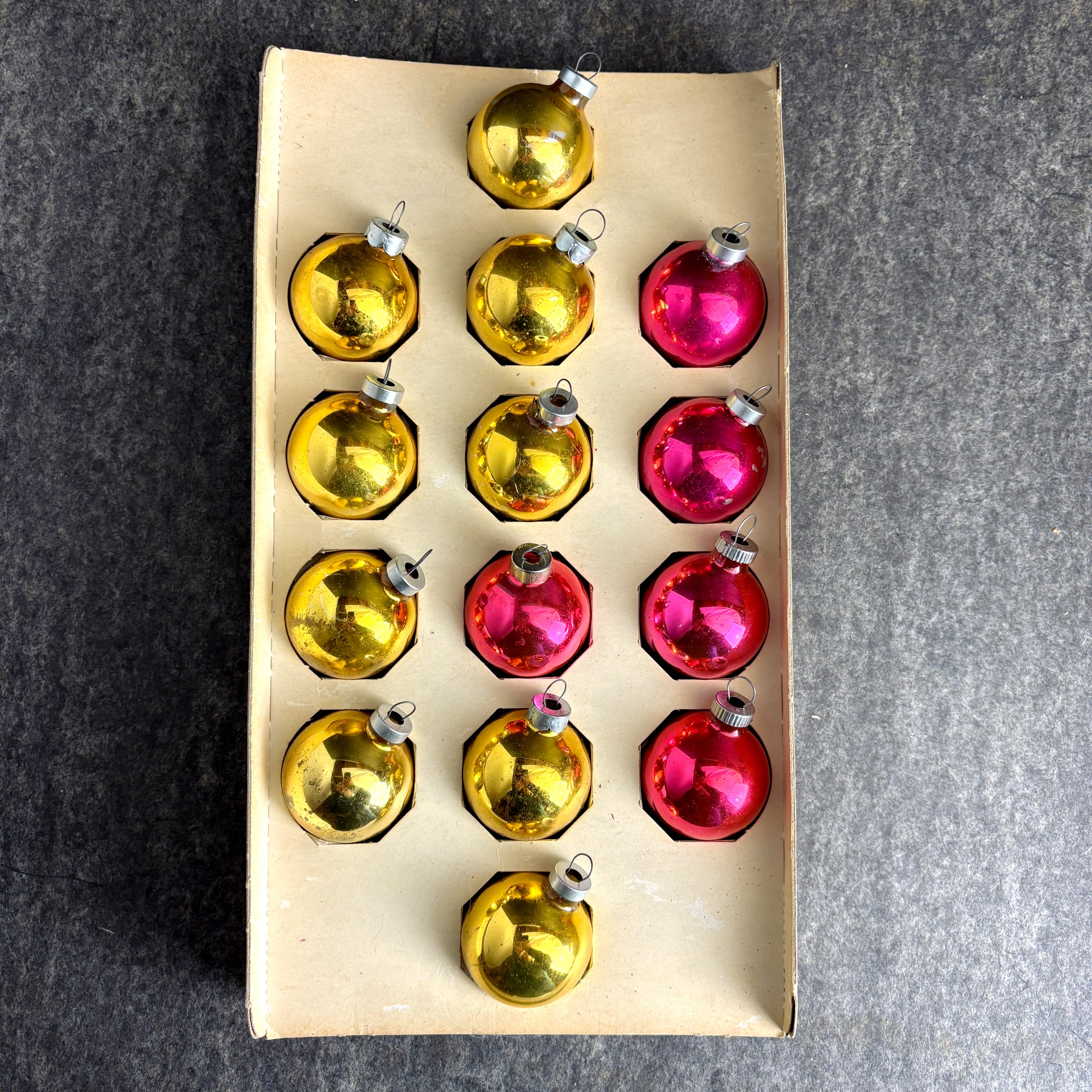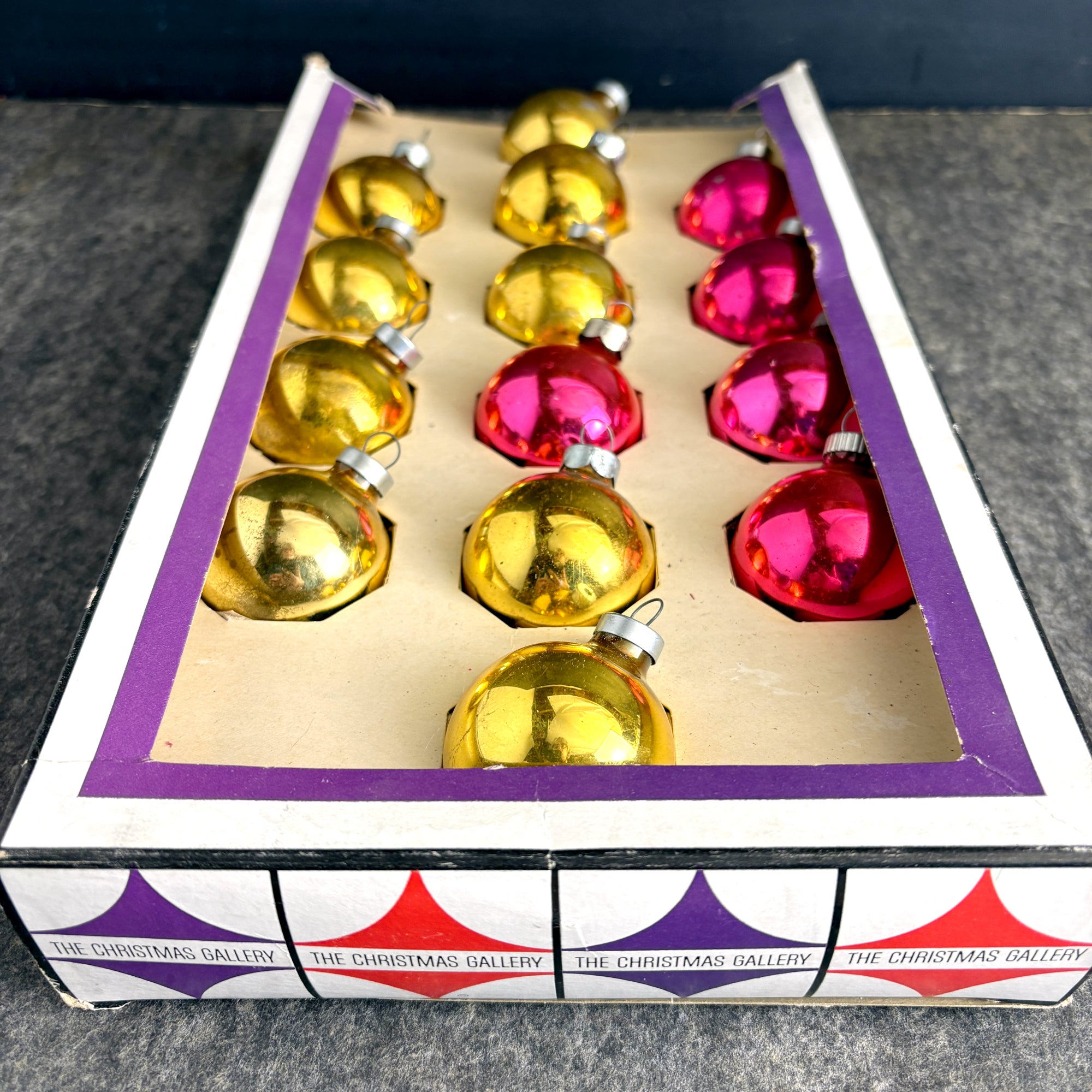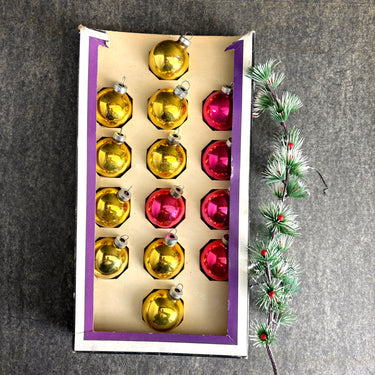 1960s vintage 14 mixed gold and pink glass Christmas ornaments by The Christmas Gallery in 9/10s of the original box. 5 pink and 9 gold. Plenty of shabby character from age. Blends in perfectly on your vintage lover's tree.