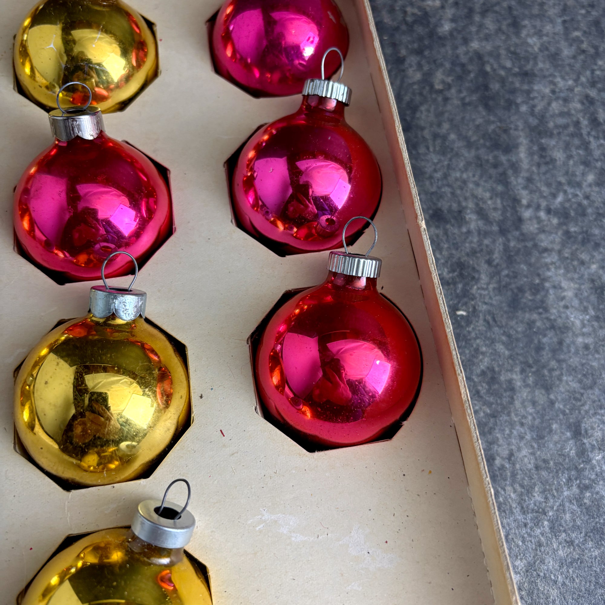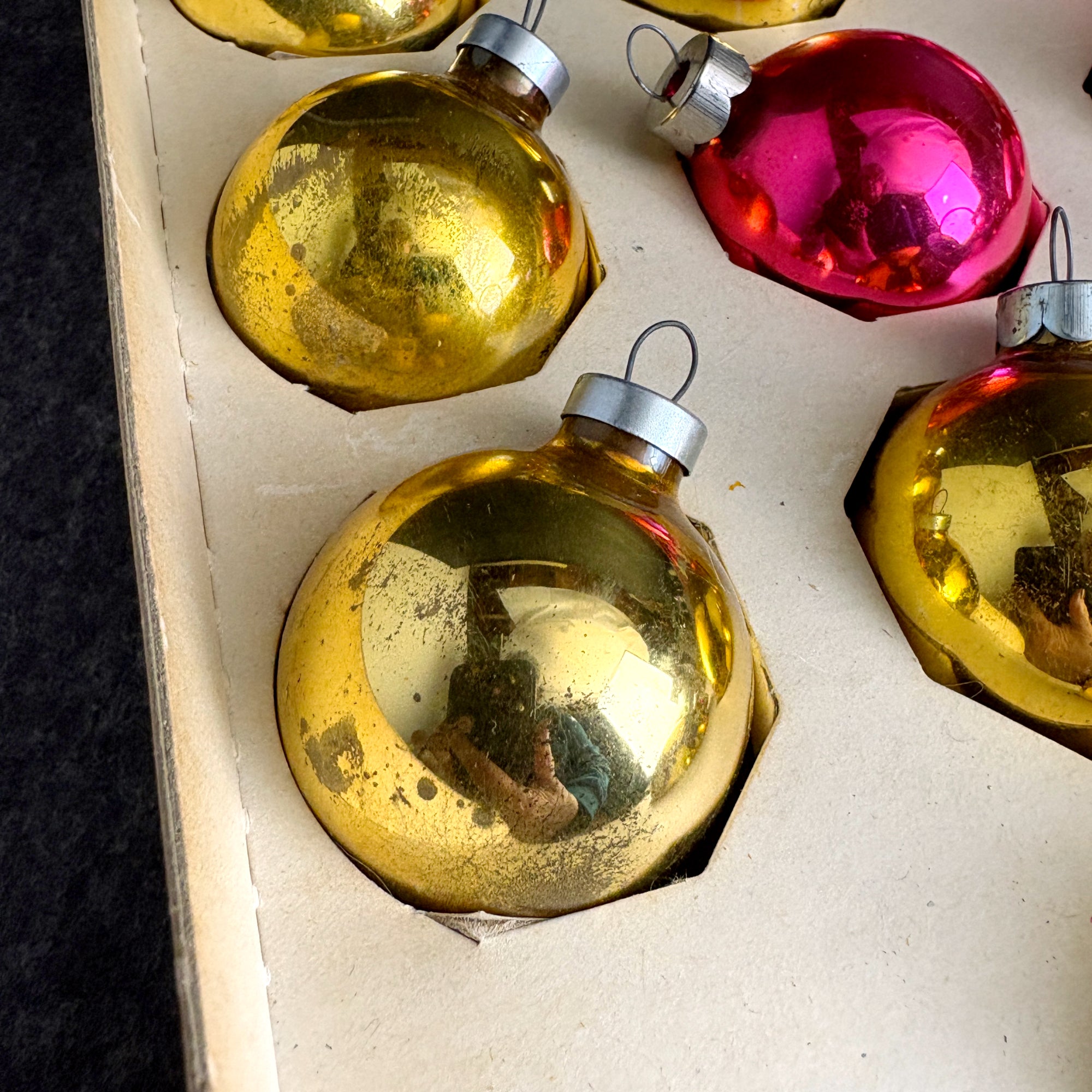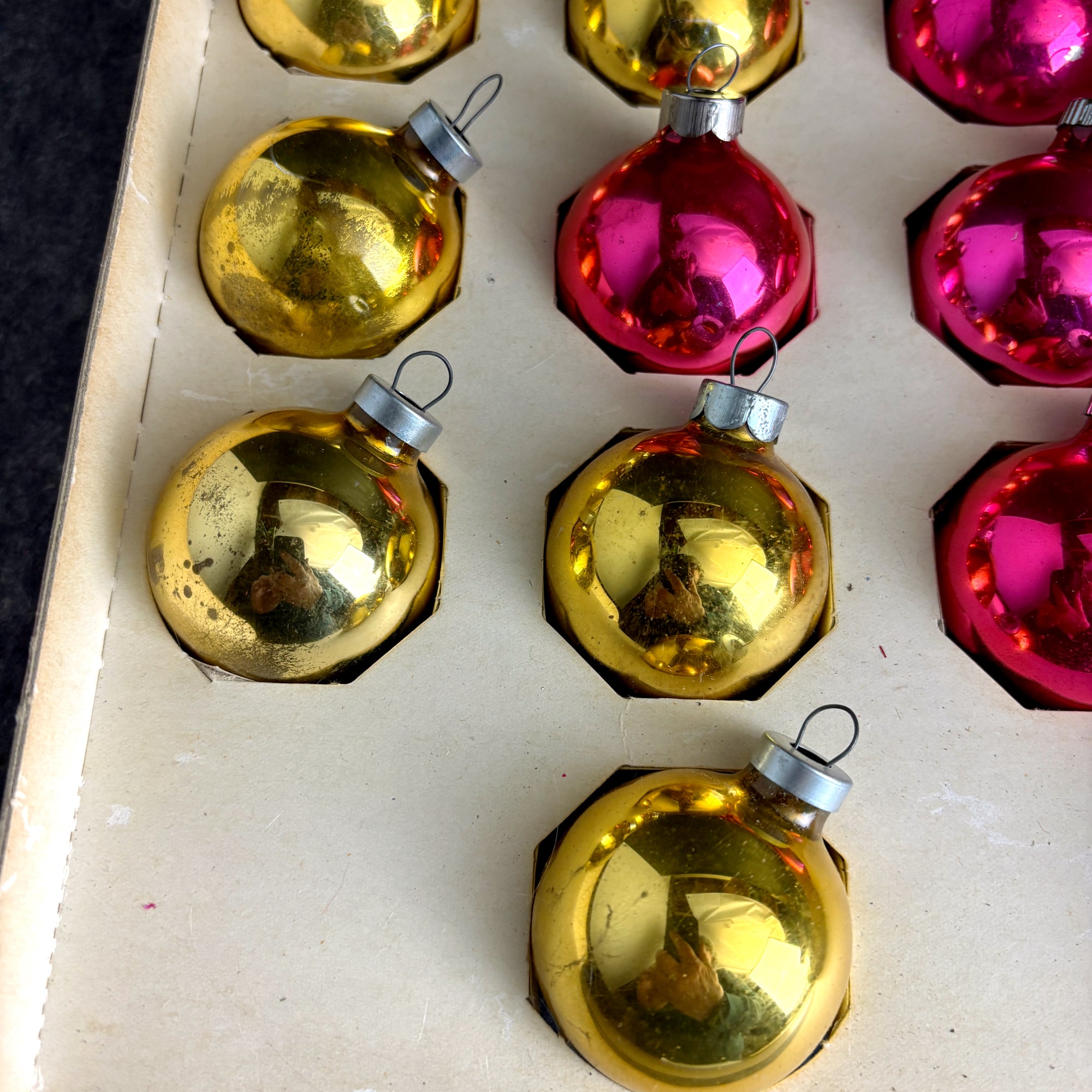 CONDITION Patinaed up and shabby. Some color loss and marks on the outside, some silvering loss inside. One of the pink ornaments is a slightly different color. End of box is missing, as is the cellophane.
