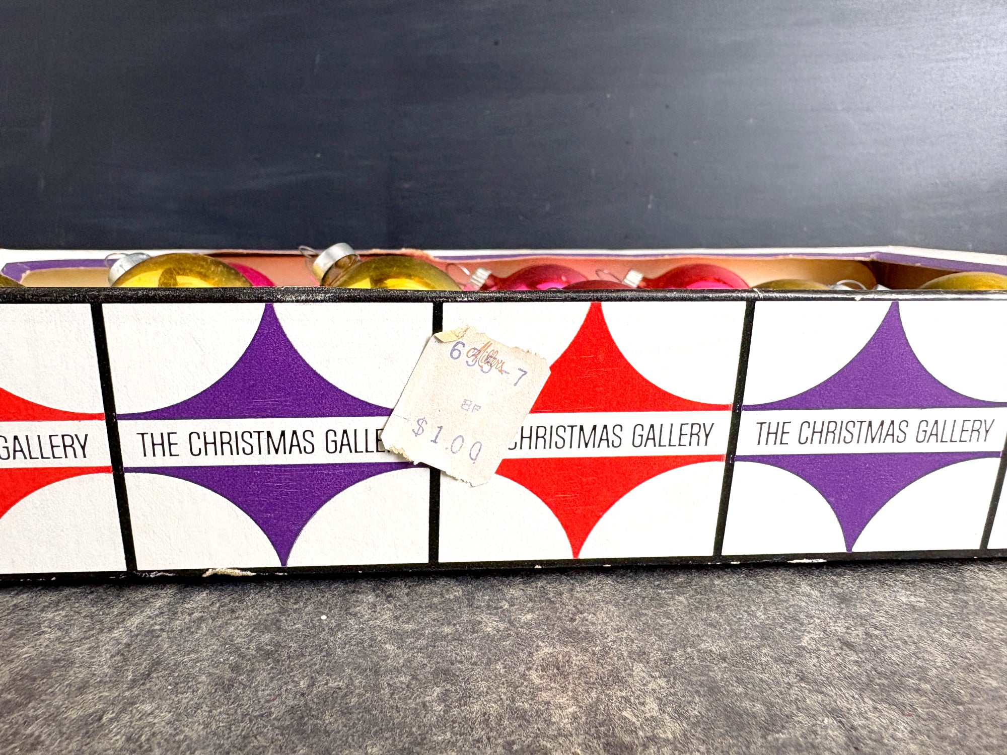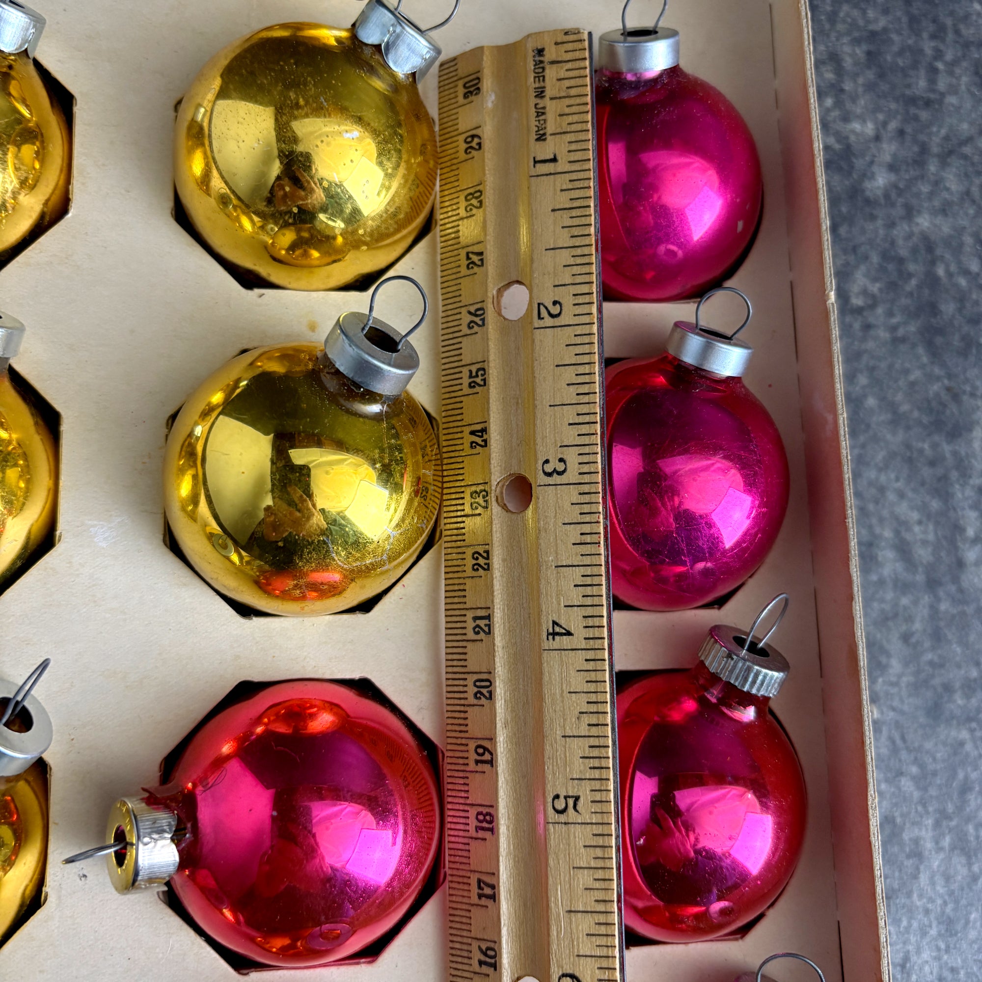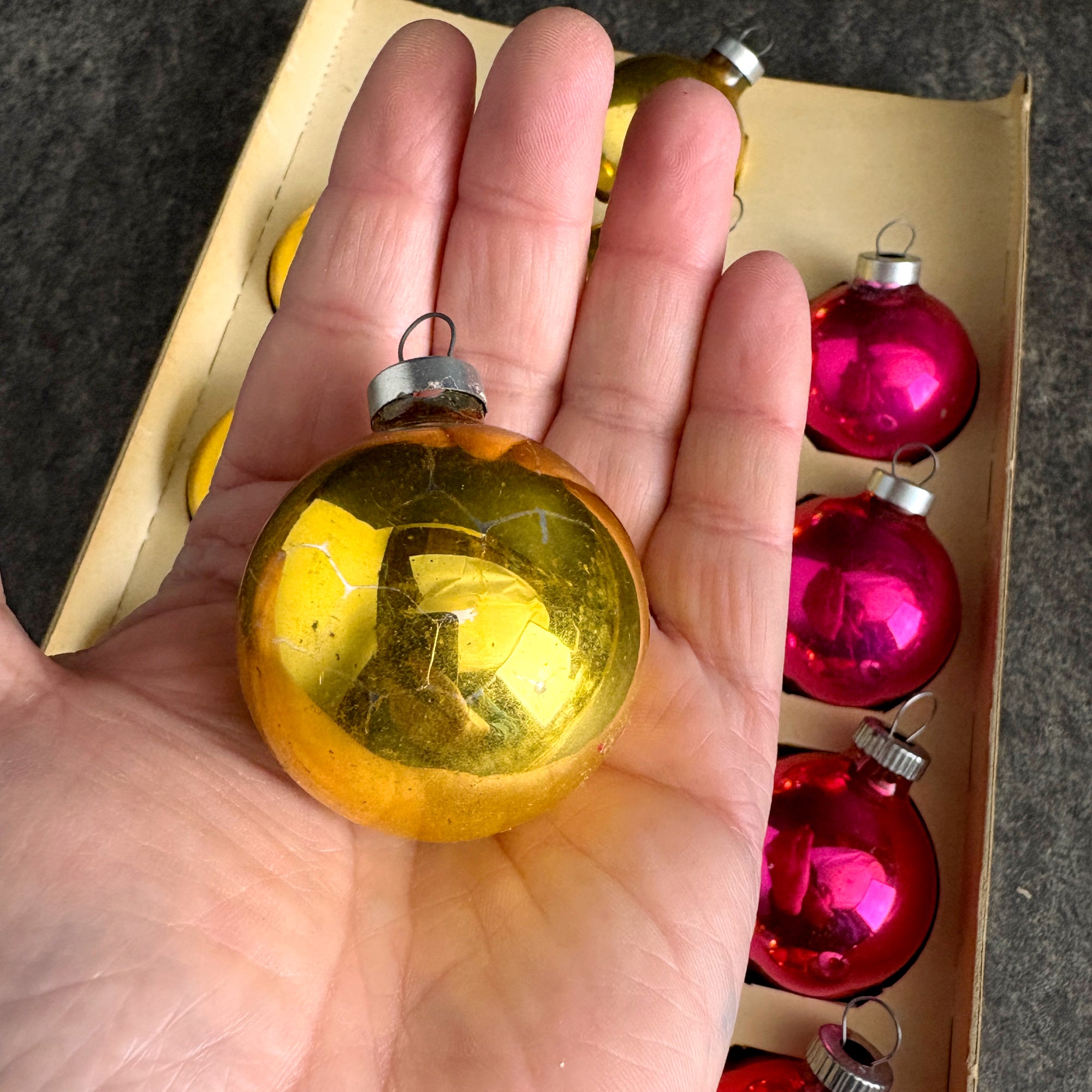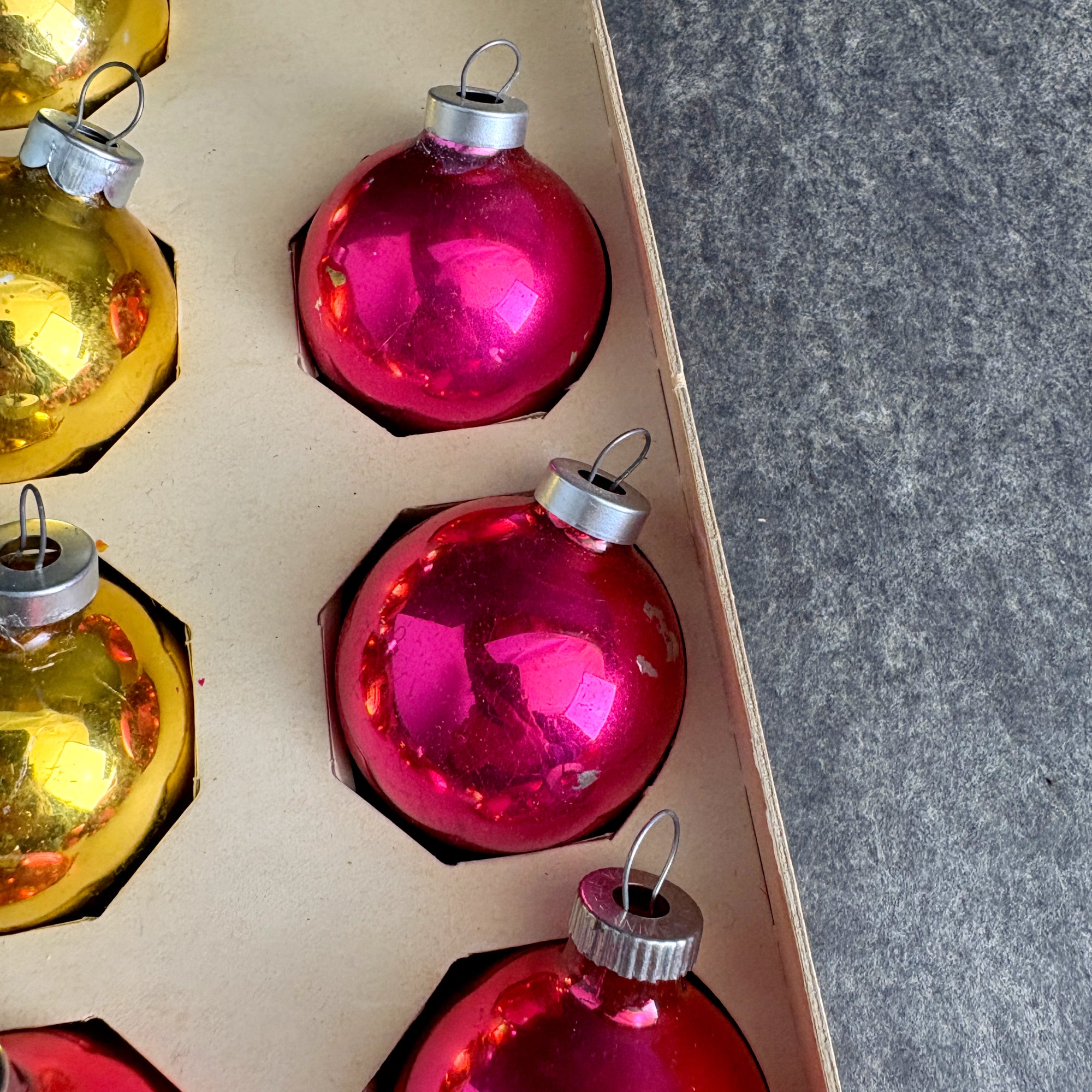 CONDITION Patinaed up and shabby. Some color loss and marks on the outside, some silvering loss inside. One of the pink ornaments is a slightly different color. End of box is missing, as is the cellophane.