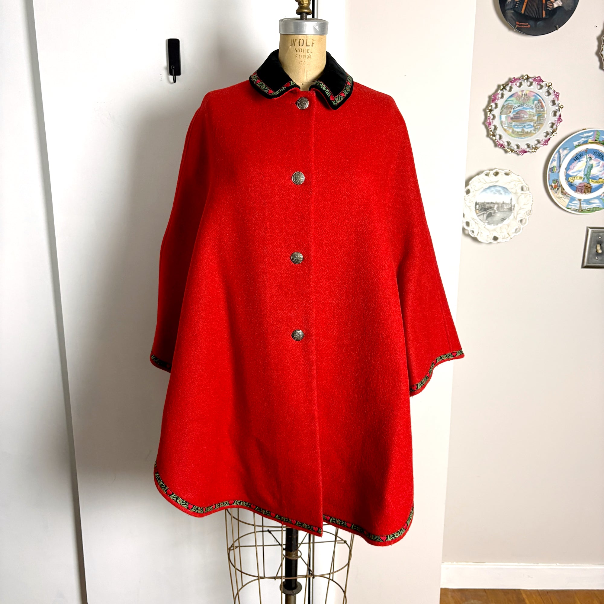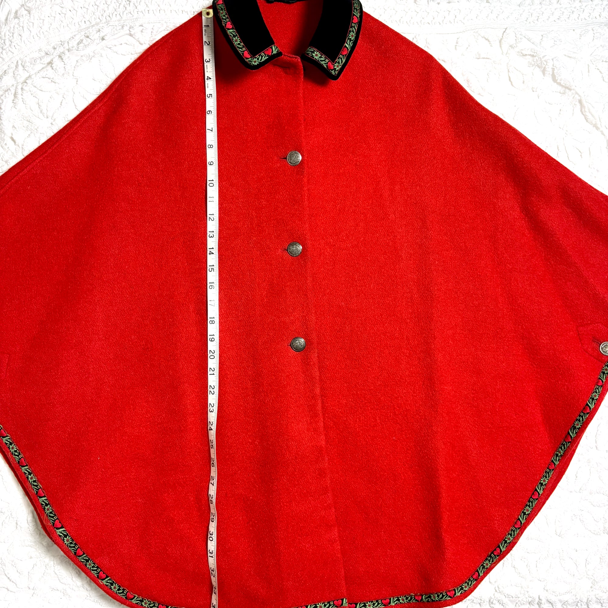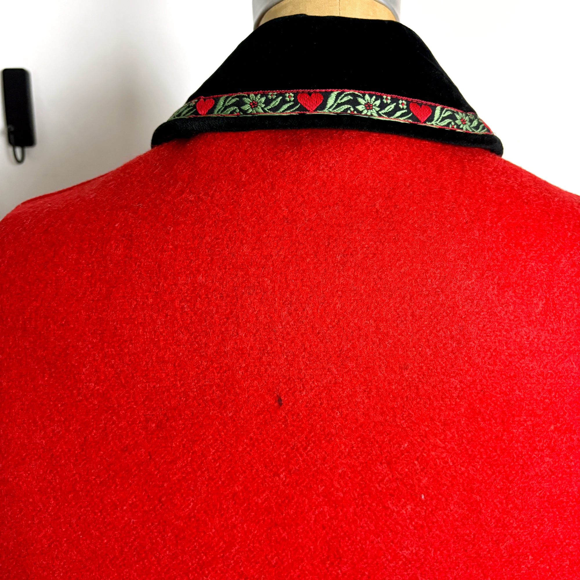 Live out your "The Sound of Music" fantasy in this red Trachten style cape. Velvet collar trimmed with jacquard heart ribbon. Four front buttons, metal, but not pewter. Buttons inside to make "sleeves."