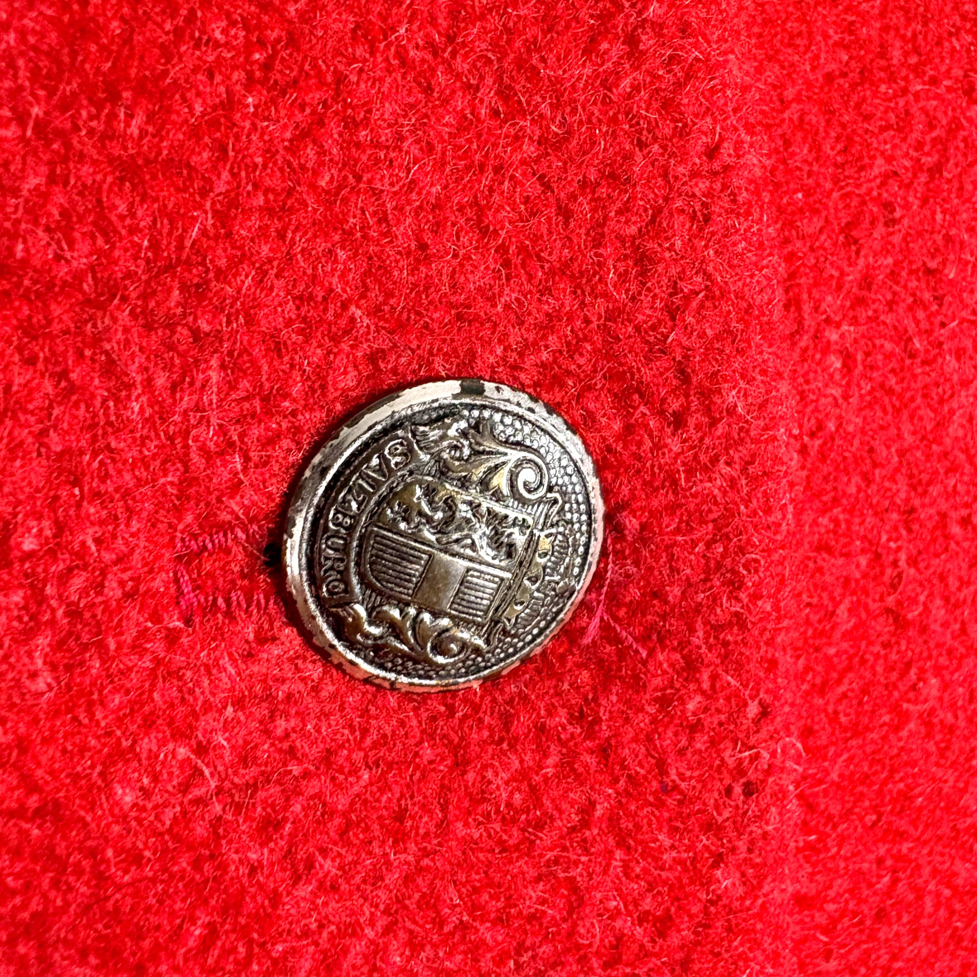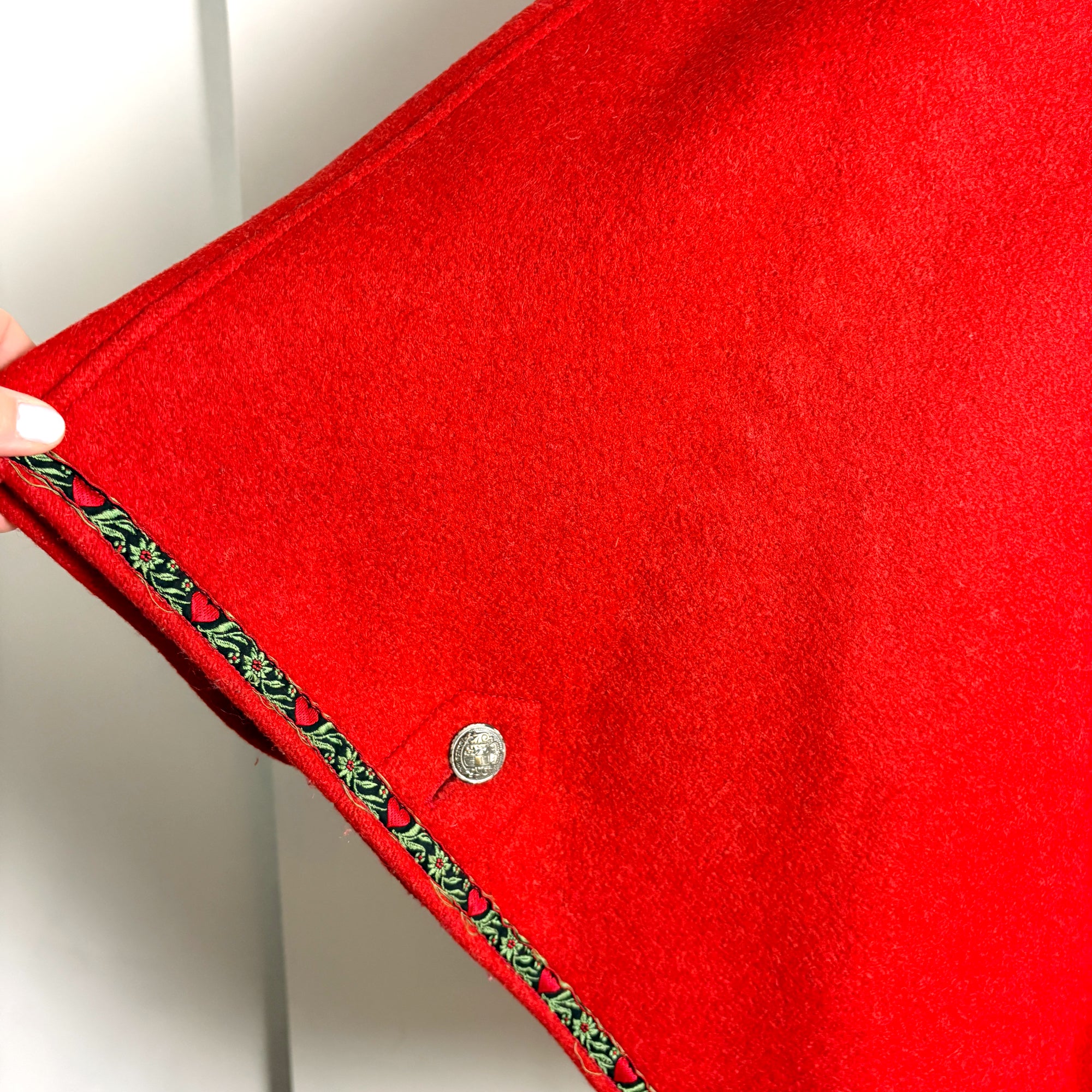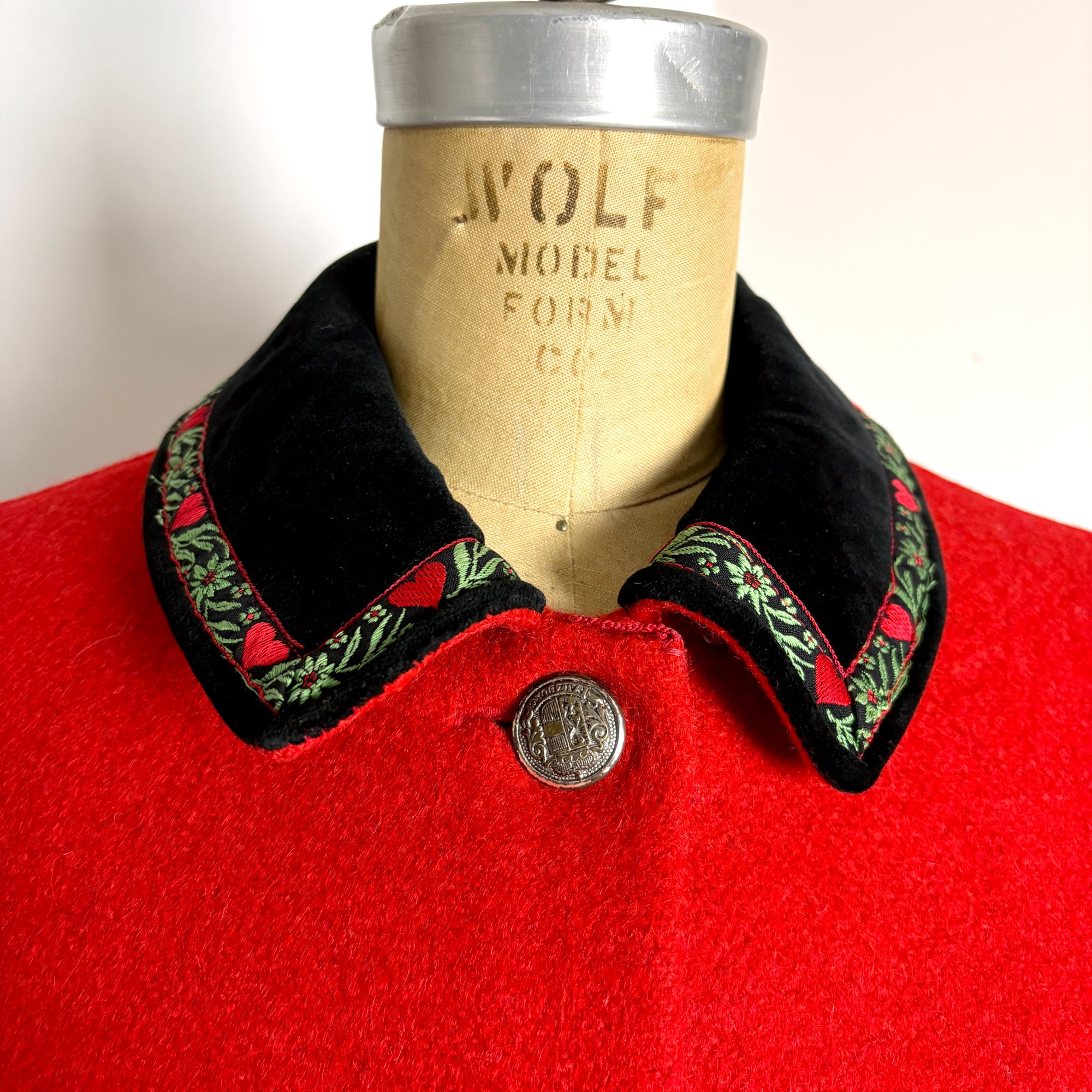 Live out your "The Sound of Music" fantasy in this red Trachten style cape. Velvet collar trimmed with jacquard heart ribbon. Four front buttons, metal, but not pewter. Buttons inside to make "sleeves."