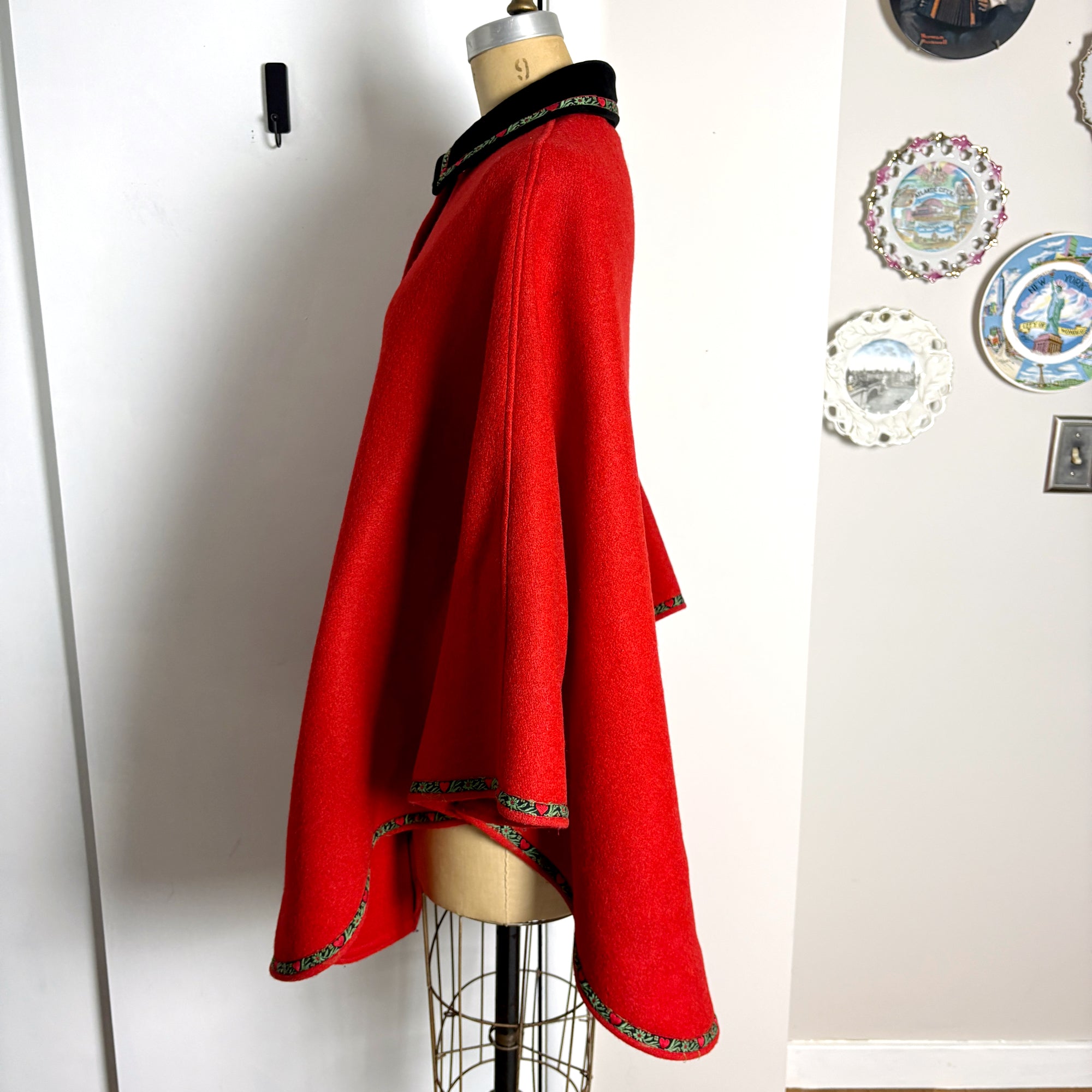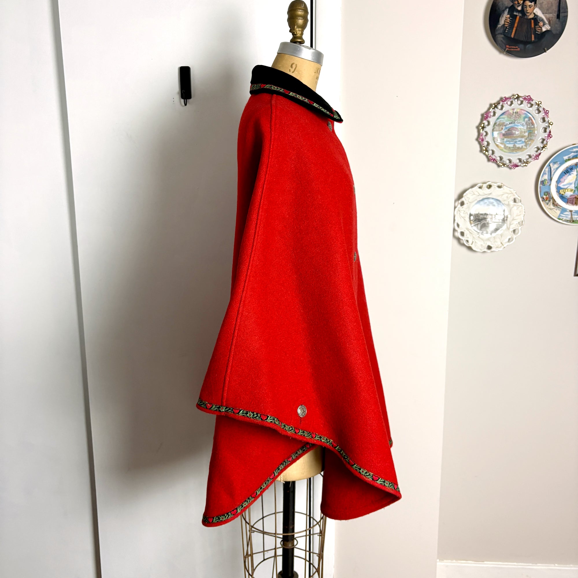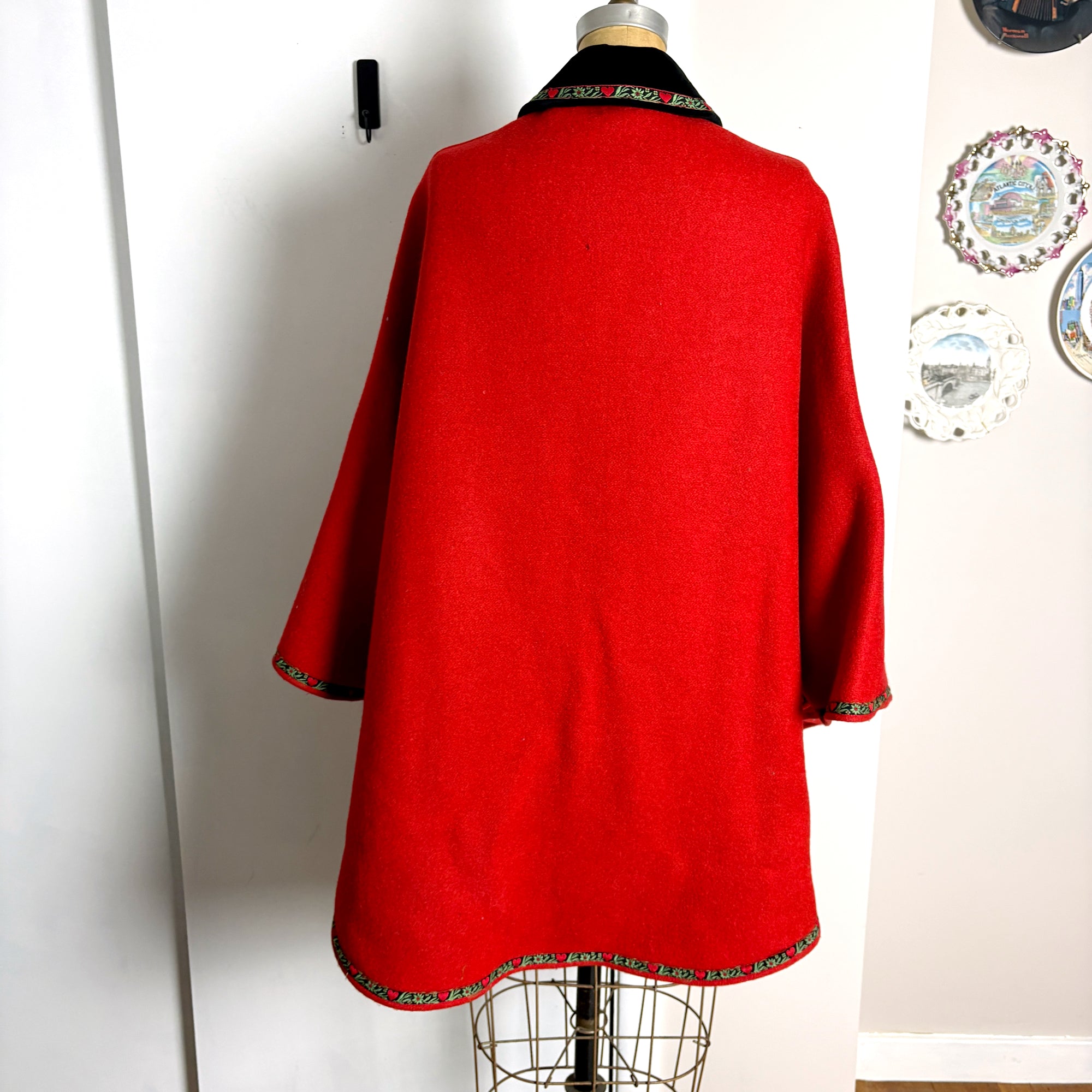 Austrian boiled wool red cape - velvet collar - ribbon trim - size S-L
