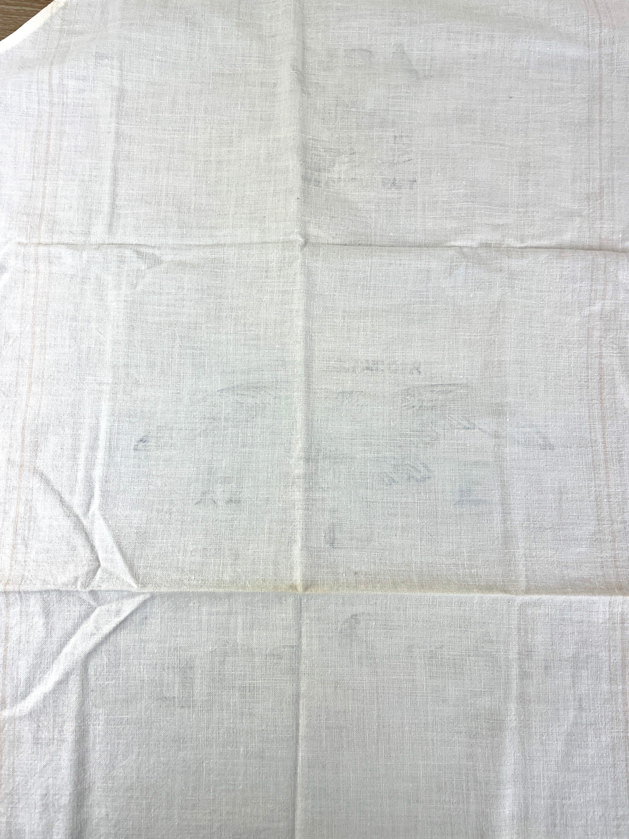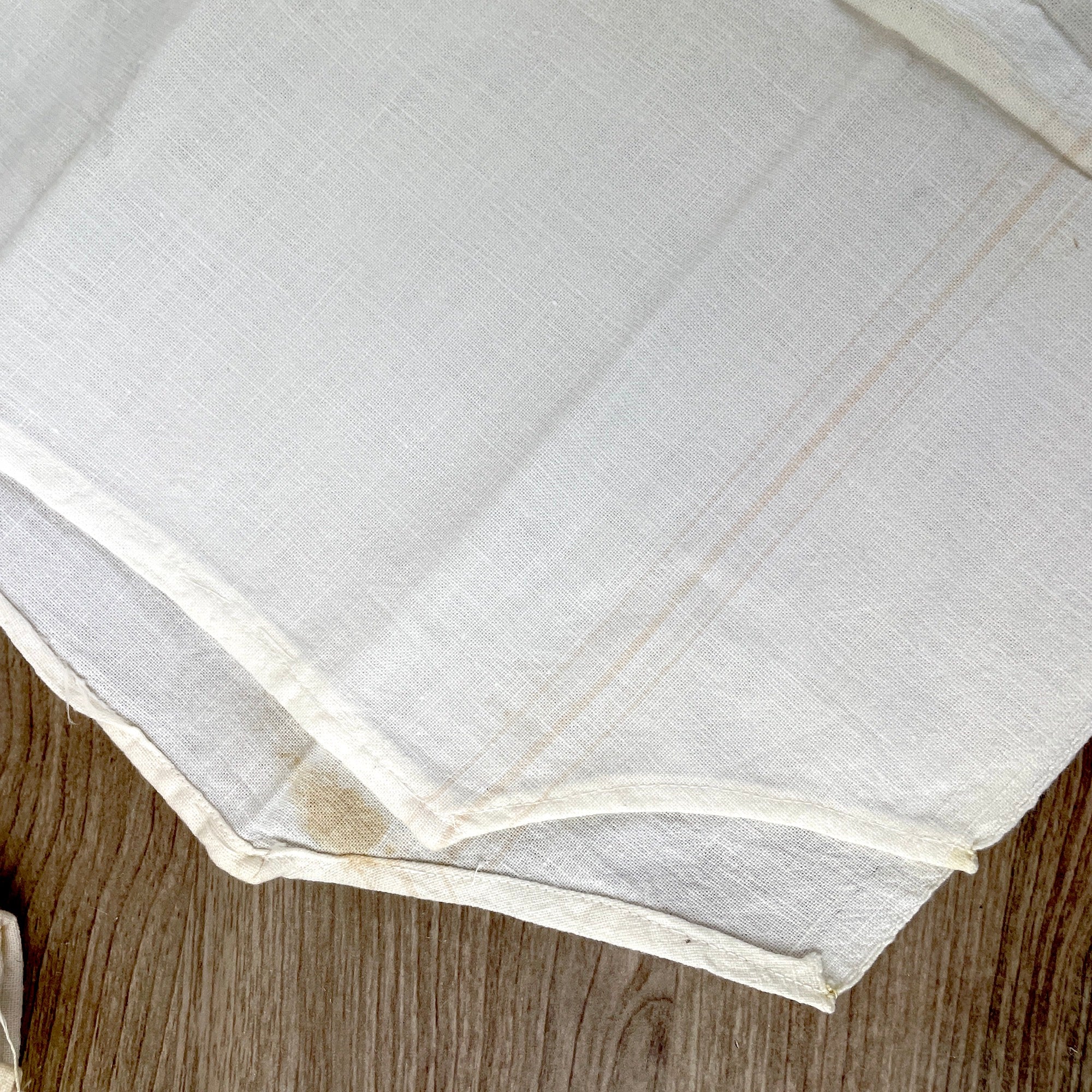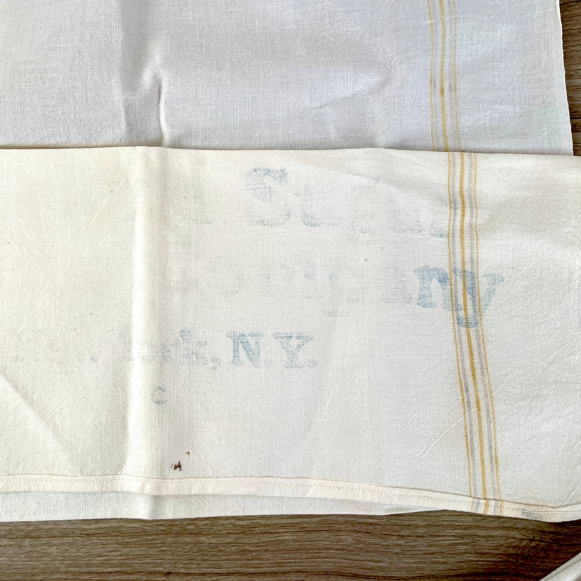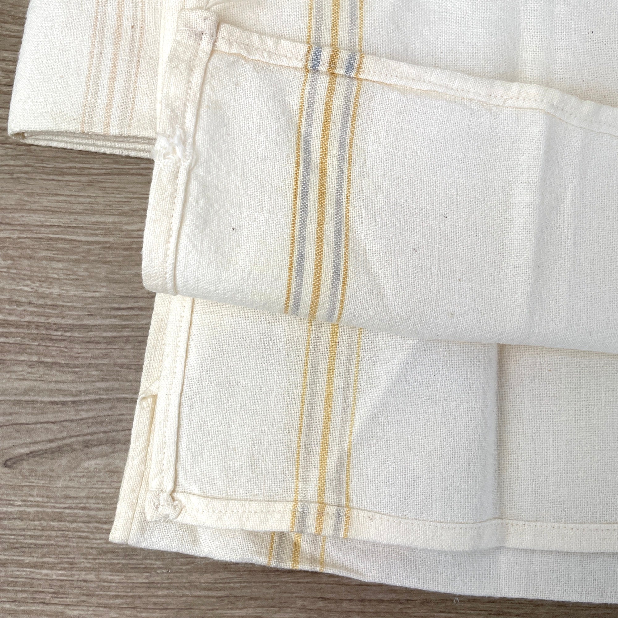 CONDITION Very good. The gold and gray/blue stripes have faded from laundering on one of them. A couple have visible mends. Exactly as found, expect stains and wear. It's possible the stains would soak out, but we make no promises.