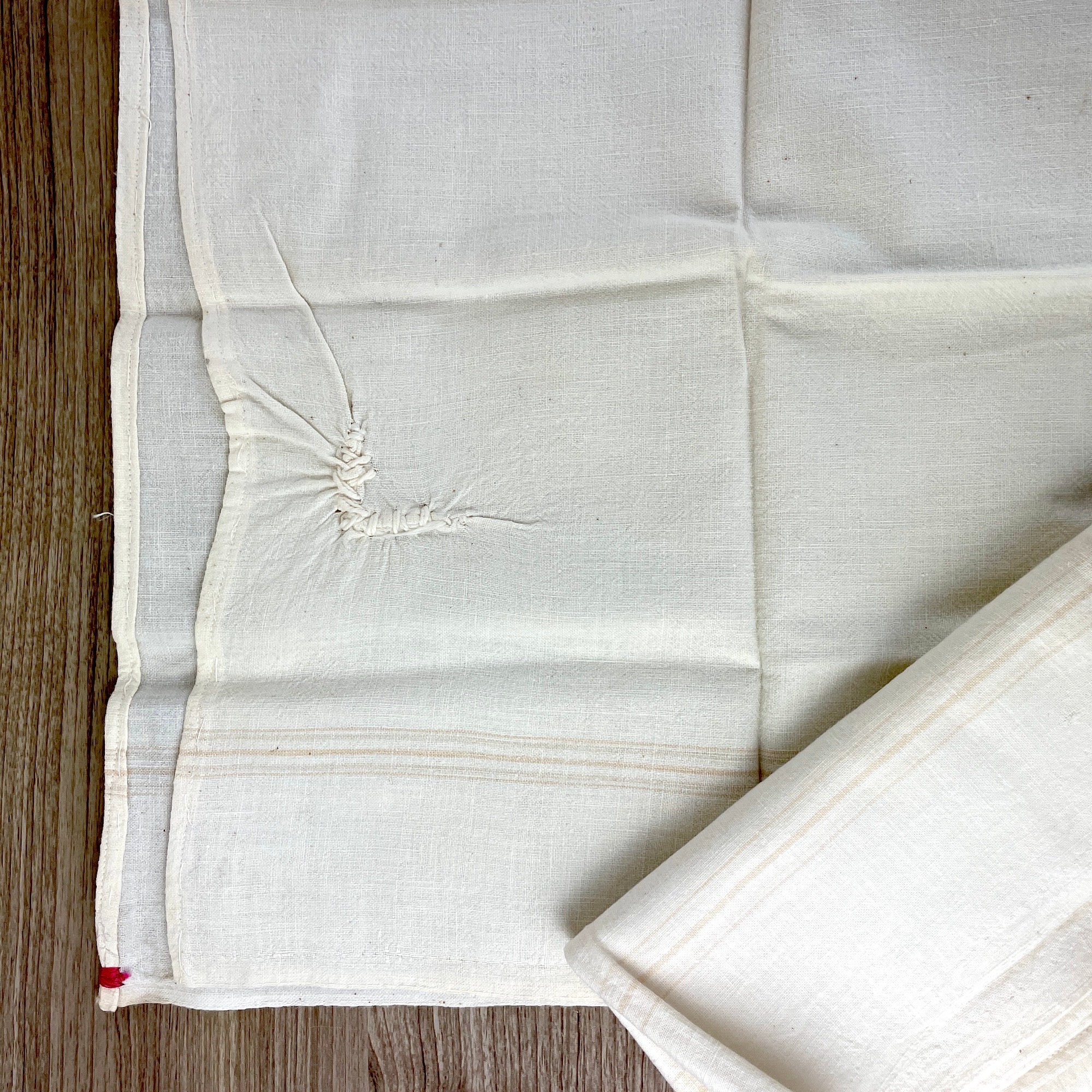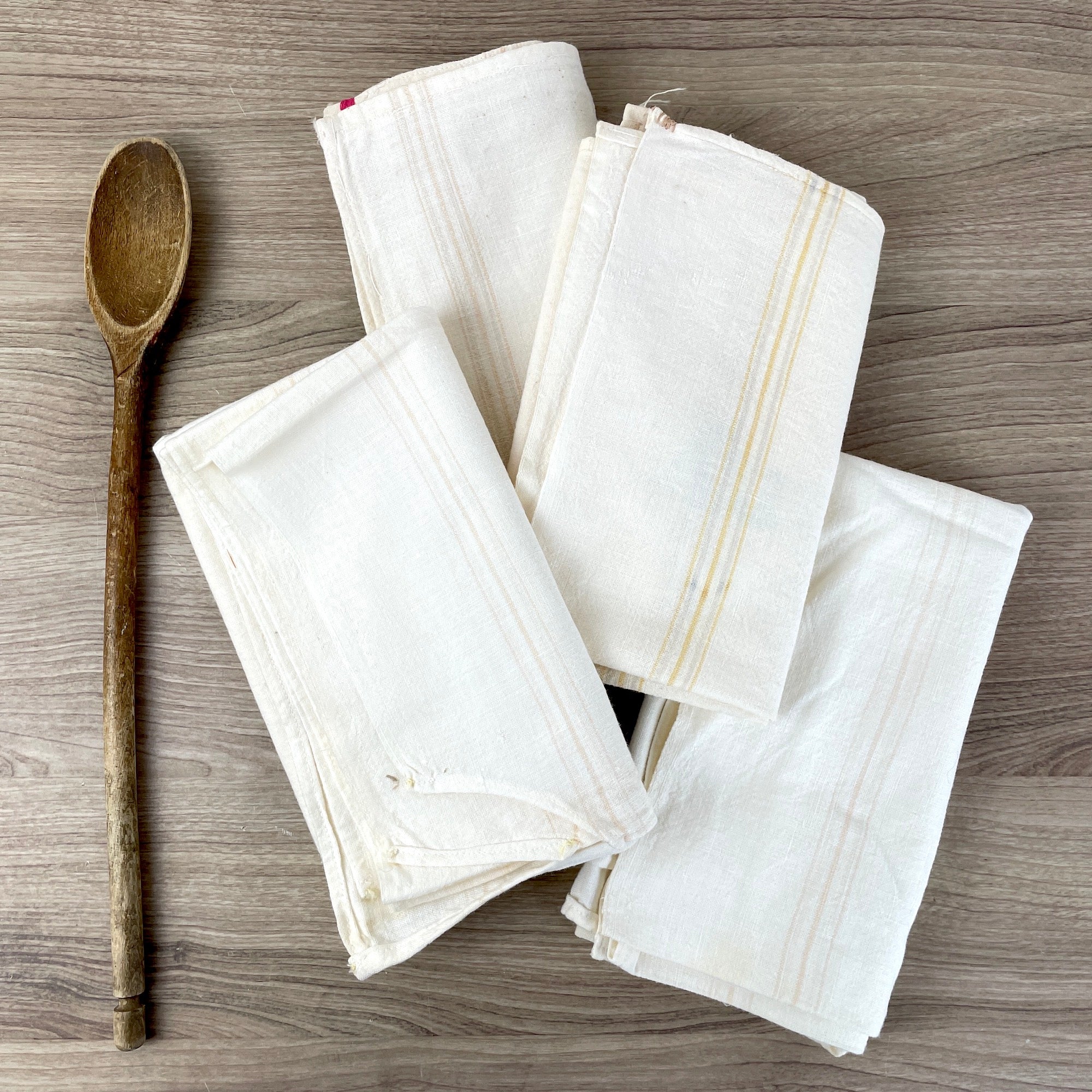 Set of 4 home sewn dish towels made from sugar sacks back in the 1940s. Some have faint images of the original printed sugar label. These were found in the linen drawer of the triple decker in Worcester, MA where they were sewn and used. Exactly as found. Three do not seem to have been used much, one was.