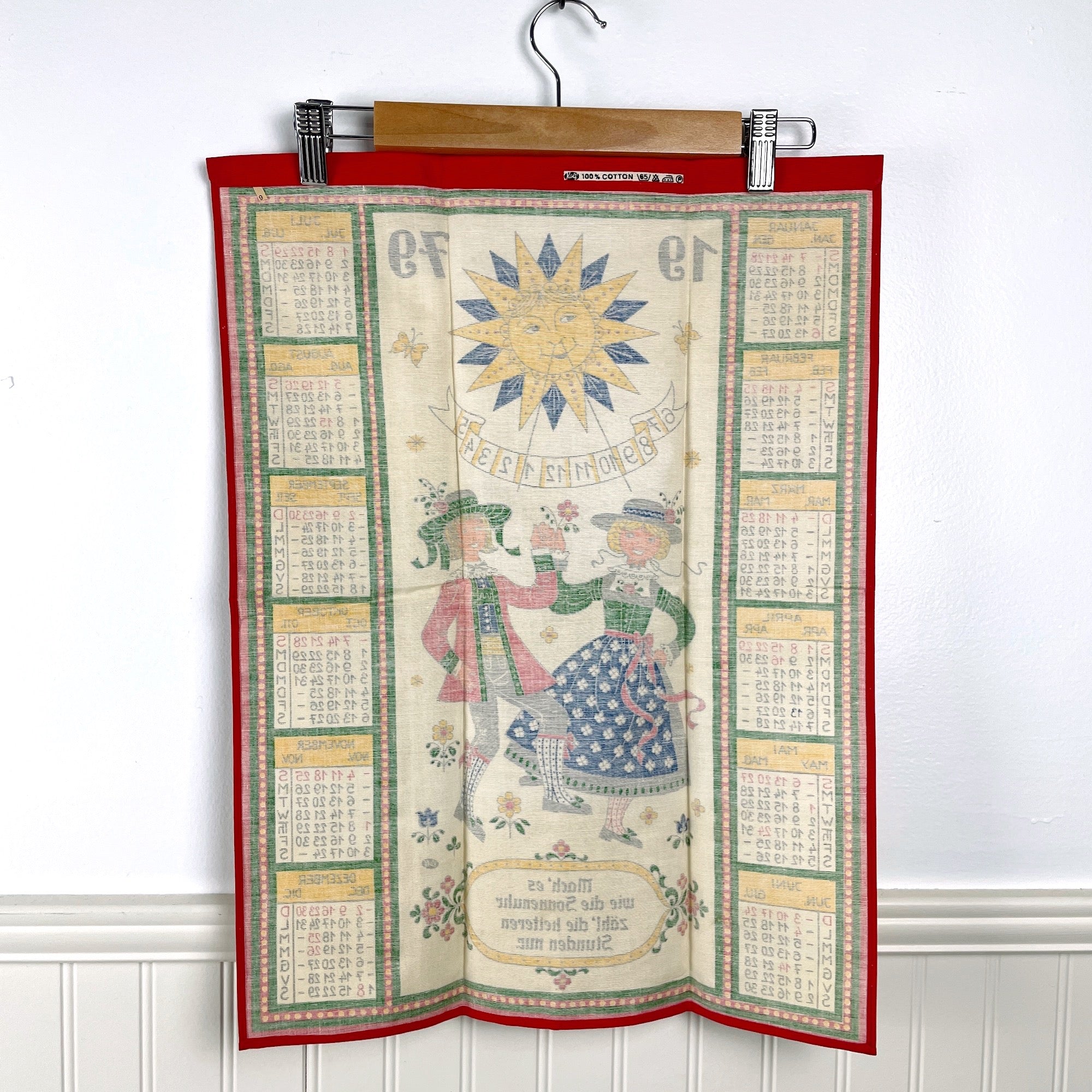 1979 tea towel with a happy sundial and dancing Bavarian couple by Kolf of Austria. Stitched sleeve at top for a hanging dowel. Likely never used, the towel is crisp with sizing like the day it was made.