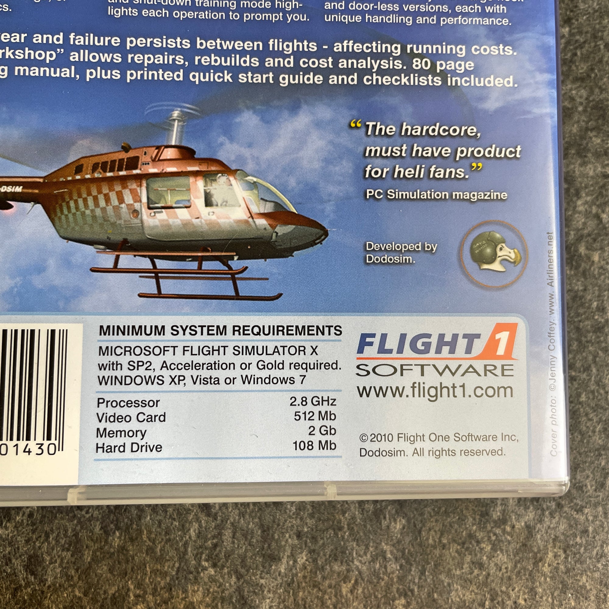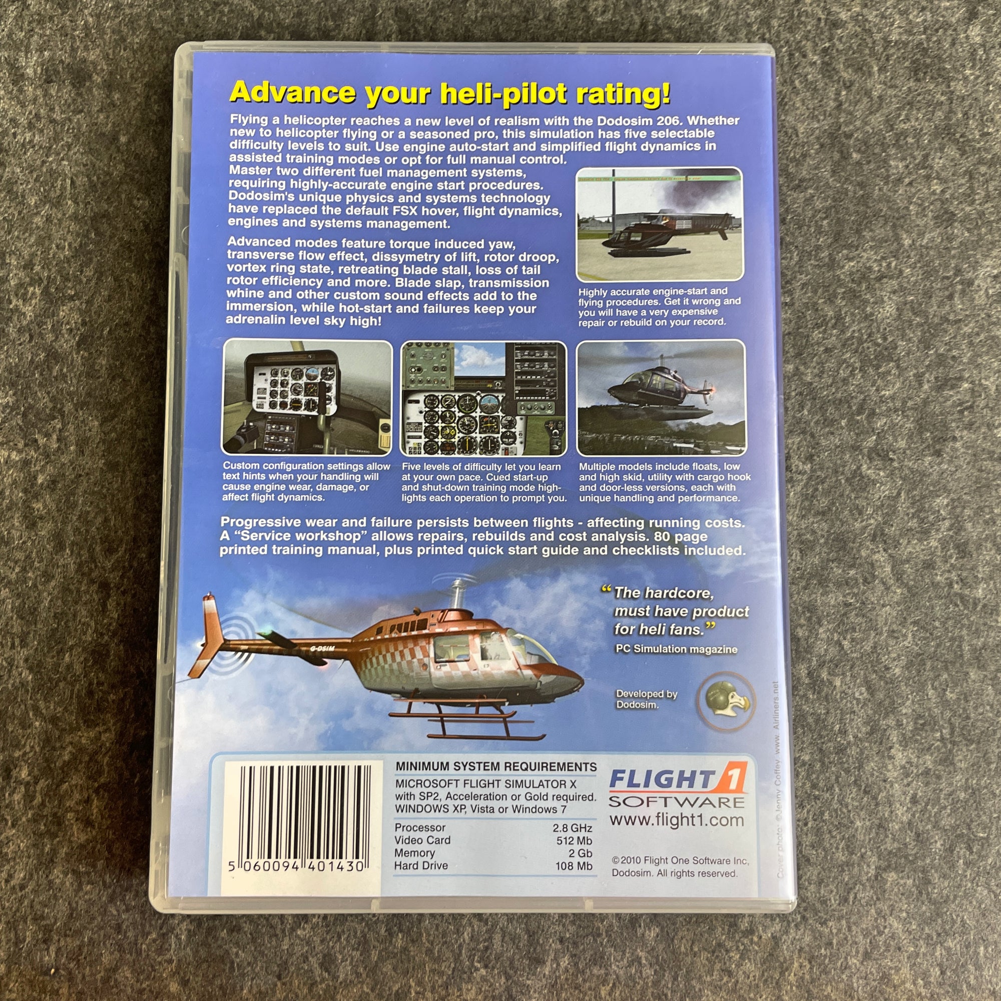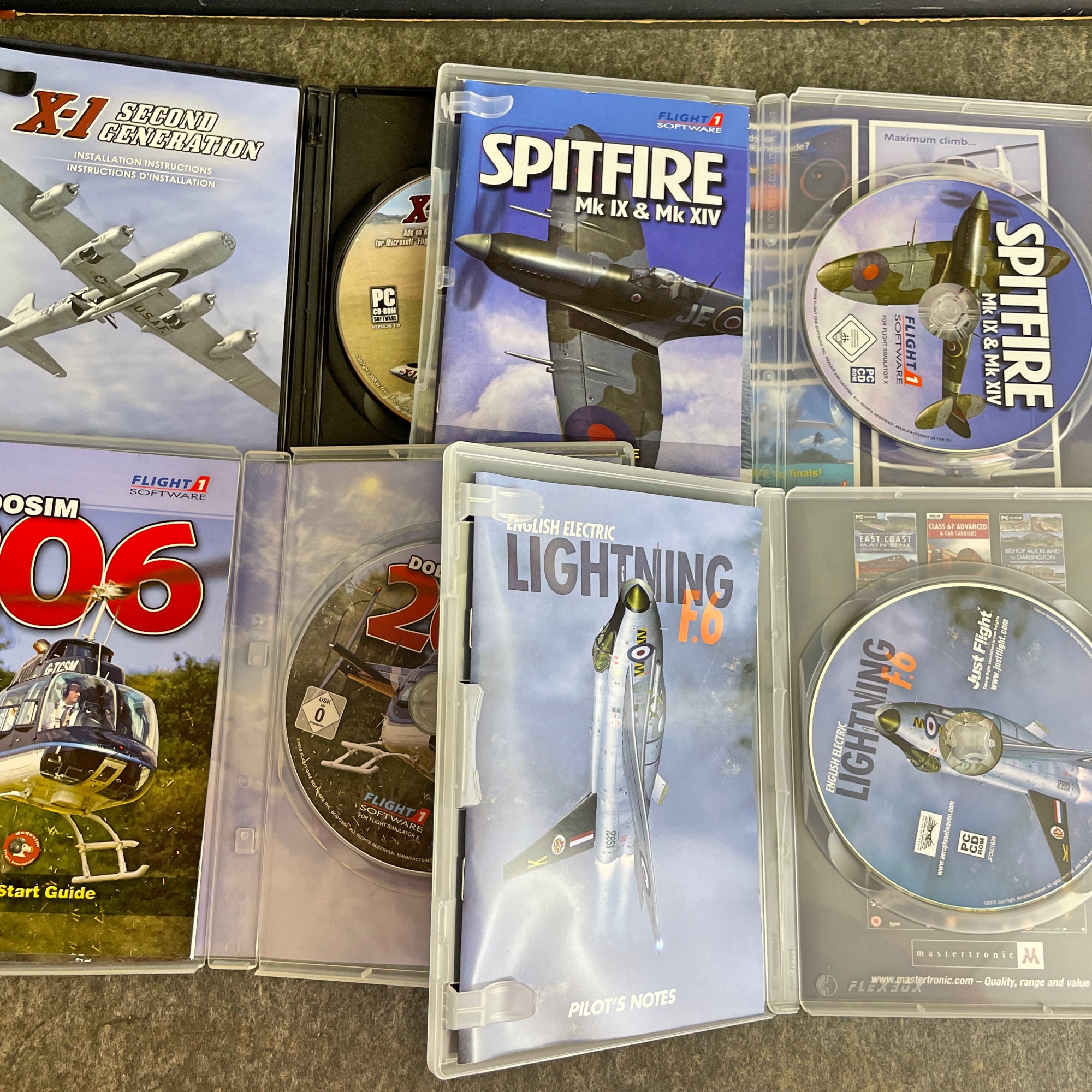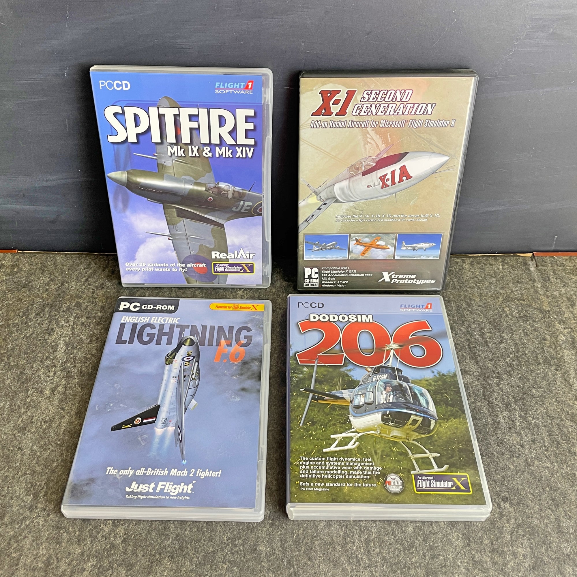 Flight 1 Software DODOSIM 206 - Advance your heli-pilot rating (2010); Flight 1 Software Spitfire Mk IX & Mk XIV - over 20 variants of the aircraft (2008); Just Flight English Electric Lighning F.G - the only all-British Mach 2 fighter! (2012); and Xtreme Prototypes X-1 Second Generation - includes the X-1A, X-1B, X-1c and X-1D (2009). All are in their original hard cases with manuals.
