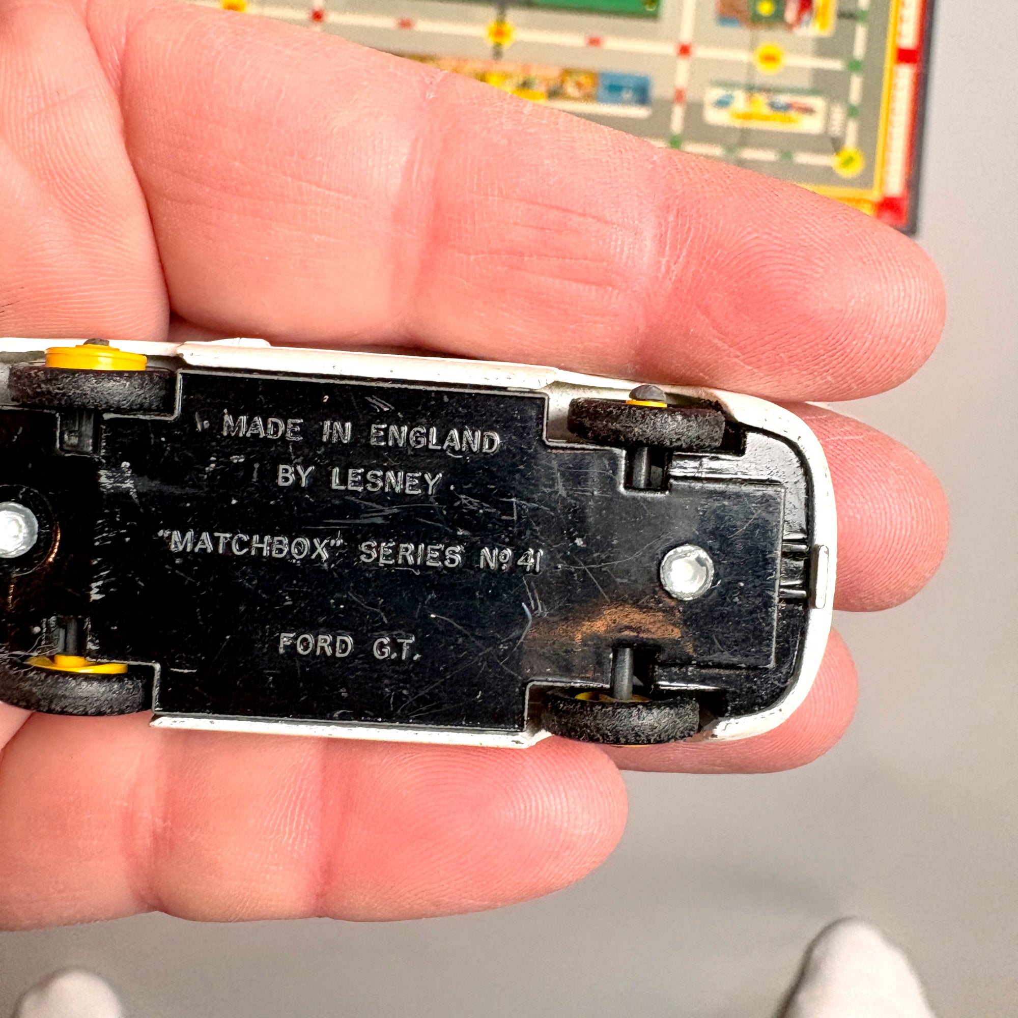 The set includes all original game pieces and instructions, with the exception of the cars. One vintage Matchbox Series #41 Ford GT, made in England by Lesney, is included. The car is white with a red interior, yellow hubs, blue and yellow hood stripes, and the number 6. While this car may or may not have originally been paired with the game, it makes a fitting addition.