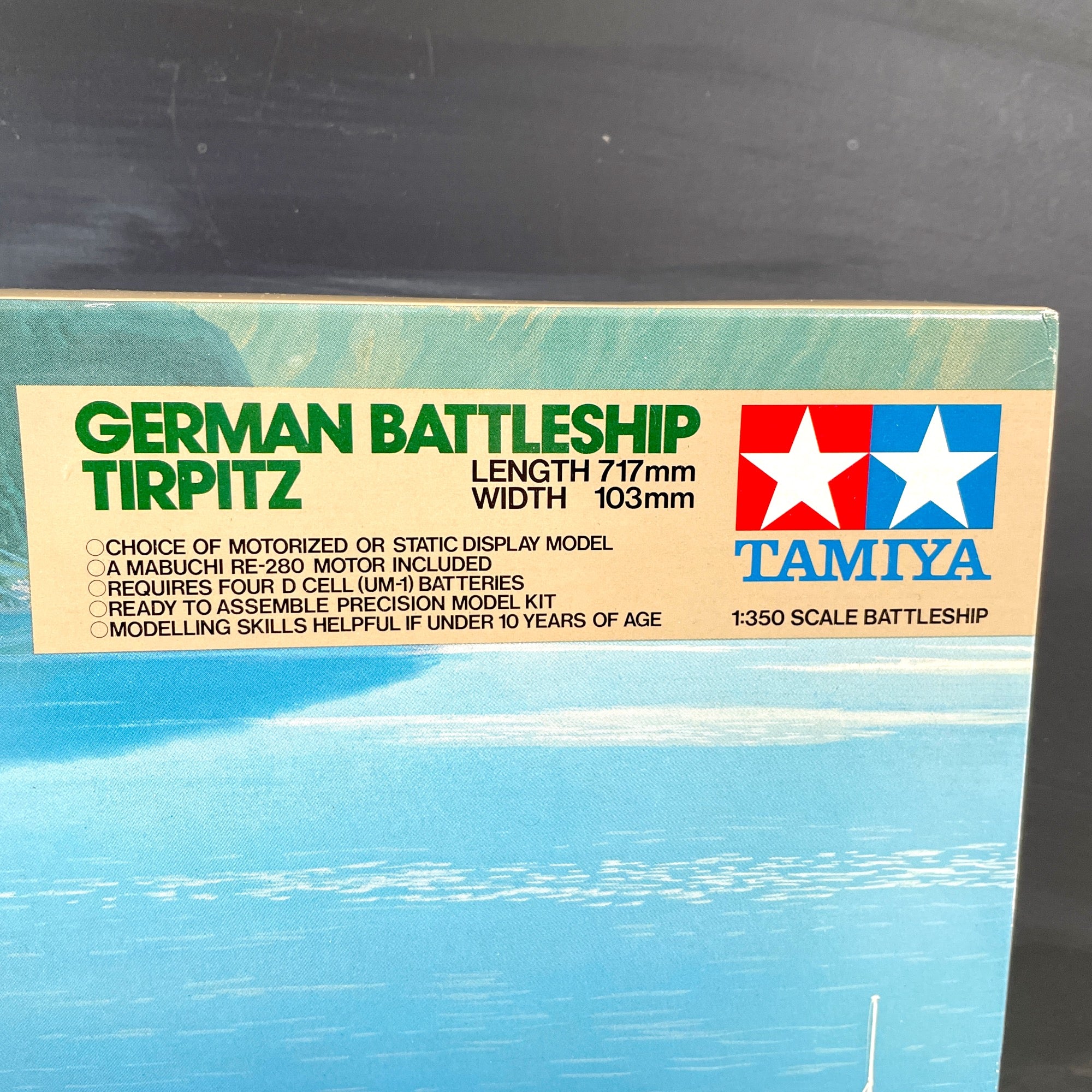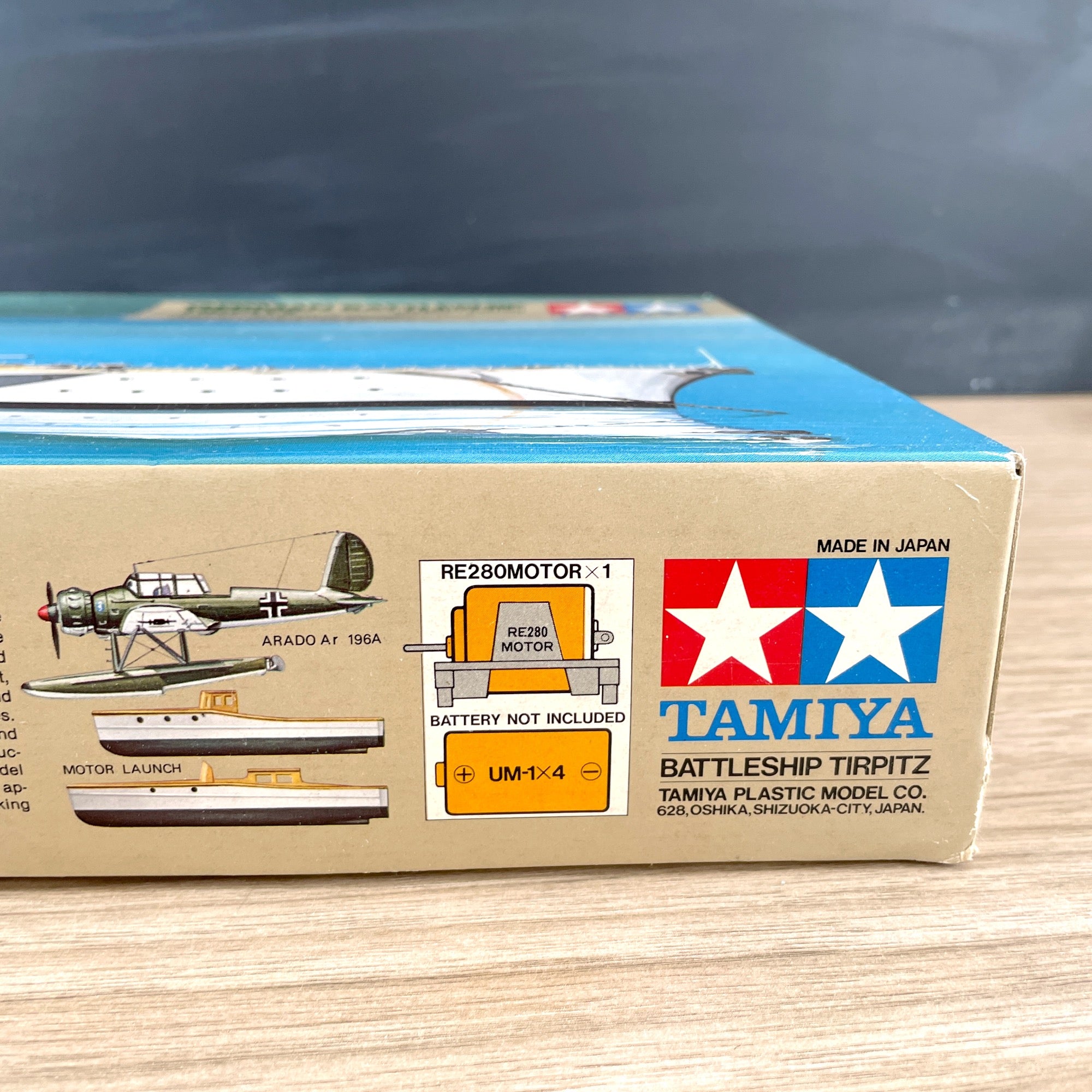 Complete vintage Tamiya German Battleship Tirpitz 1:350 scale battleship kit No. WS003. Choice of motorized or static display model. A Mabuchi RE-280 motor is included. Requires four D-cell batteries. All parts still in original packaging.