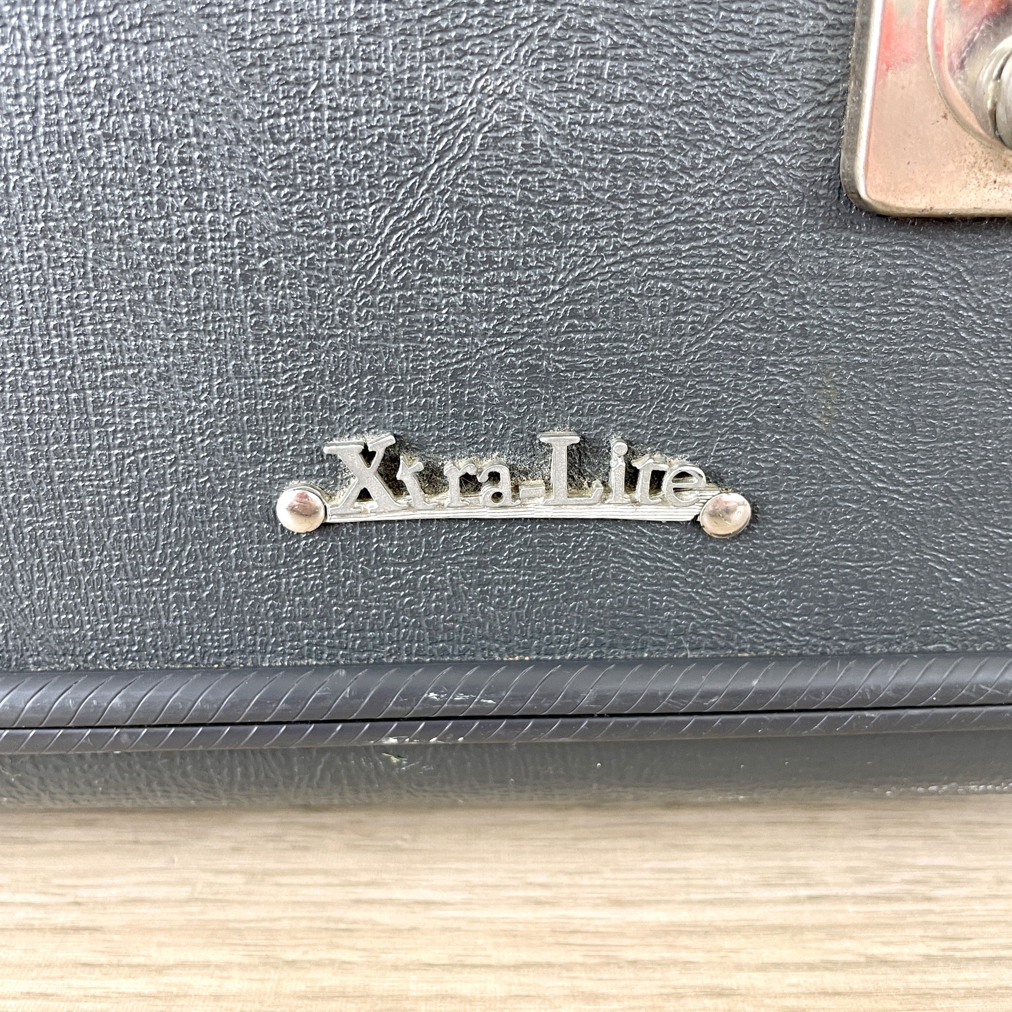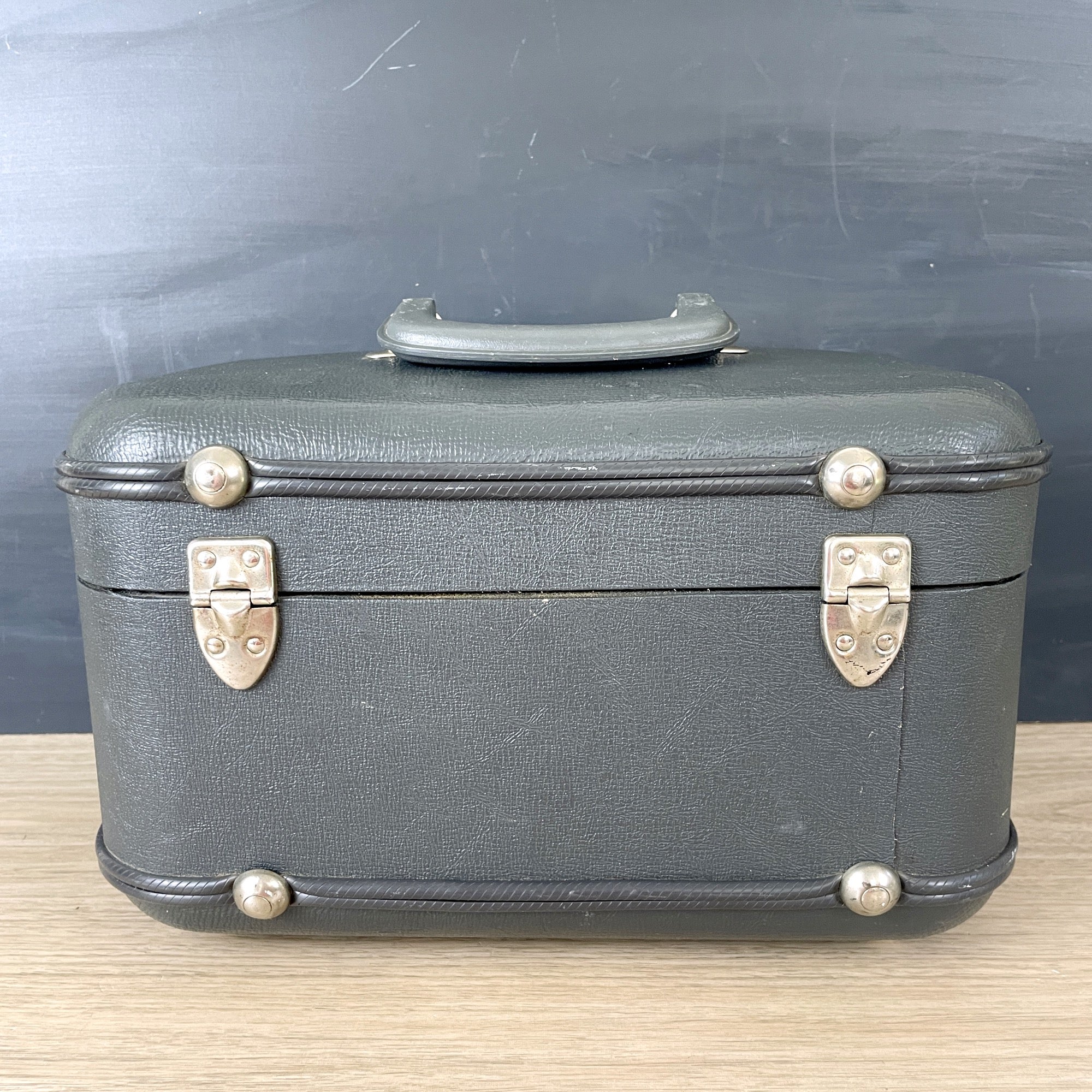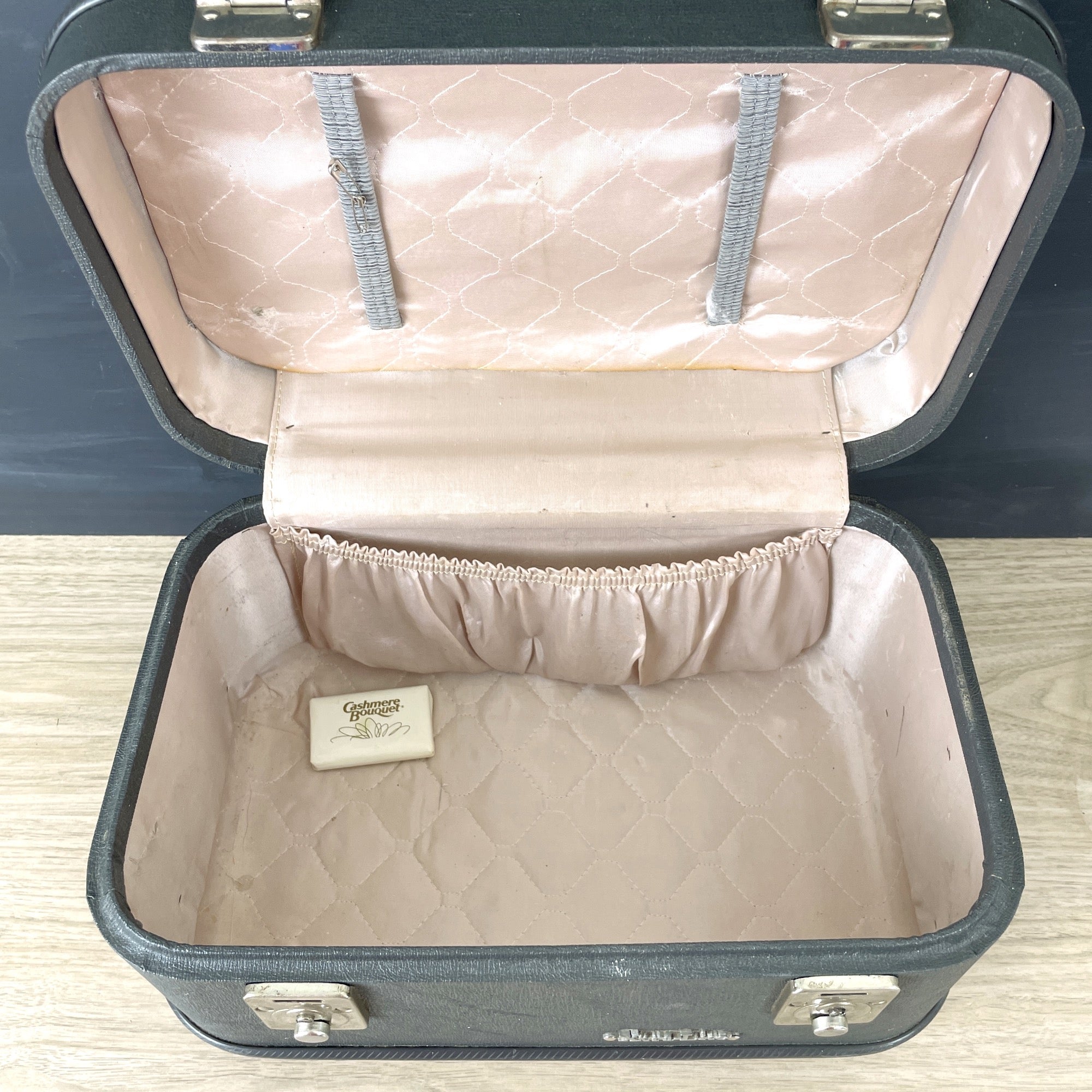 Vintage XtraLite dark gray train case. Hard sided case with rounded edges and silver tone metal hardware. Peach colored quilted lining. Two light grey elasticized straps on the inside of the lid. Two locking closures, but no key. Four metal button feet on the bottom and four on the back to protect the case.