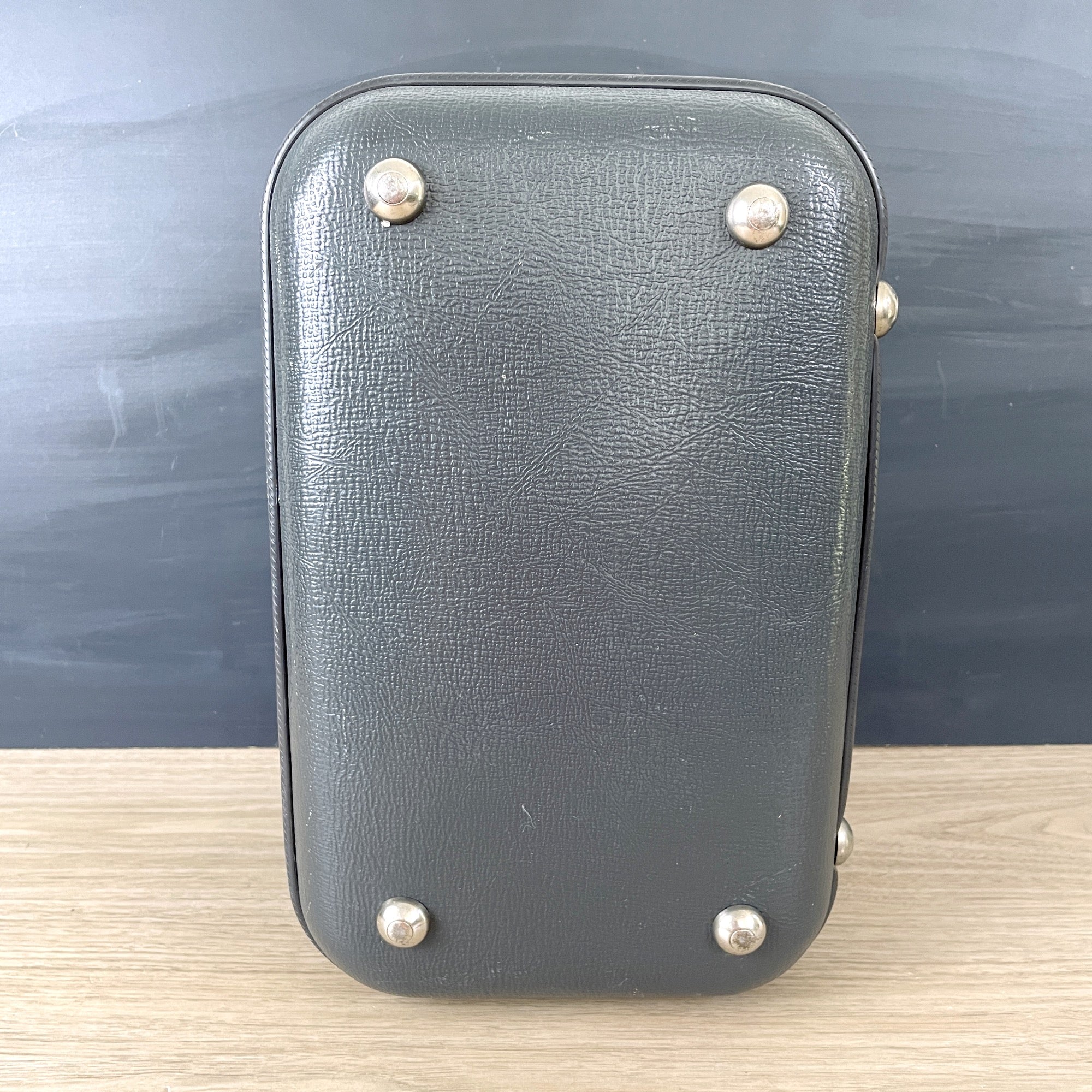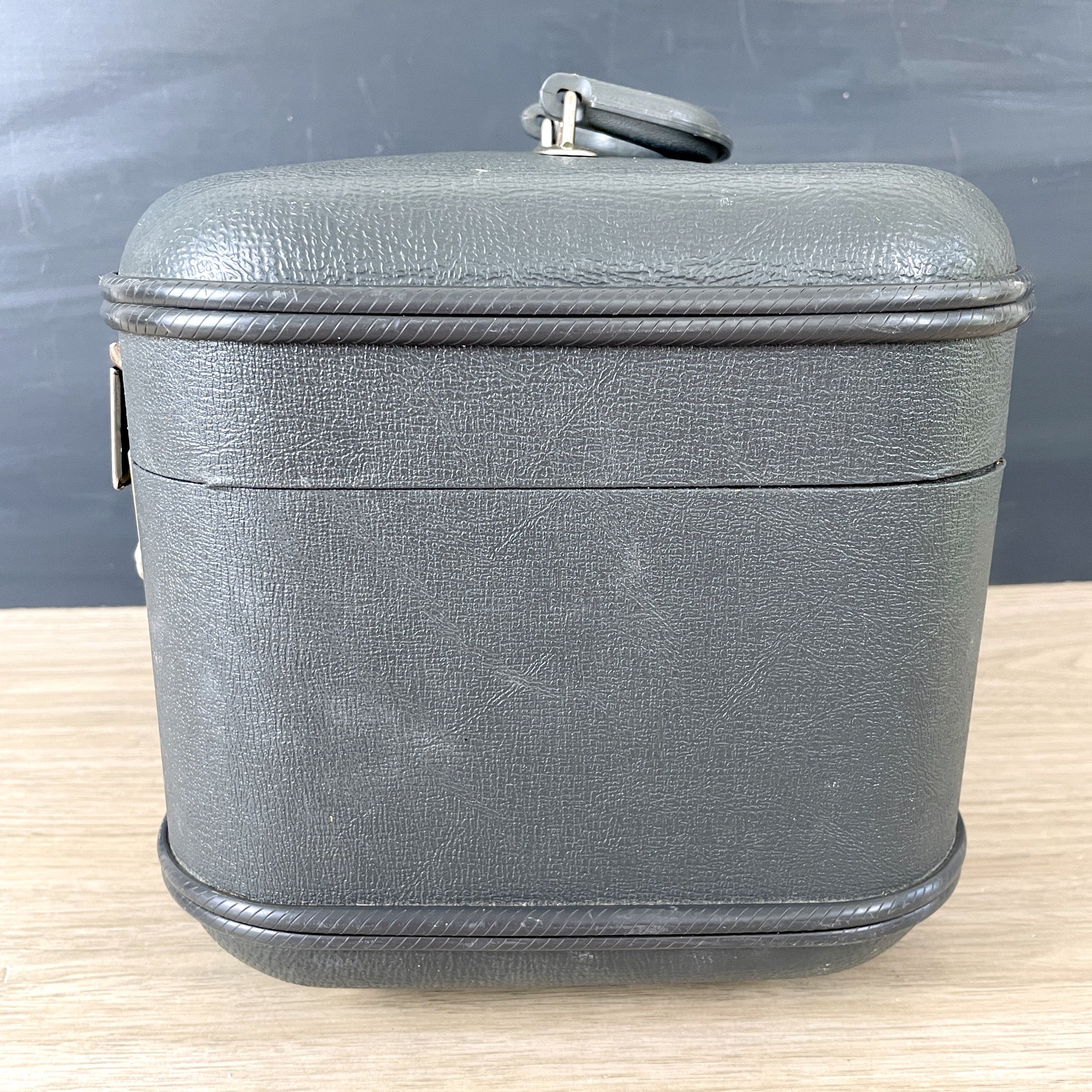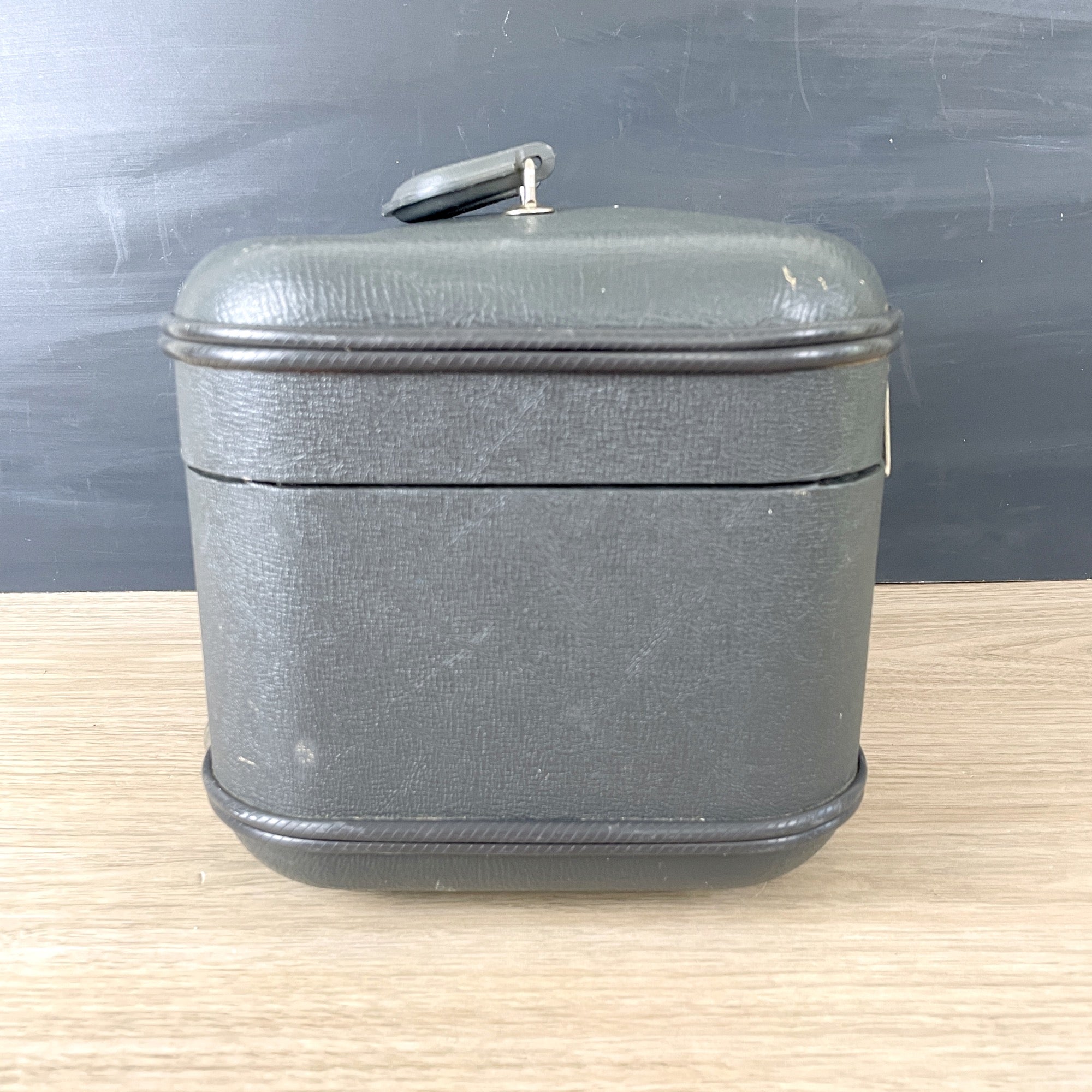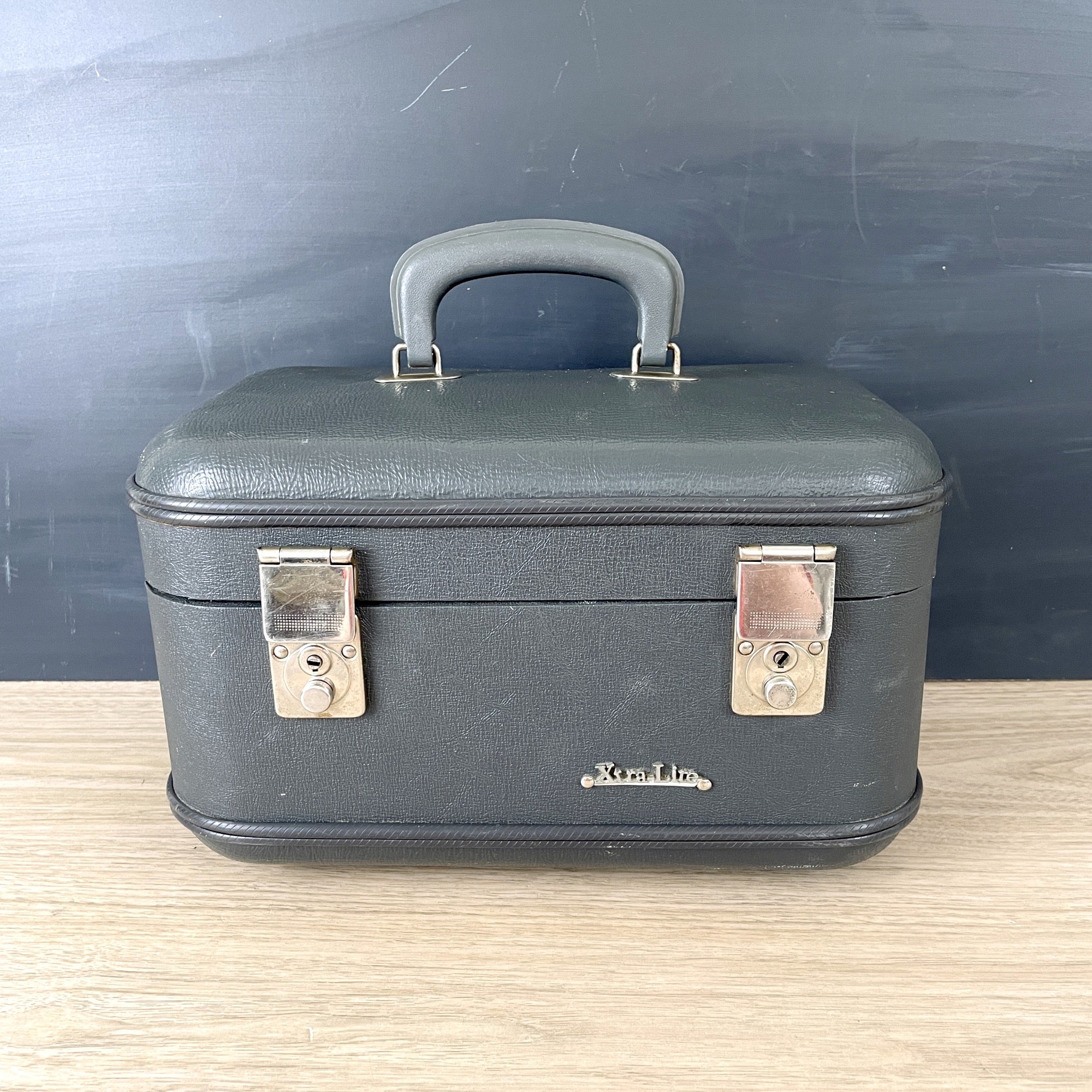 Vintage XtraLite dark gray train case. Hard sided case with rounded edges and silver tone metal hardware. Peach colored quilted lining. Two light grey elasticized straps on the inside of the lid. Two locking closures, but no key. Four metal button feet on the bottom and four on the back to protect the case.