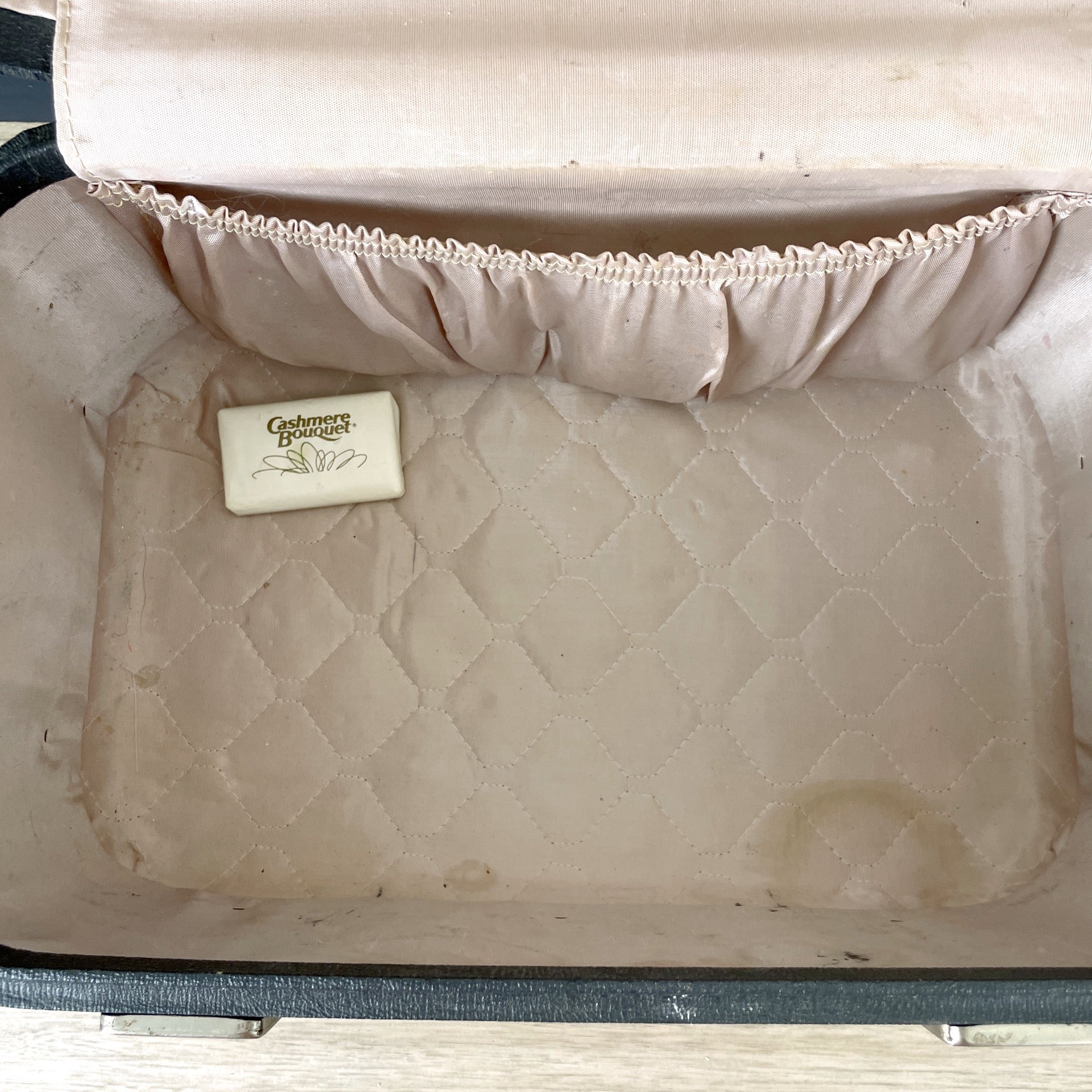 CONDITION Good. This case has had a life well traveled. It has scuffs and stains and scratches, but is structurally sound. The lining has some small tears and stains, but smells nice as a hotel-size bar of Cashmere Bouquet complexion soap has been living inside. The closures work well.