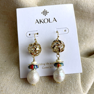 New Akola drop pierced earrings with large baroque pearls, glass trade beads and an open goldtone sphere at the top. Ear hooks have plastic stoppers. Elegant enough to wear for a special occasion, bohemian enough to wear with jeans.