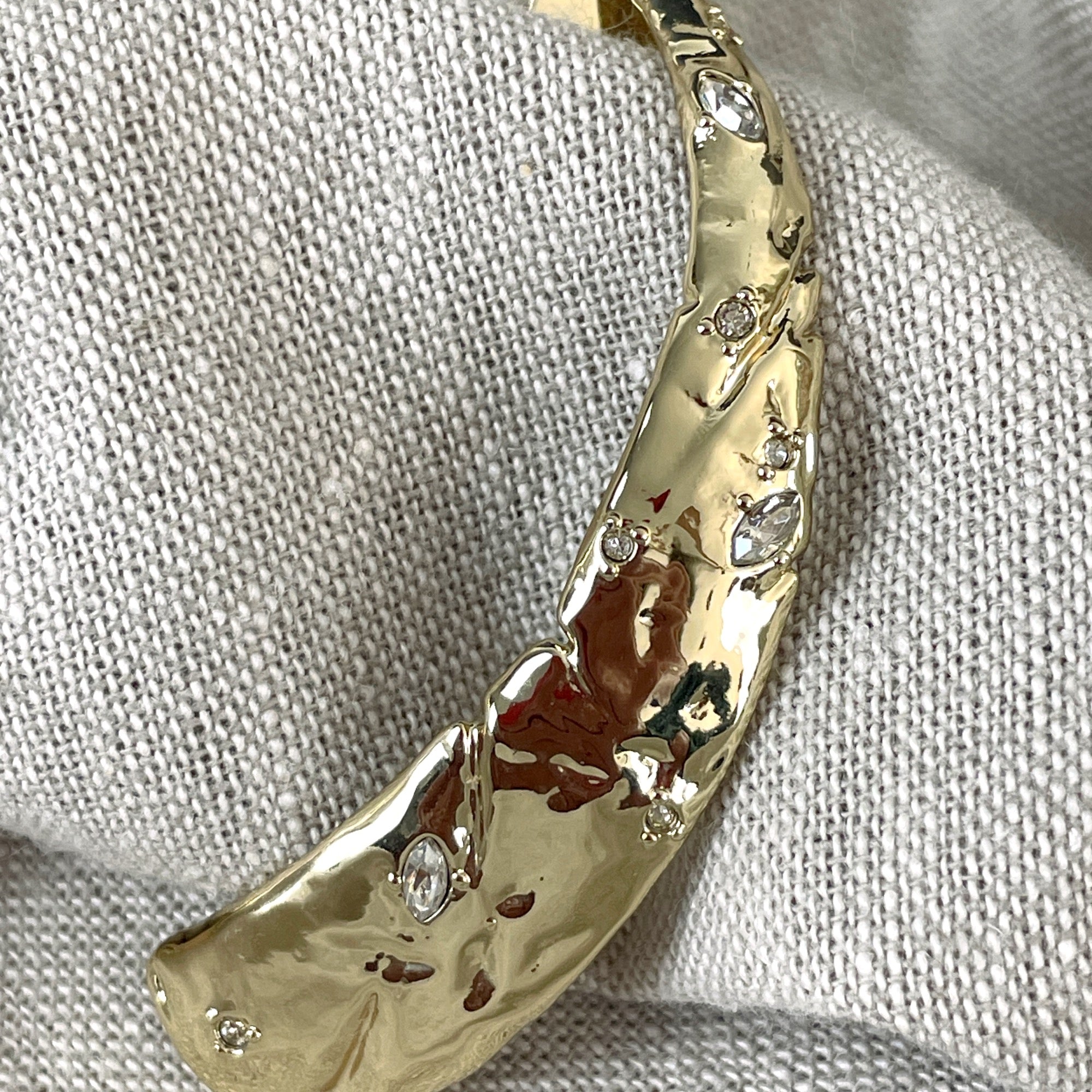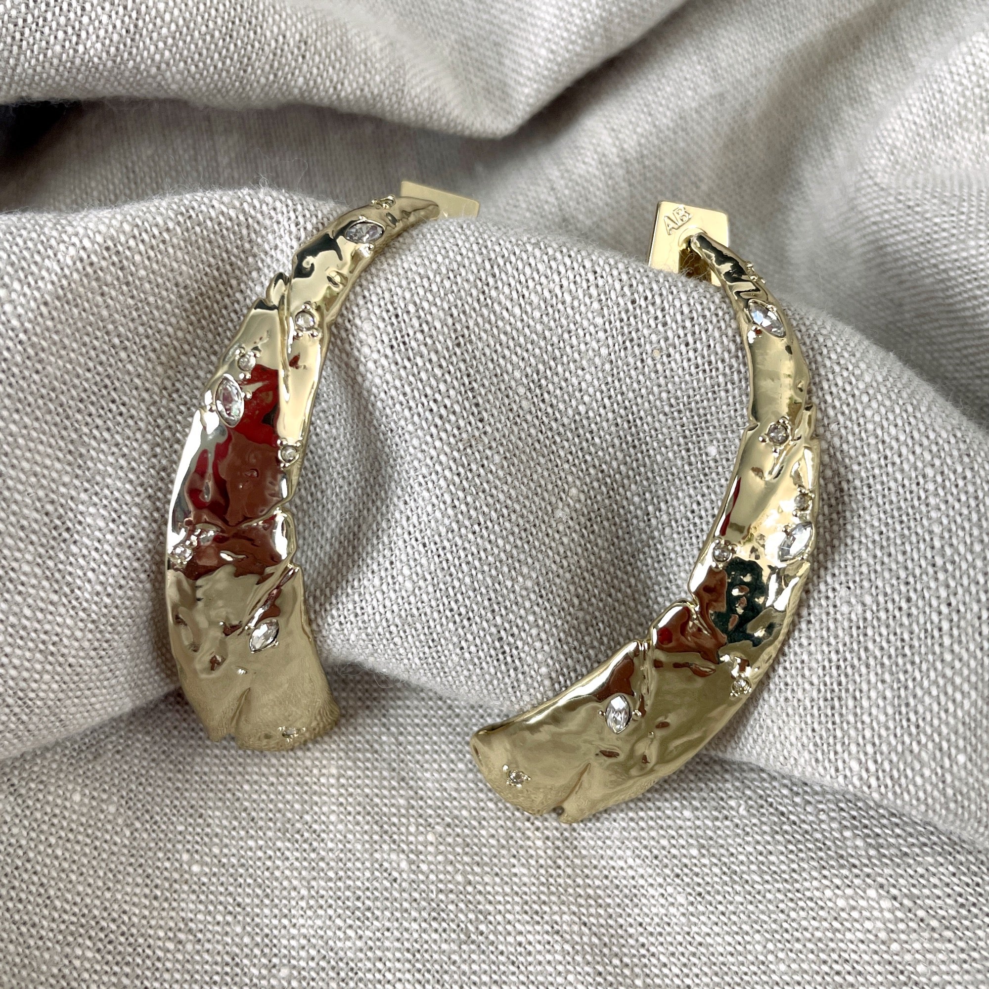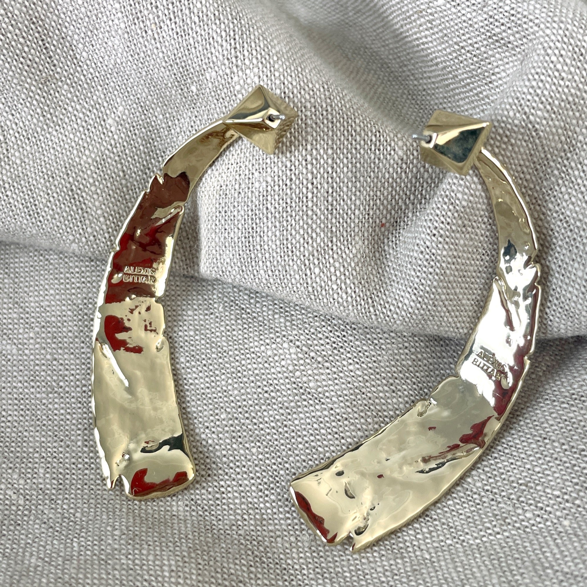 Alexis Bittar post pierced long curved blade earrings. Molten gold with clear round and oval crystals set along the length. The back of this is marked ALEXIS BITTAR. Sturdy pyramid shaped backings marked with AB. Original retail $155.