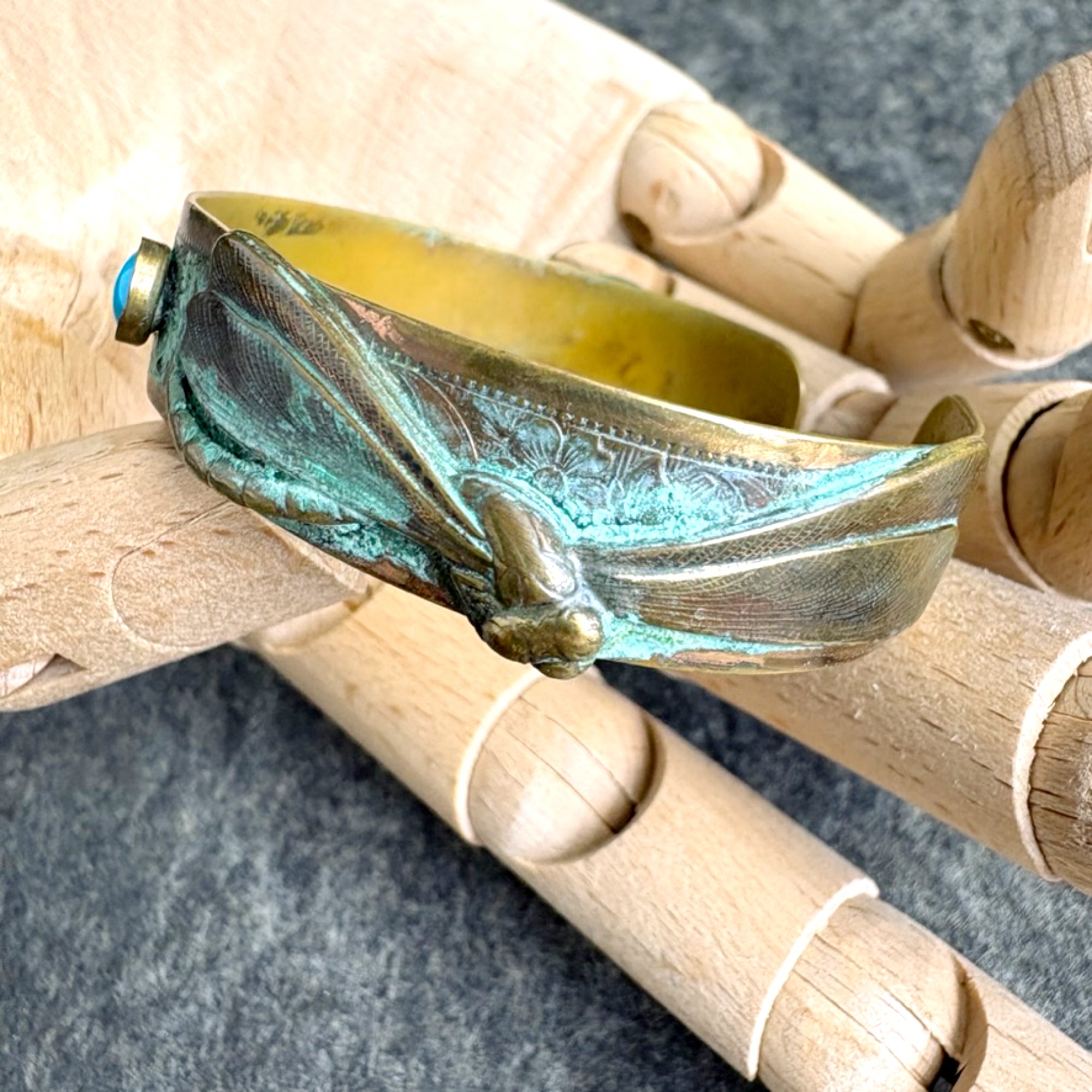 Elaine Coyne cuff bracelet in her signature verdigris patina. A pair of dragonflies accented with a turquoise cabochon between them. Exquisite nature jewelry. Signed.