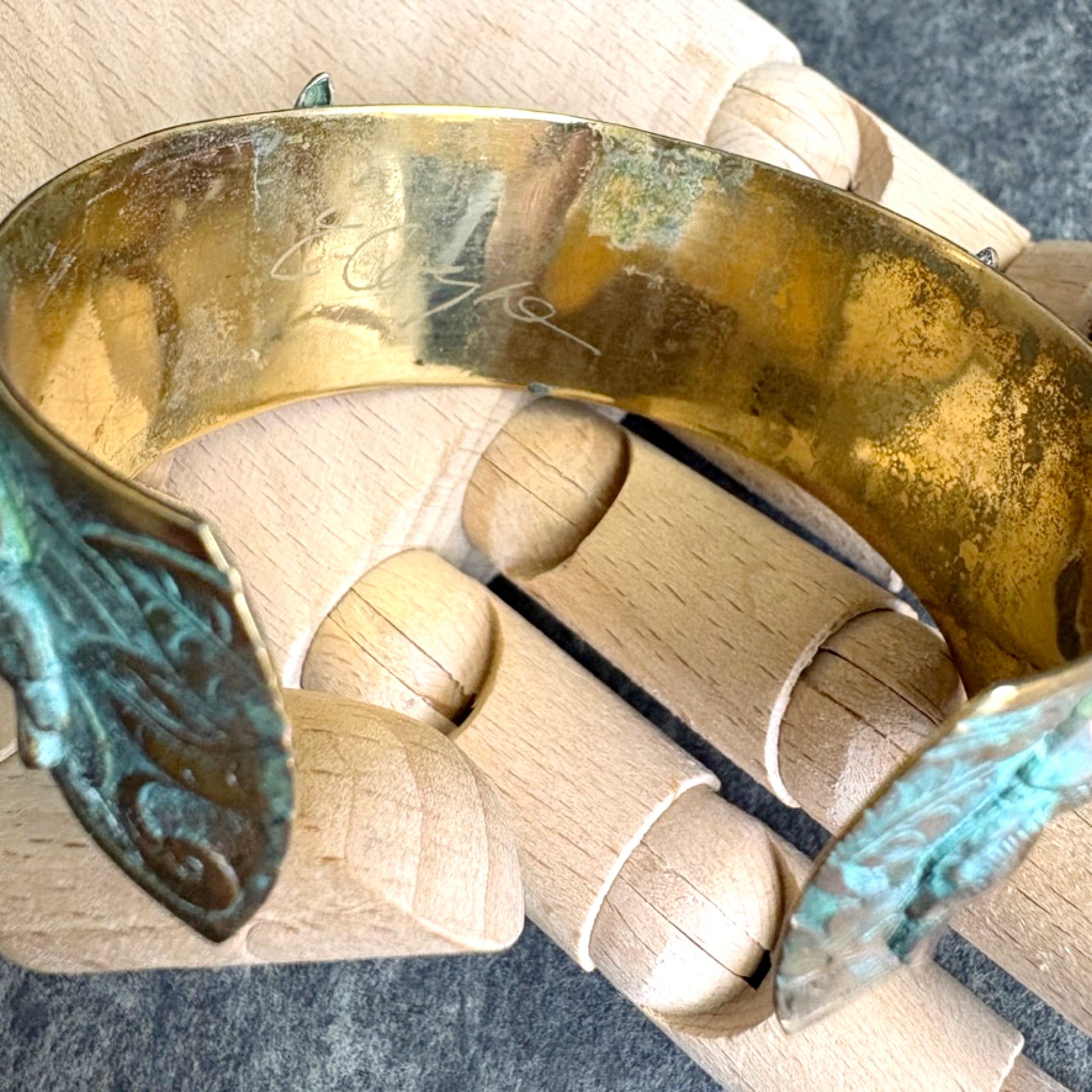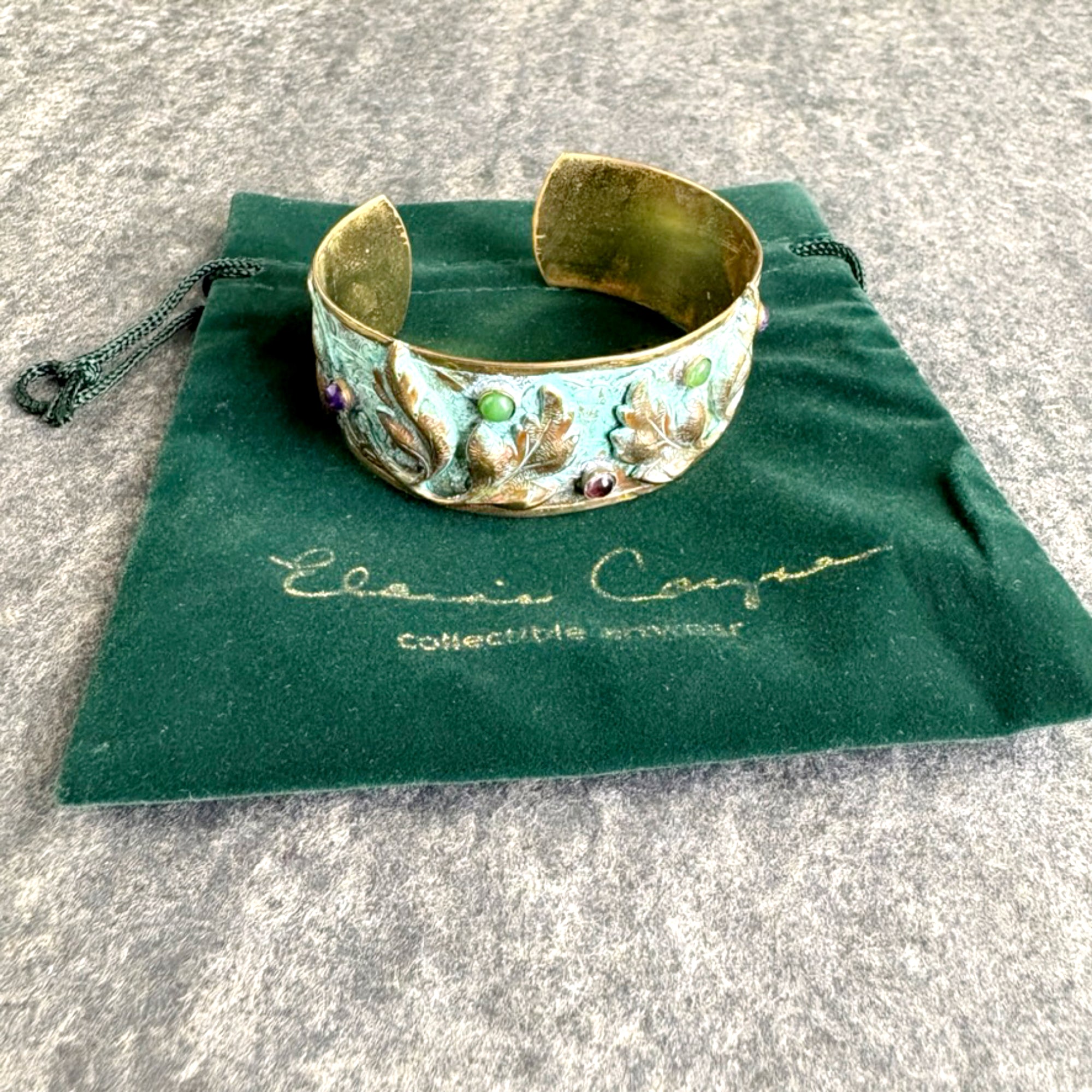 Elaine Coyne cuff bracelet in her signature verdigris patina. Elaborately detailed leaf pattern accented with amethyst and jade cabochons. Comes with original storage drawstring pouch. Signed.