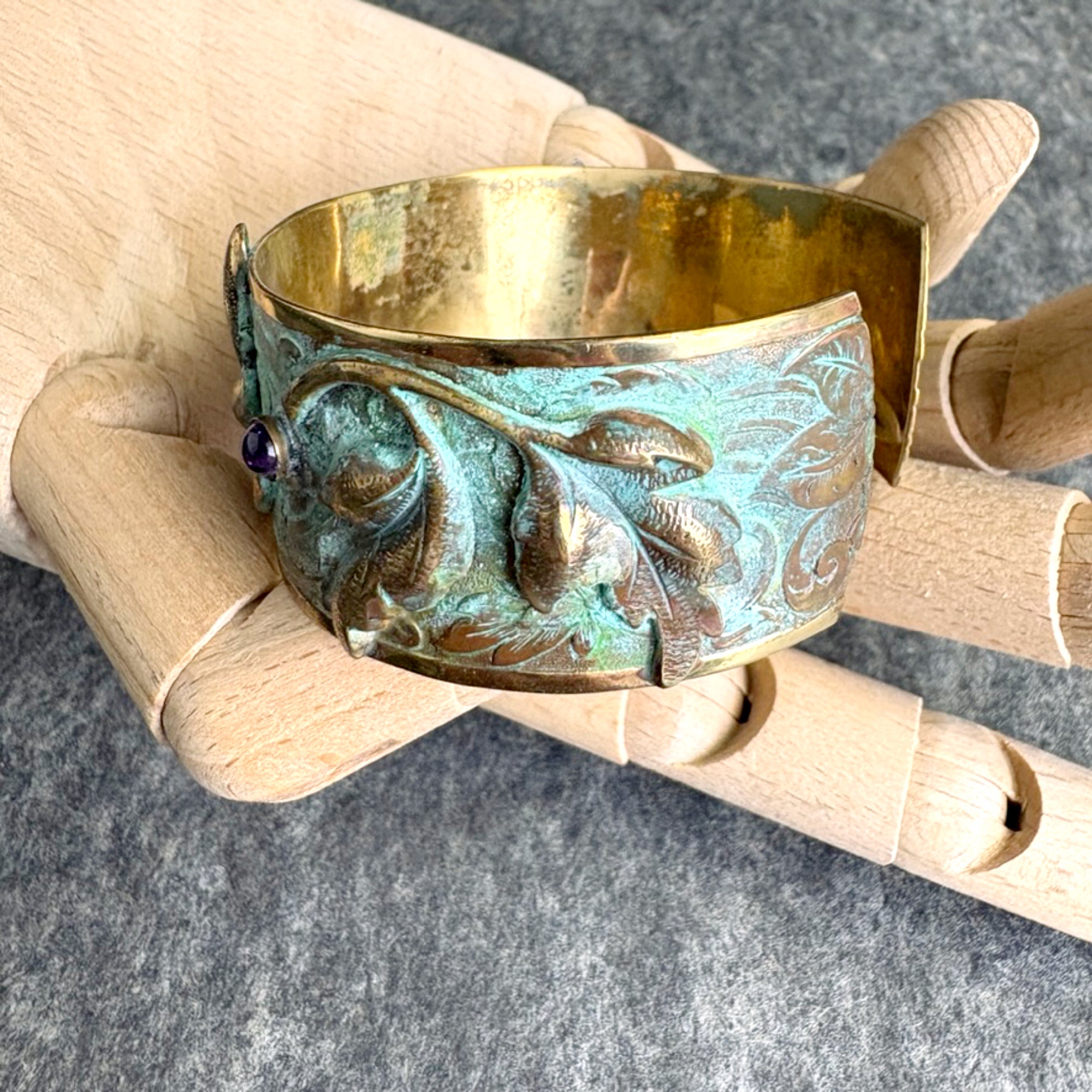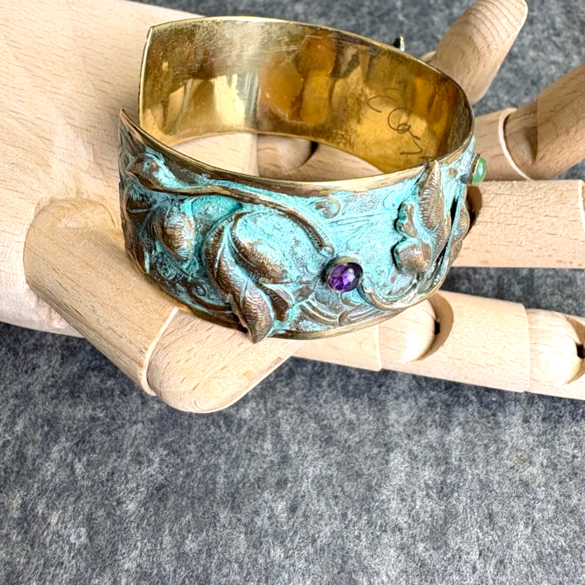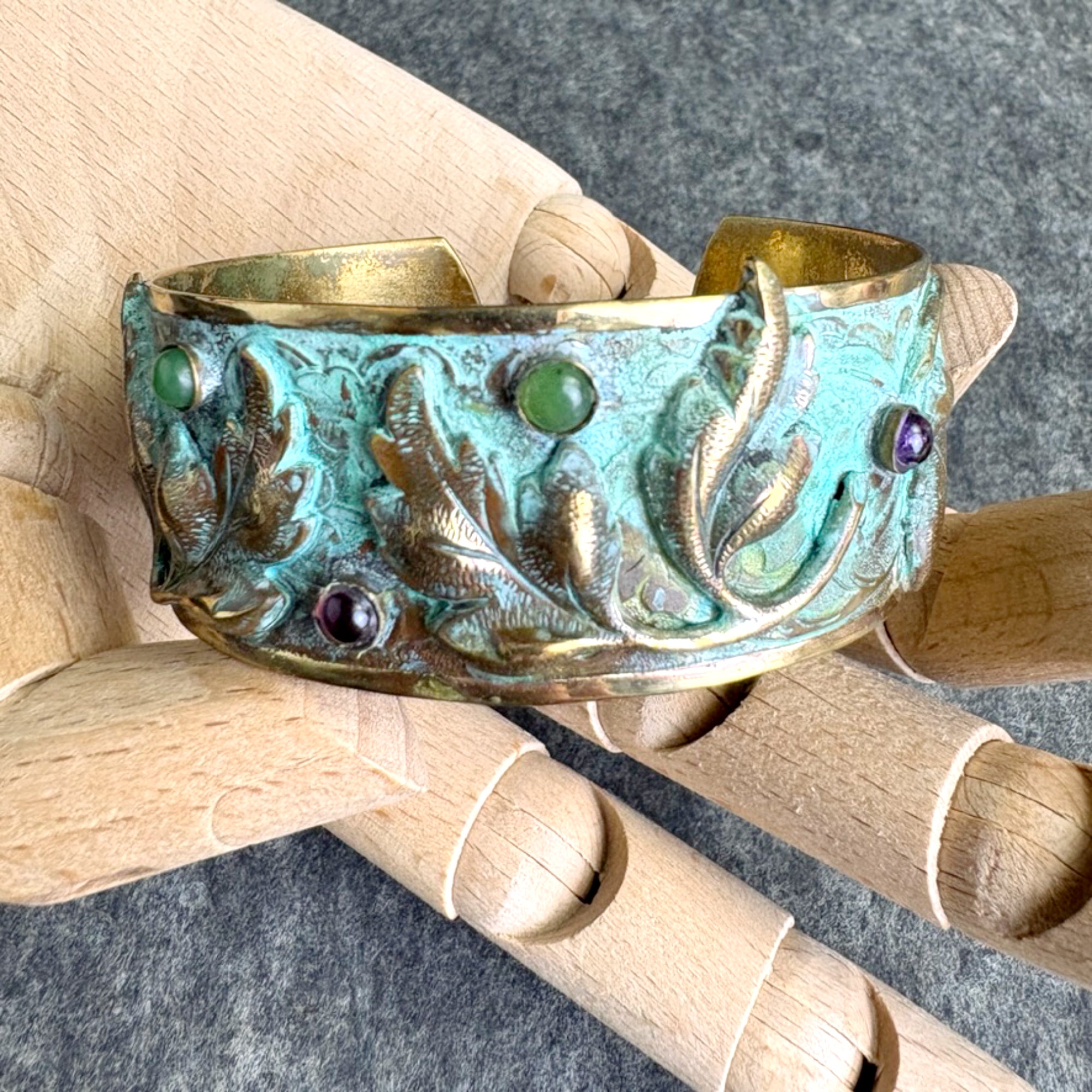 Elaine Coyne verdigris leaf, amethyst and jade cuff bracelet