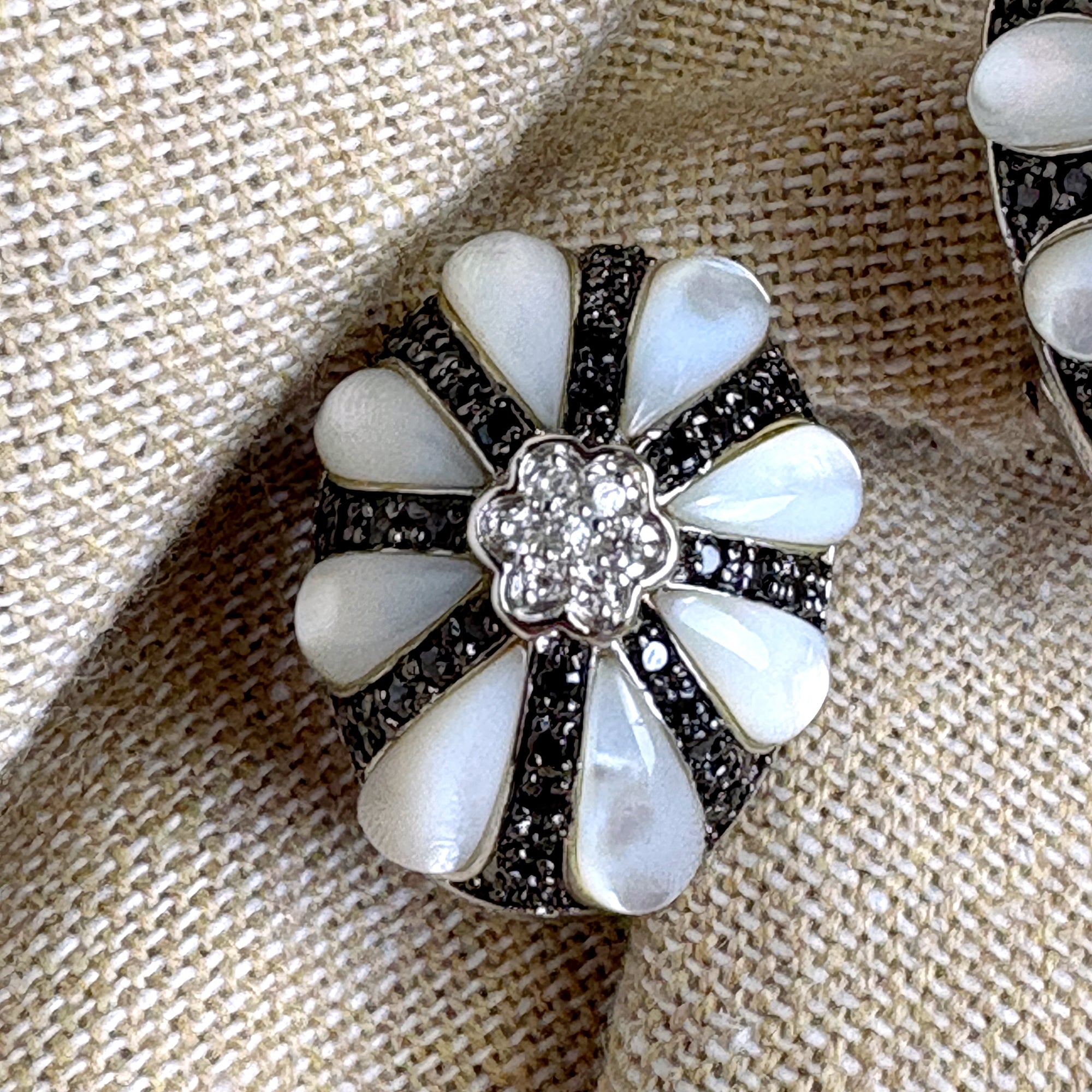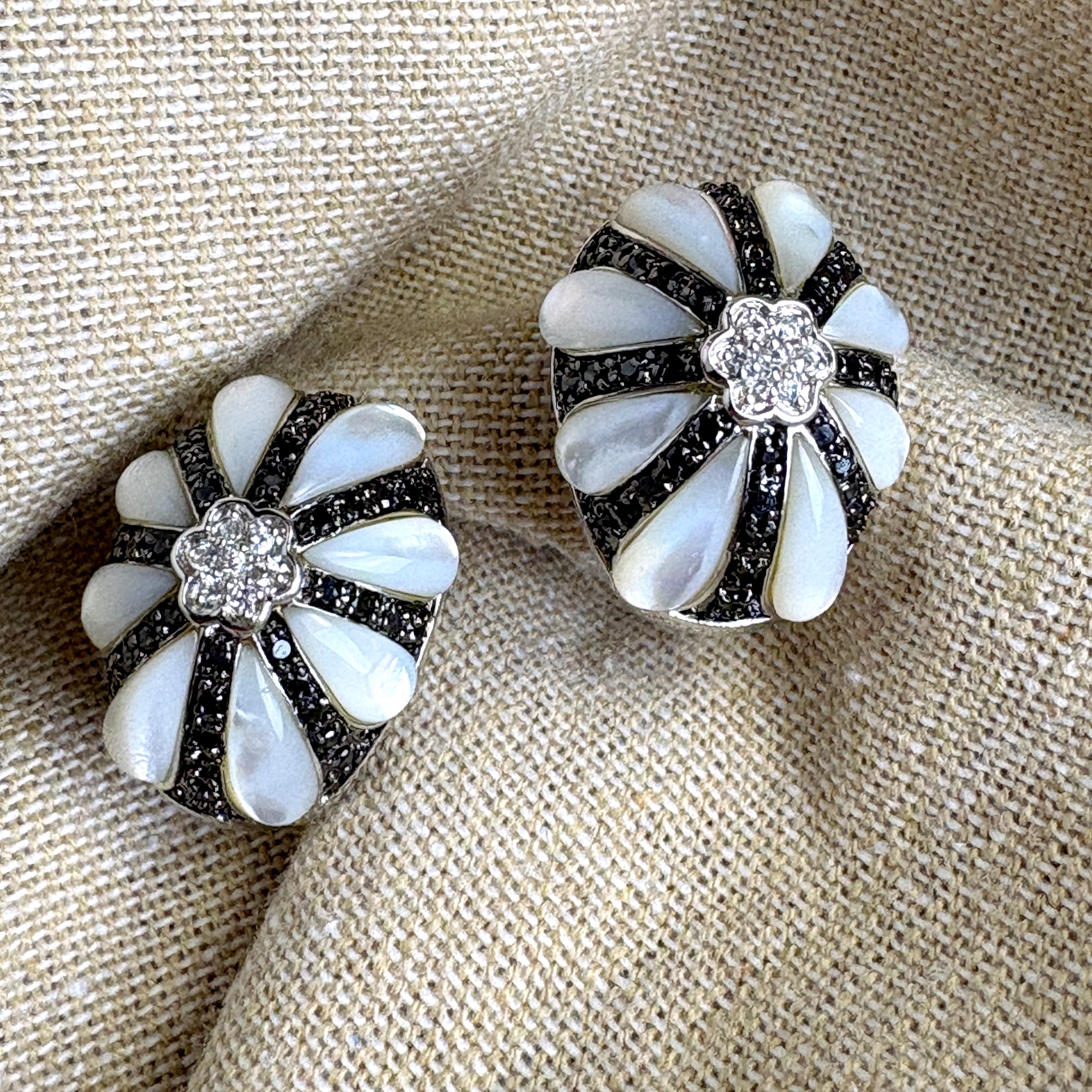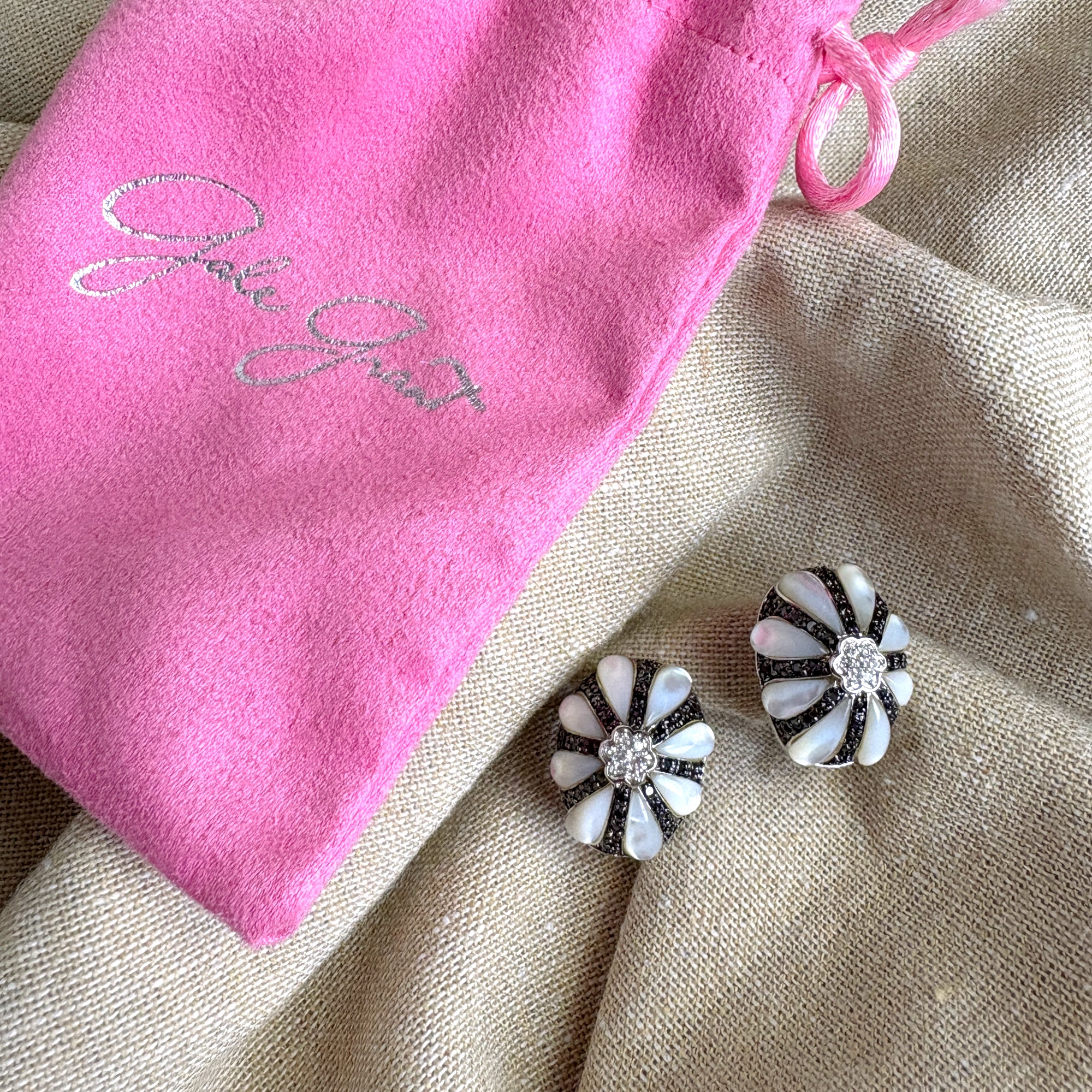 Gale Grant costume jewelry post clip pierced earrings. A center cluster of small cubic zirconia with 8 opalescent resin teardrops radiating out like petals of a flower. Comes with a pink Gale Grant drawstring bag. From the NYC Madison Ave flagship store.