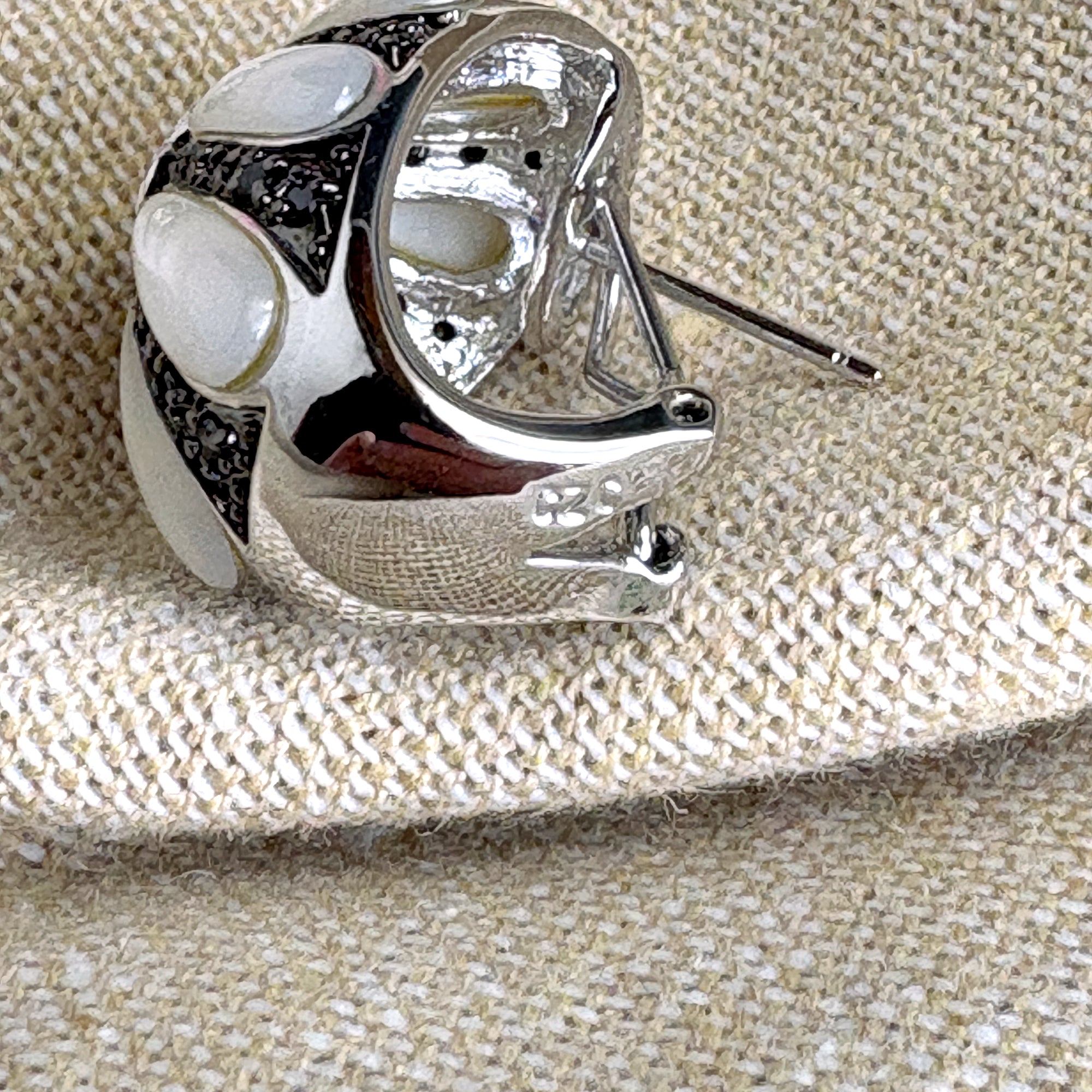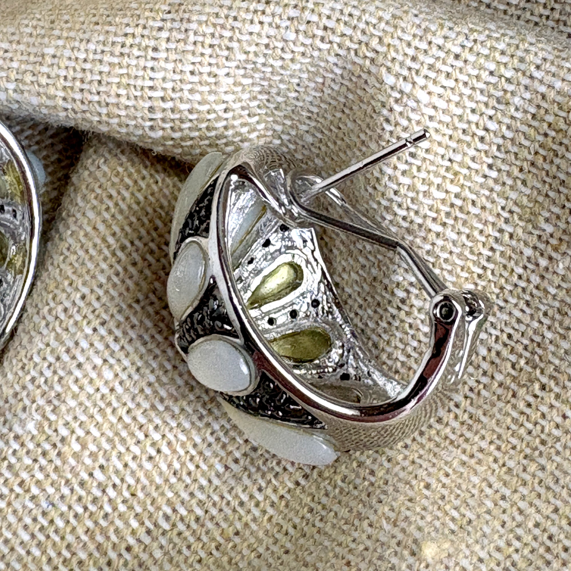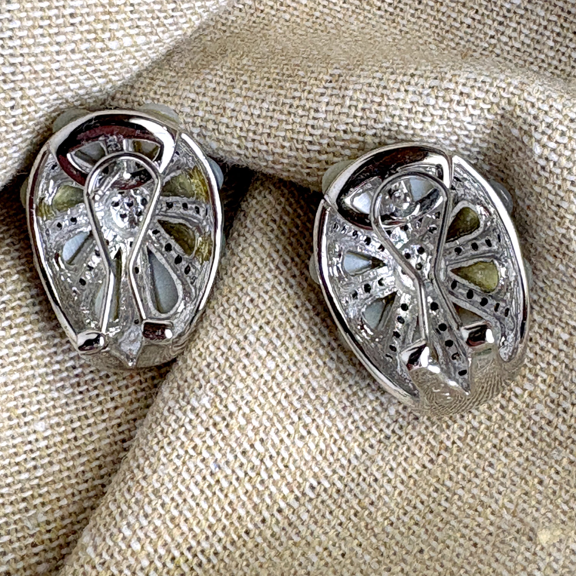 Gale Grant costume jewelry post clip pierced earrings. A center cluster of small cubic zirconia with 8 opalescent resin teardrops radiating out like petals of a flower. Comes with a pink Gale Grant drawstring bag. From the NYC Madison Ave flagship store.